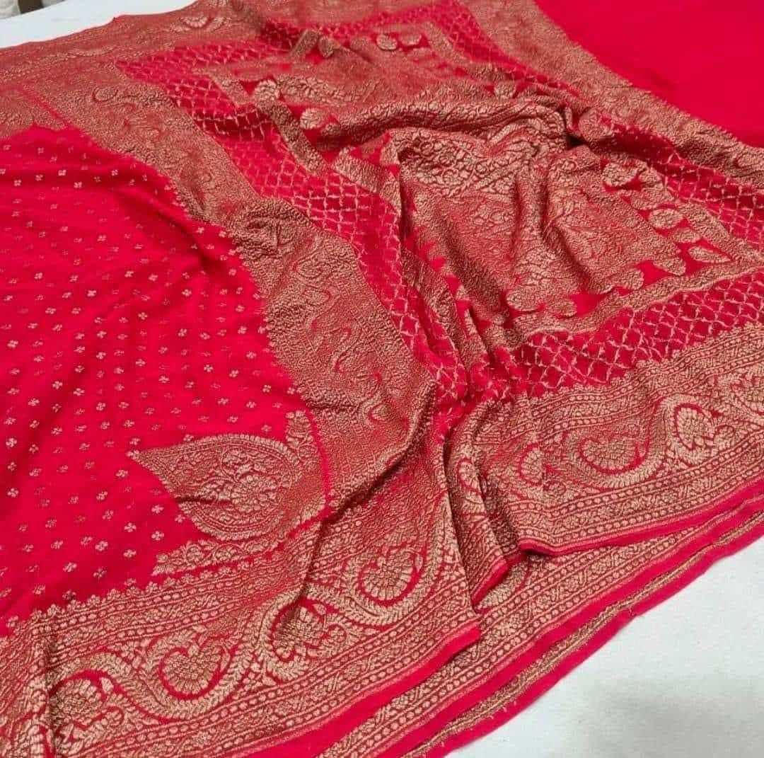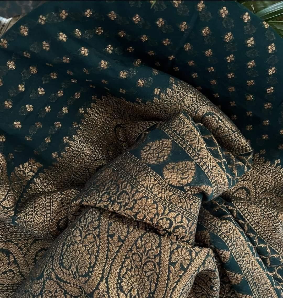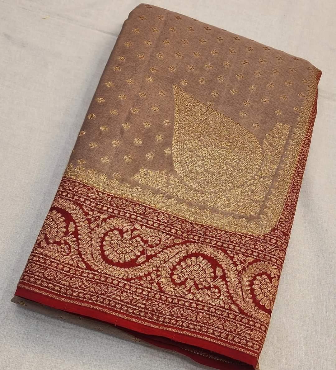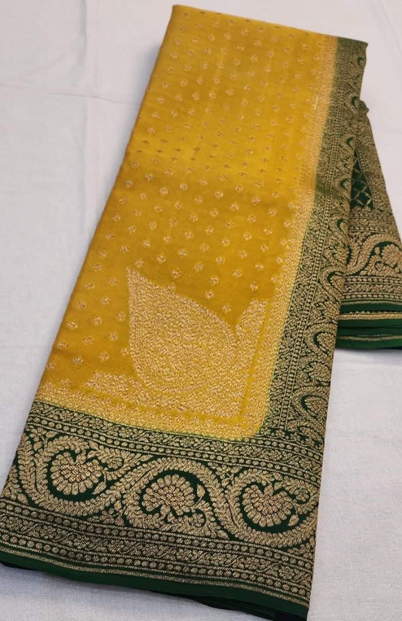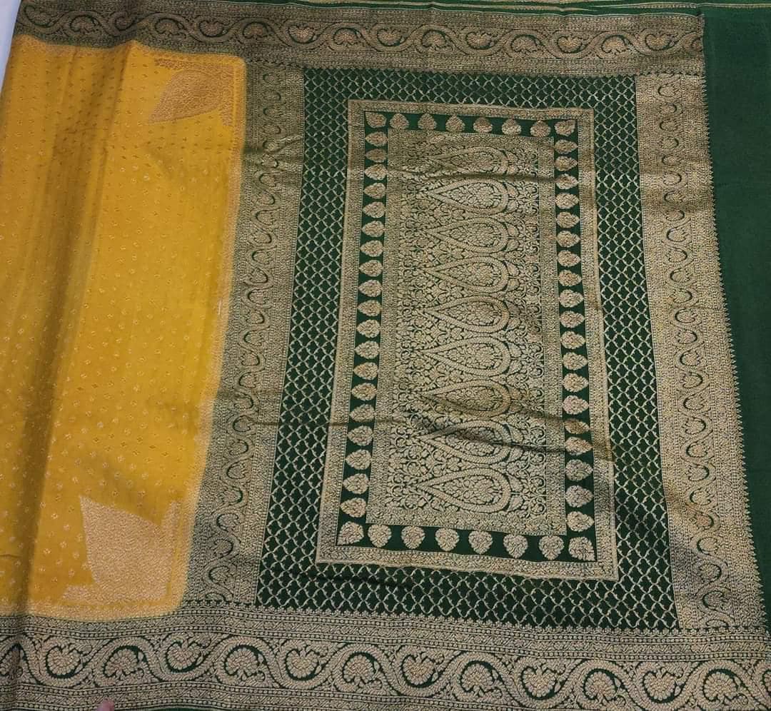 Experience the luxury of khaddi georgette chiffon, adorned with exquisite handloom prints and a stunning organic banaras silk weave. This saree is a perfect fusion of heritage and contemporary elegance, making it ideal for weddings, festive occasions, and grand celebrations. A timeless masterpiece for your ethnic collection!