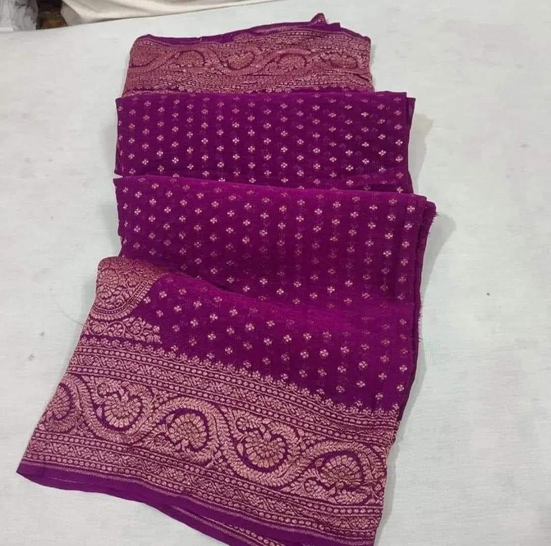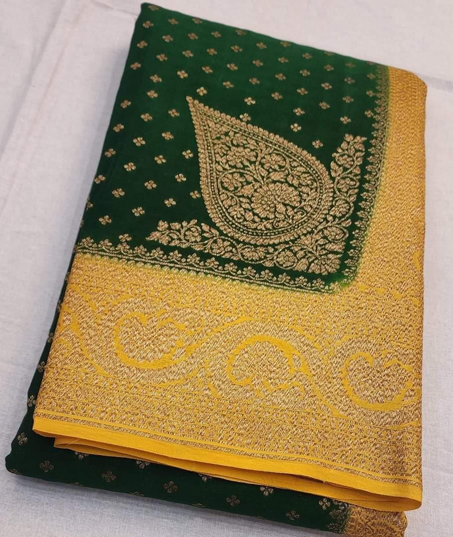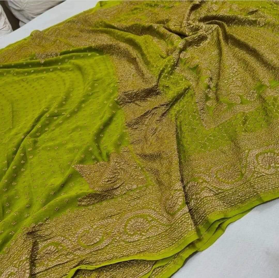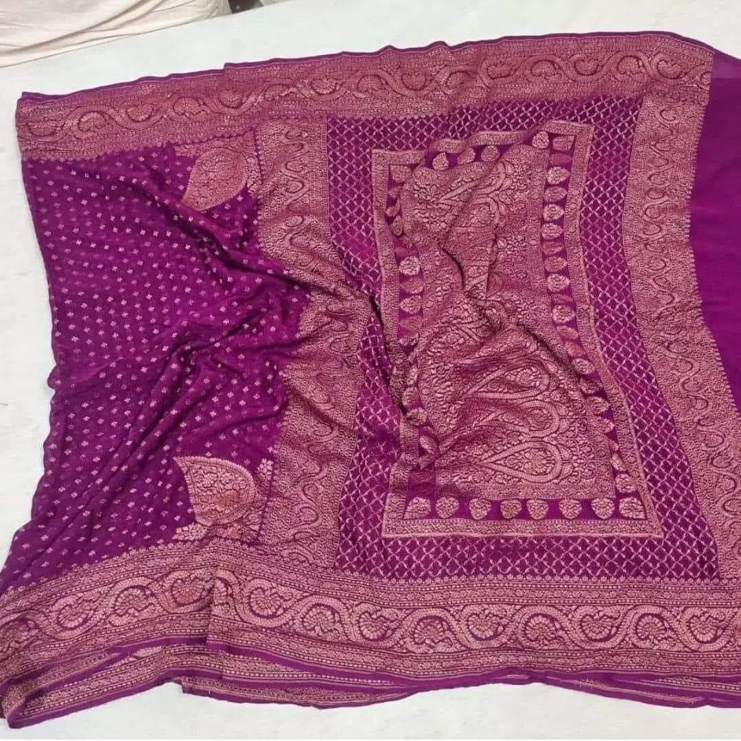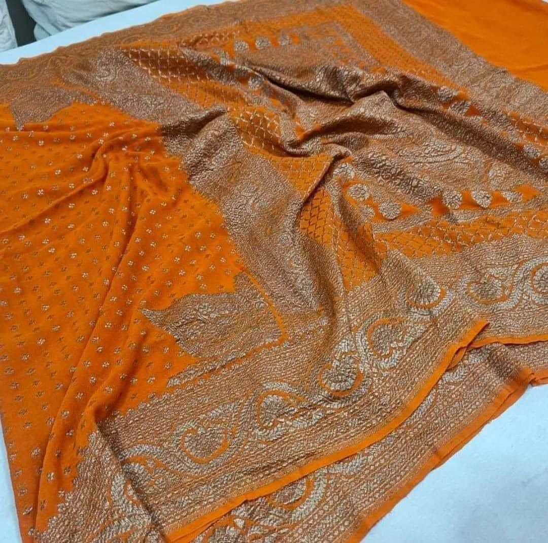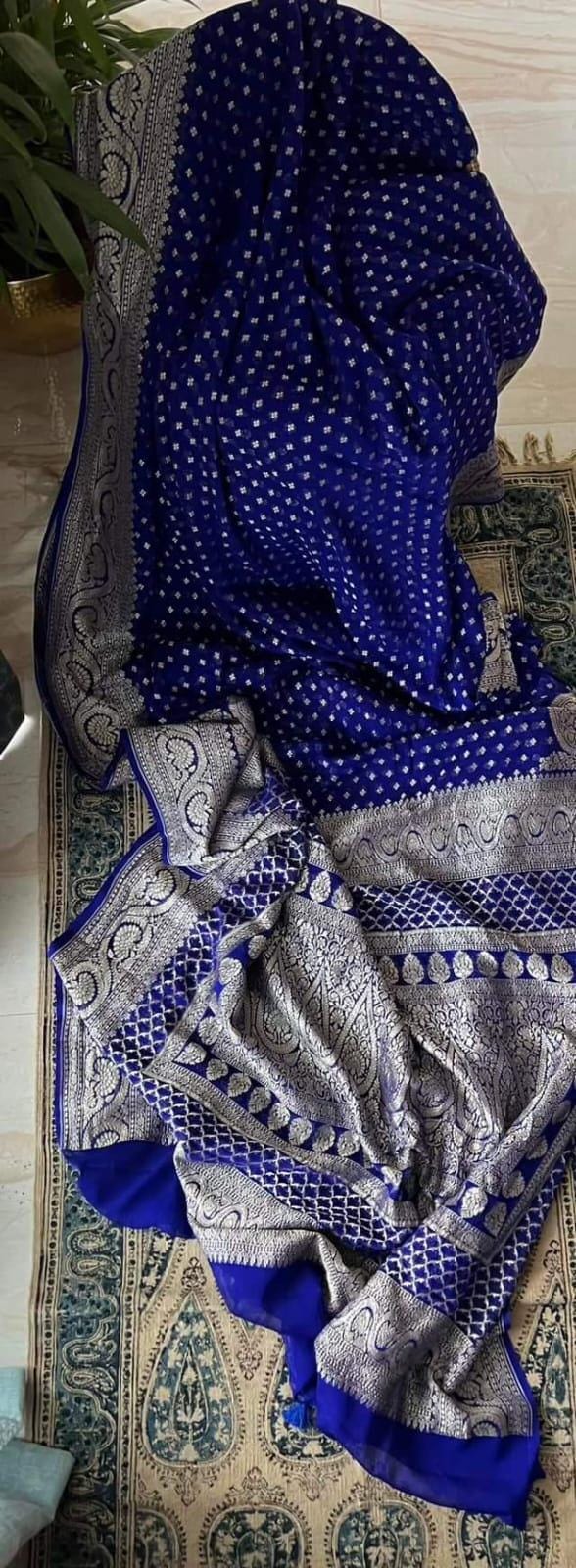 Experience the luxury of khaddi georgette chiffon, adorned with exquisite handloom prints and a stunning organic banaras silk weave. This saree is a perfect fusion of heritage and contemporary elegance, making it ideal for weddings, festive occasions, and grand celebrations. A timeless masterpiece for your ethnic collection!