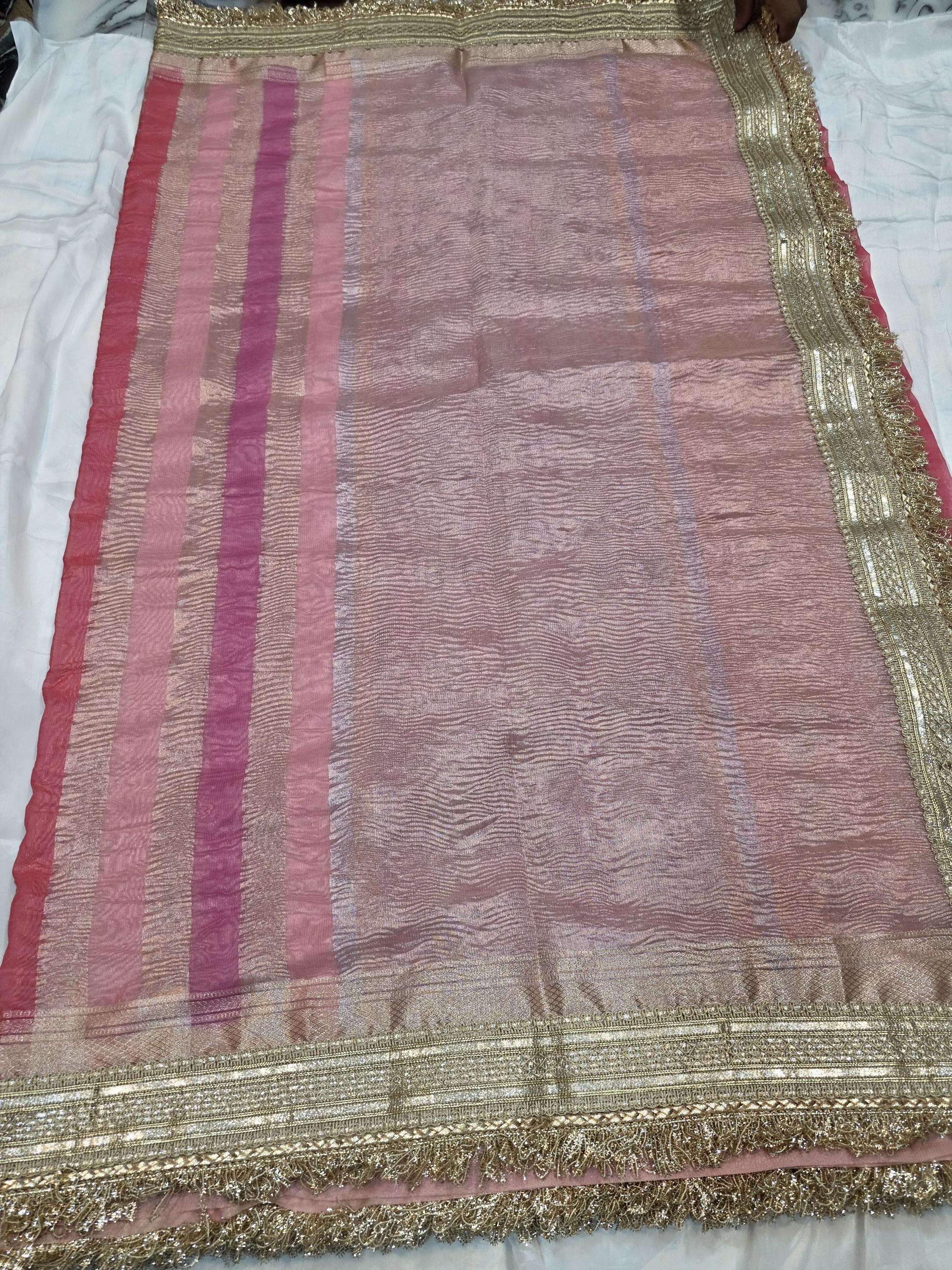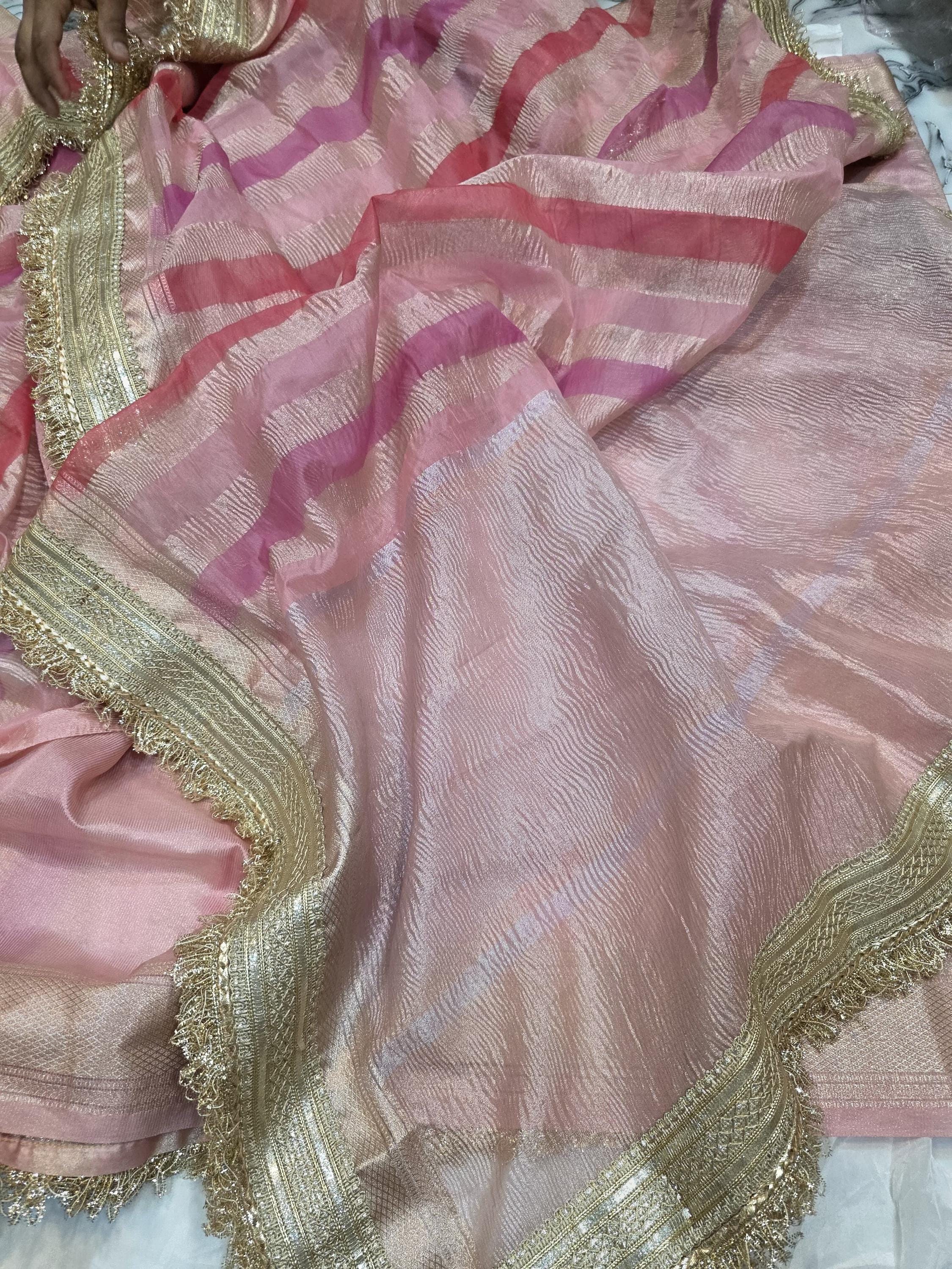 Experience the luxury of khaddi katan tissue Silk, adorned with exquisite handloom prints and a stunning organic banaras silk weave. This saree is a perfect fusion of heritage and contemporary elegance, making it ideal for weddings, festive occasions, and grand celebrations. A timeless masterpiece for your ethnic collection!