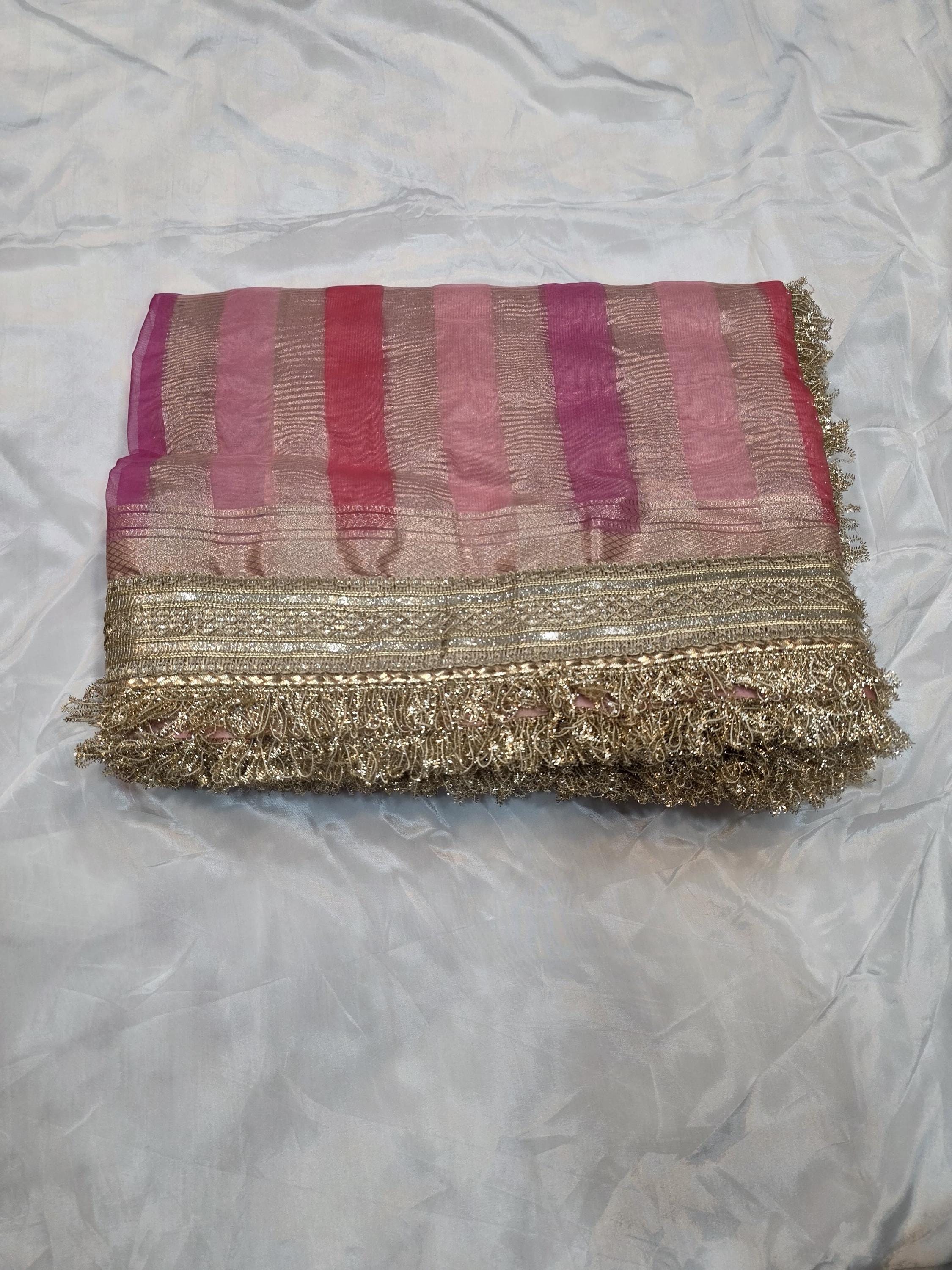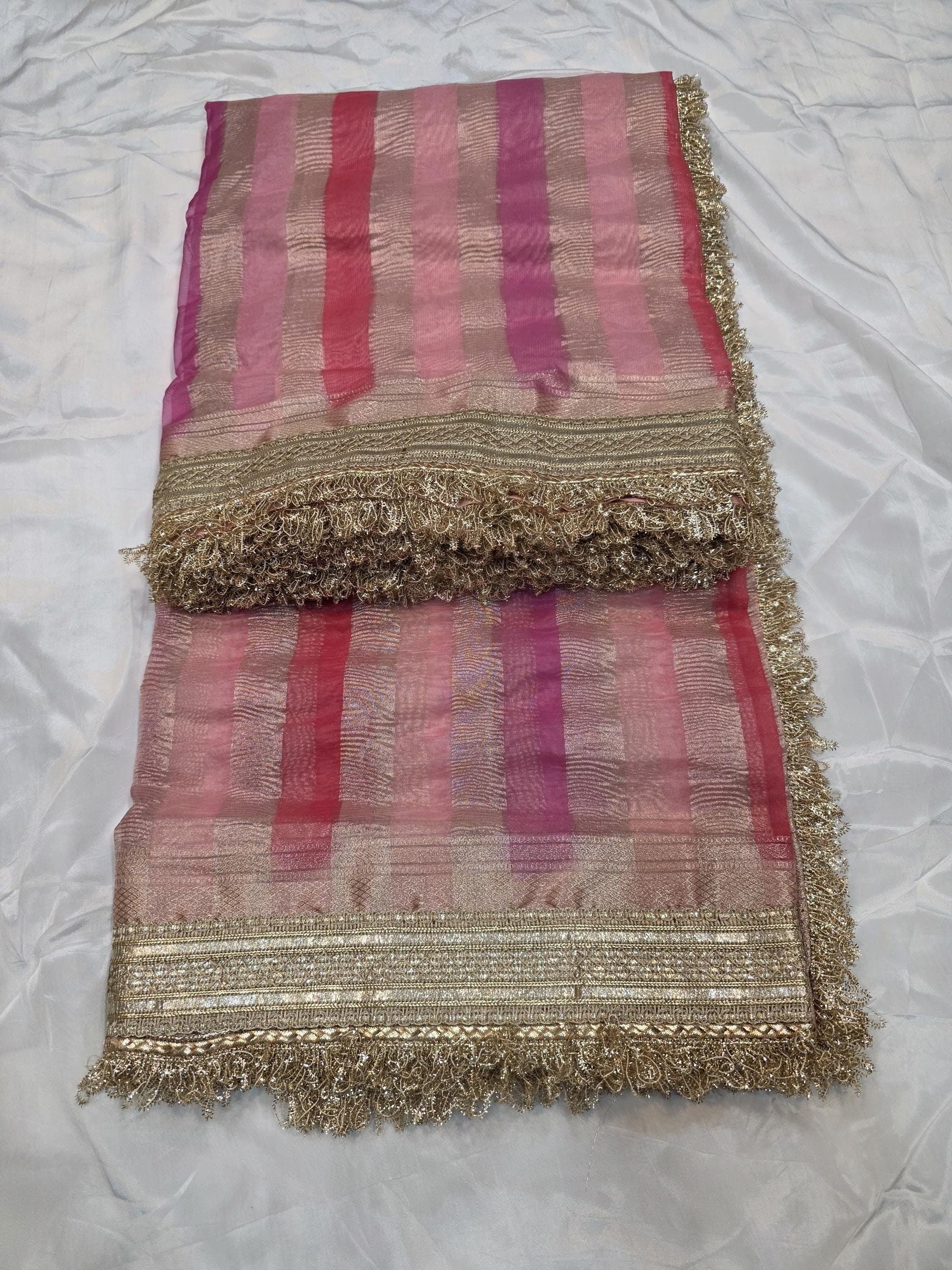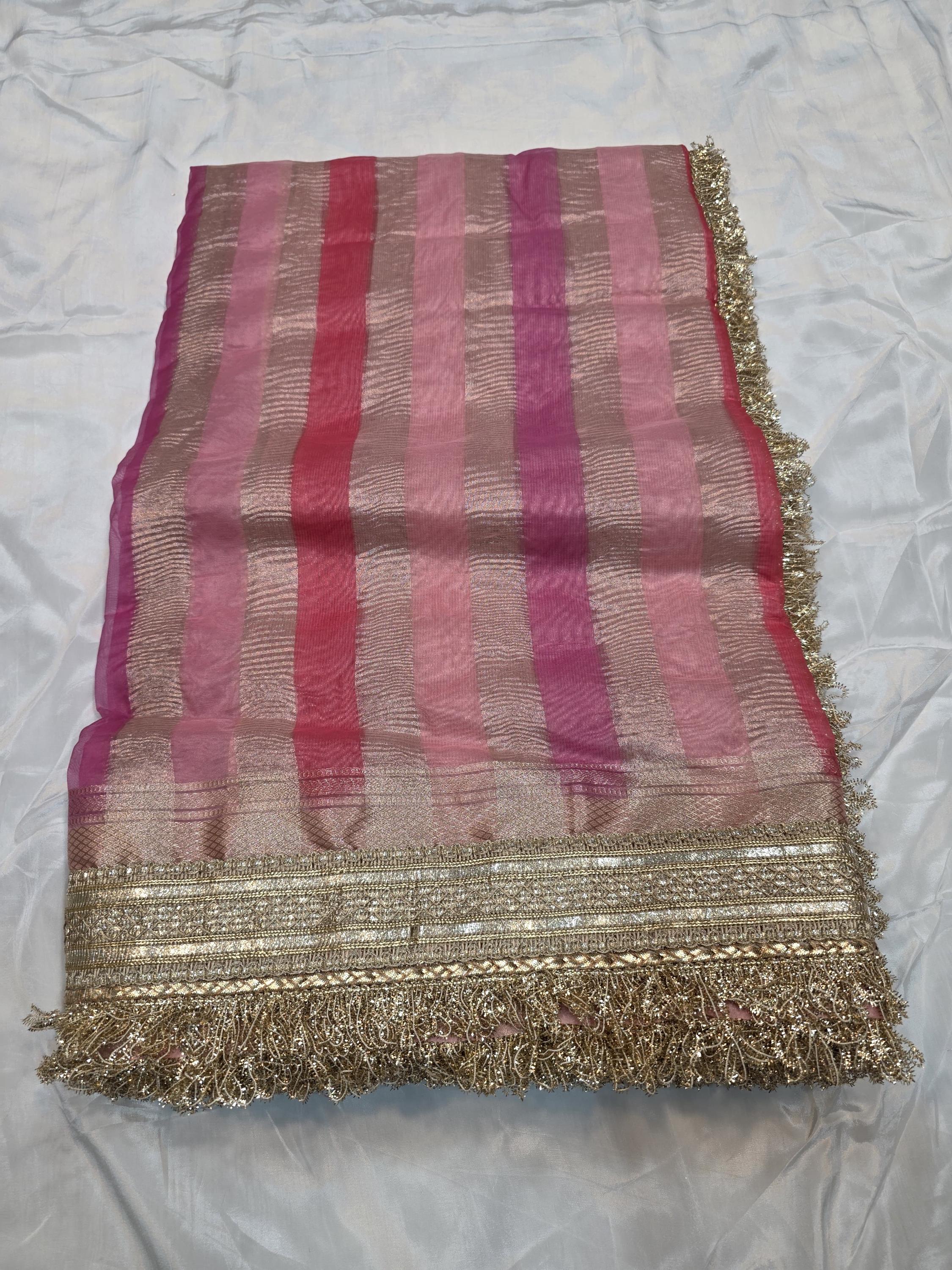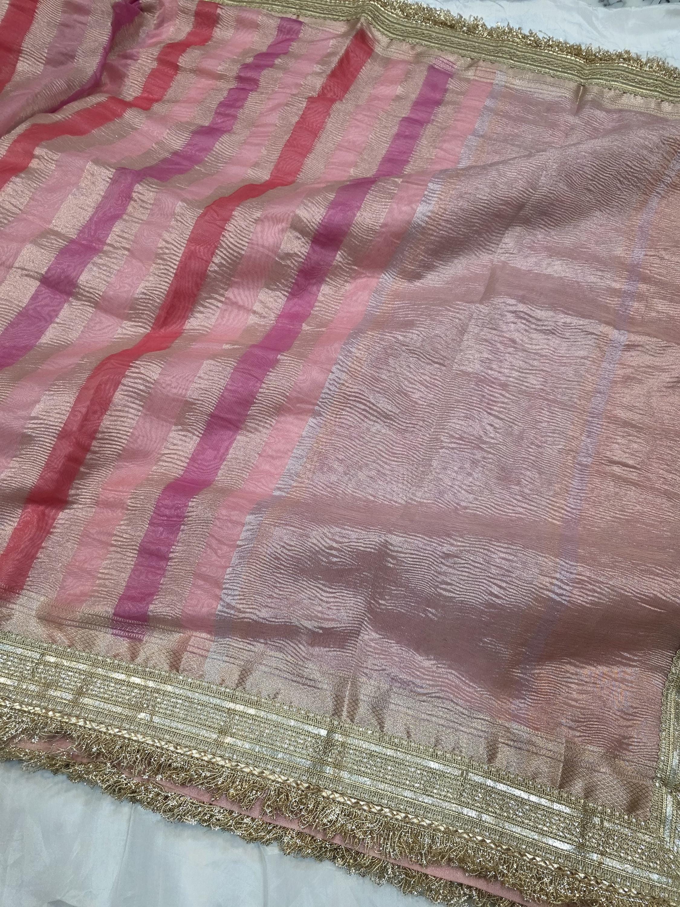Enchanting Custom Handloomed Kora Tissue Striped Rangkat Saree, Delicate Lace Festive Sari Masterpiece