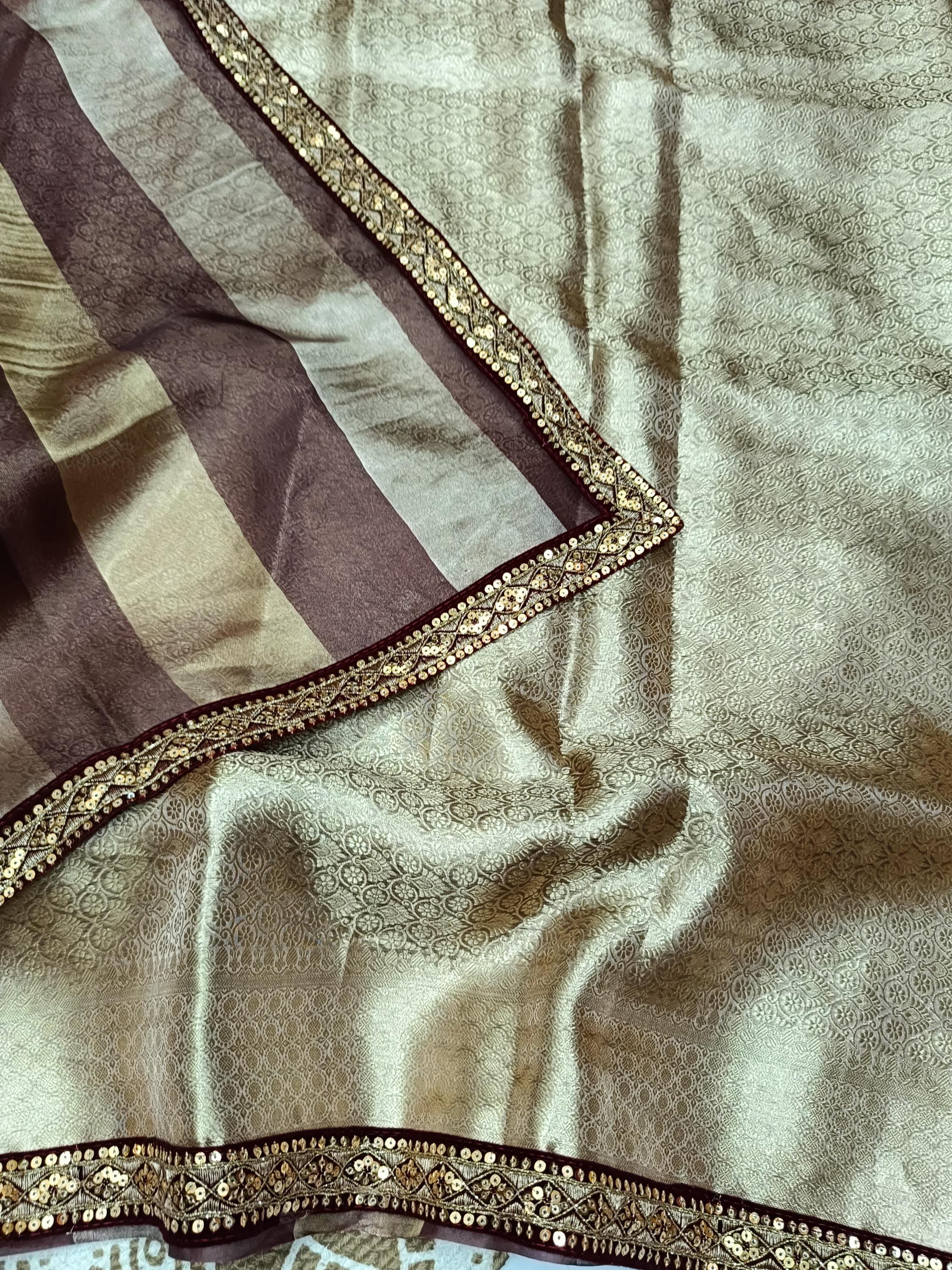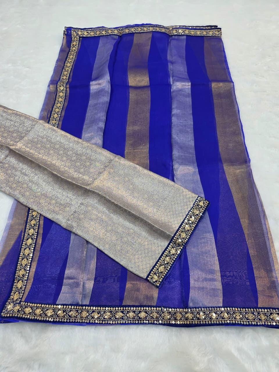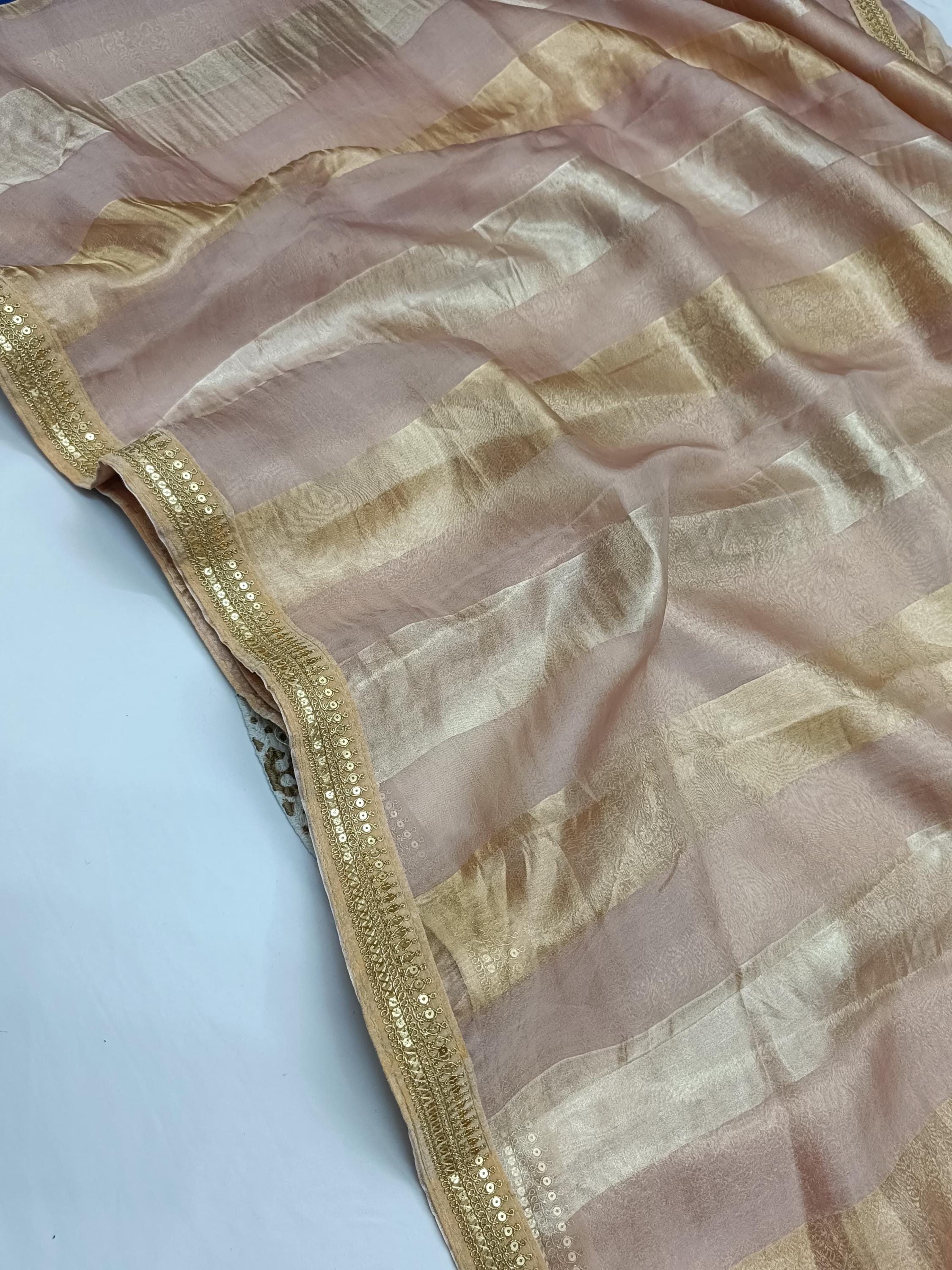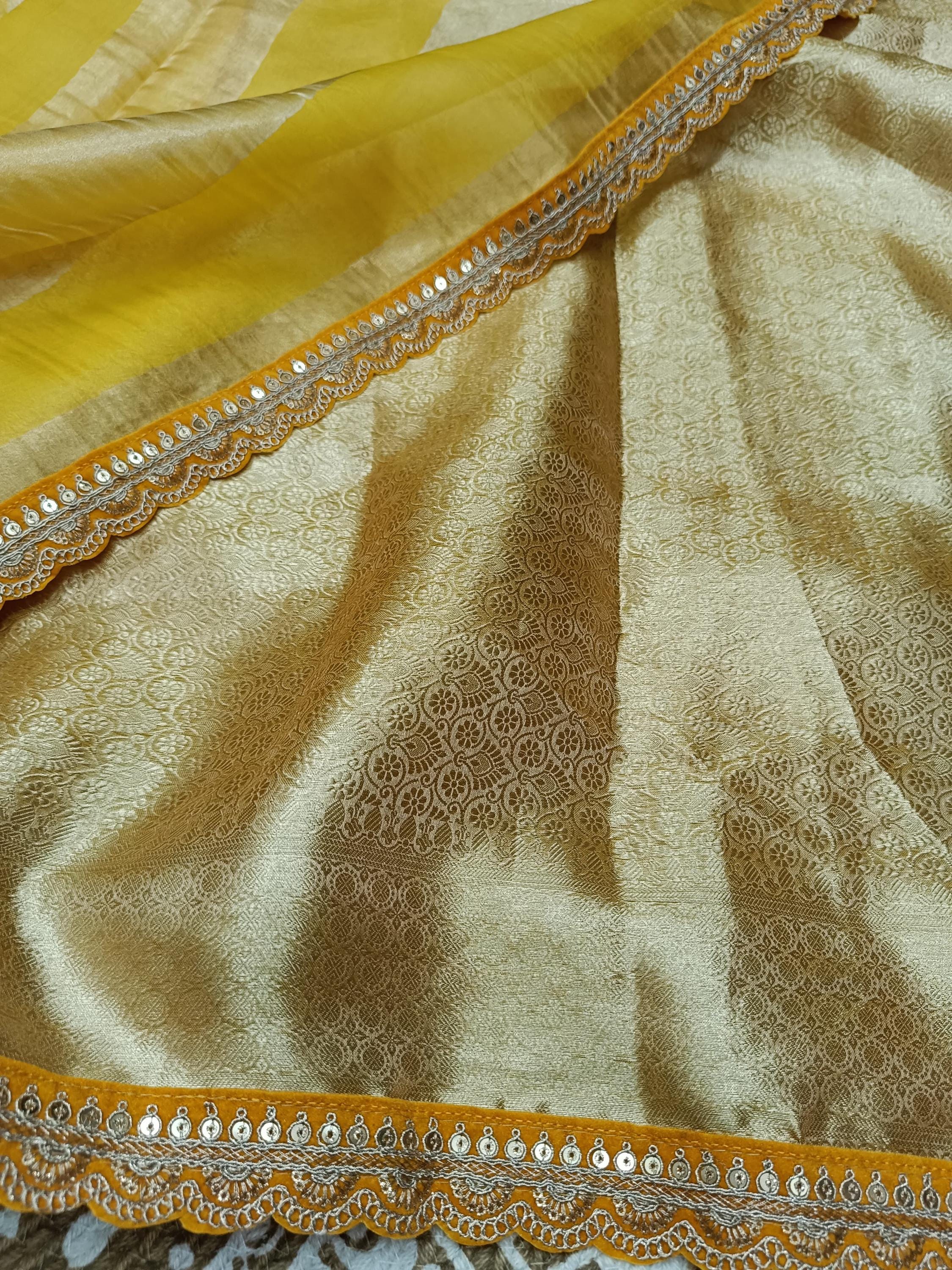 Experience the luxury of khaddi katan tissue Silk, adorned with exquisite handloom prints and a stunning organic banaras silk weave. This saree is a perfect fusion of heritage and contemporary elegance, making it ideal for weddings, festive occasions, and grand celebrations. A timeless masterpiece for your ethnic collection!