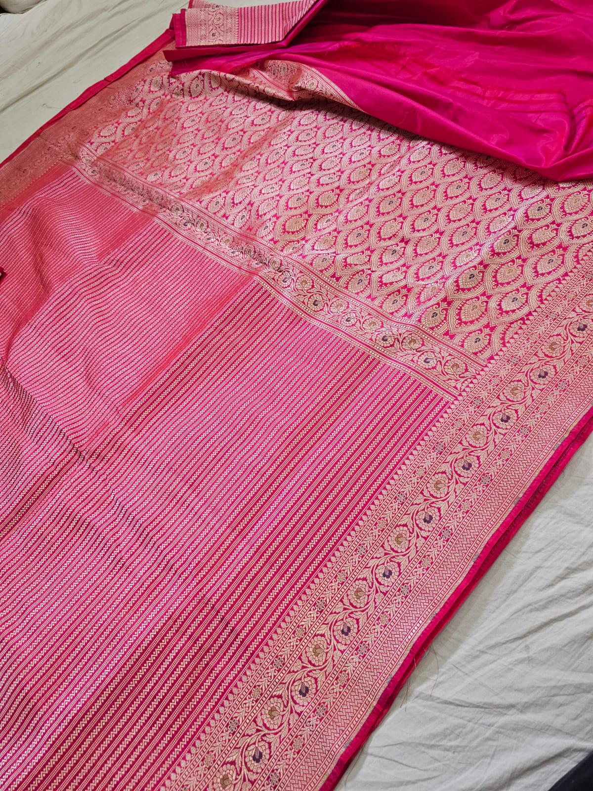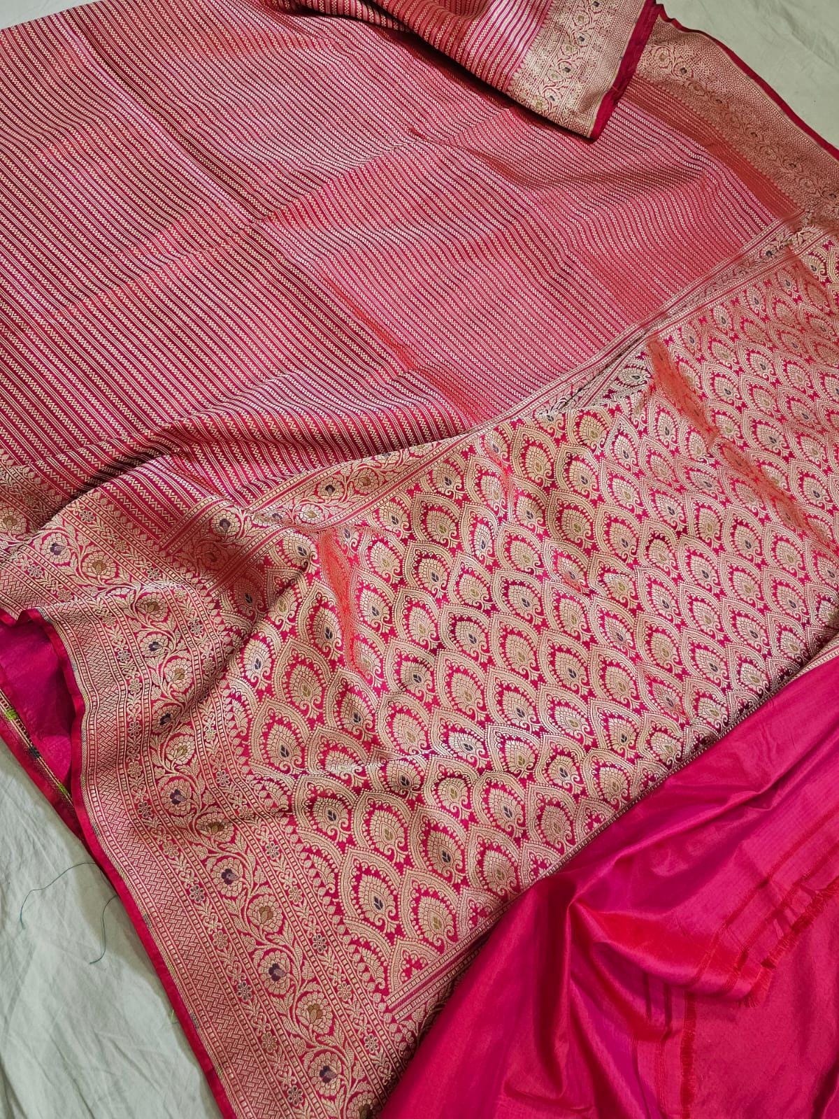 Alluring Handloomed Katan Banarasi Silk Saree, Exclusive Striped Border Alfi Meenakari Sari Masterpiece