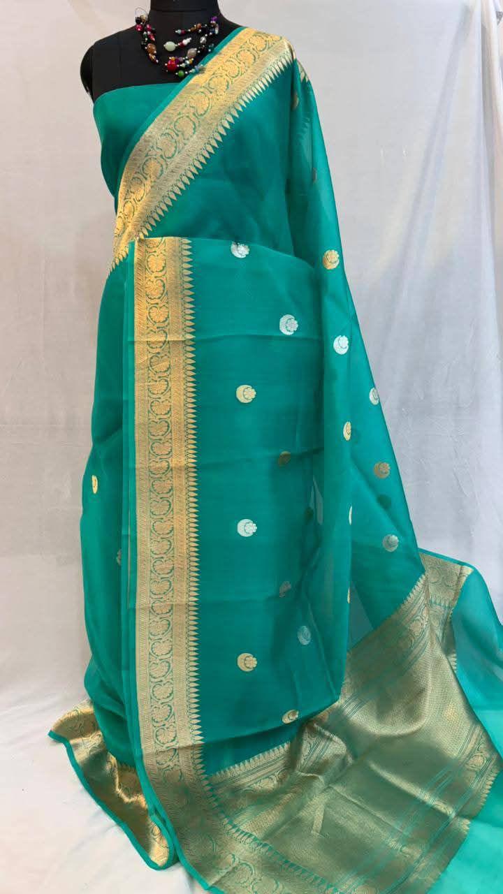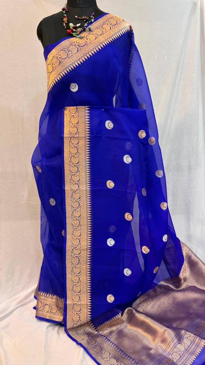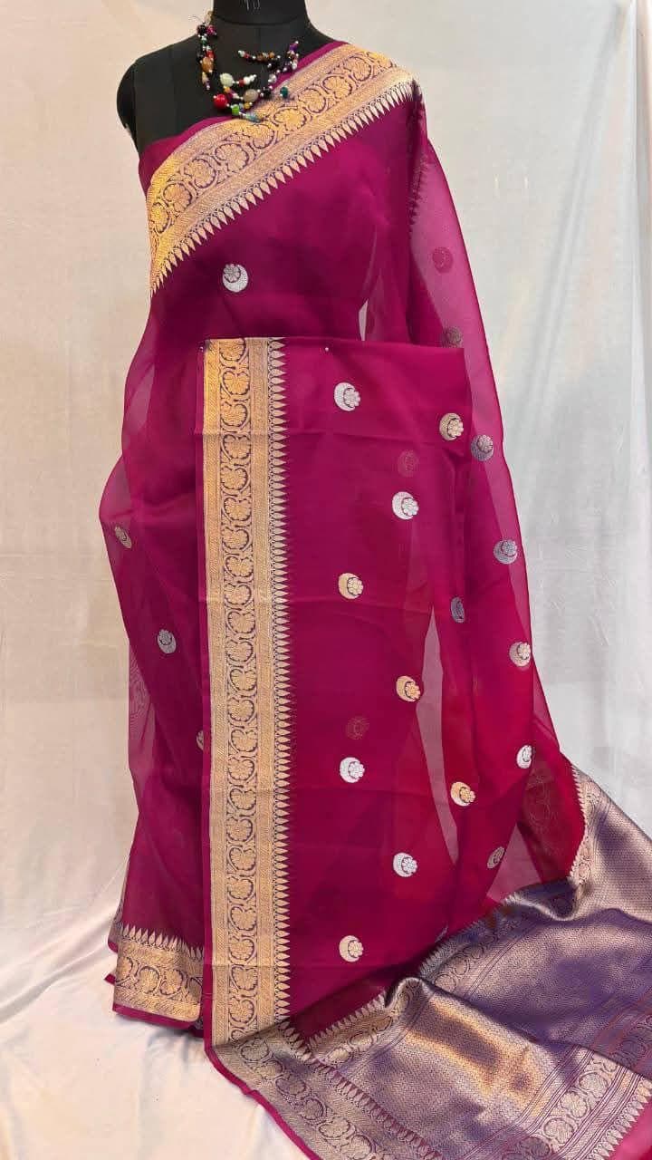 Embrace the latest fashion trends while staying deeply rooted in authentic weaving heritage. This glorious Banarasi pure handloom organza silk saree offers a breathtakingly smooth, soft, and feather-light drape. The sheer fabric is elevated by a rich, intricately designed pallu and a traditional Kadua border. Every single pure zari booti across the body is woven using the painstaking Kadua technique, ensuring a flawless finish with no loose threads at the back.