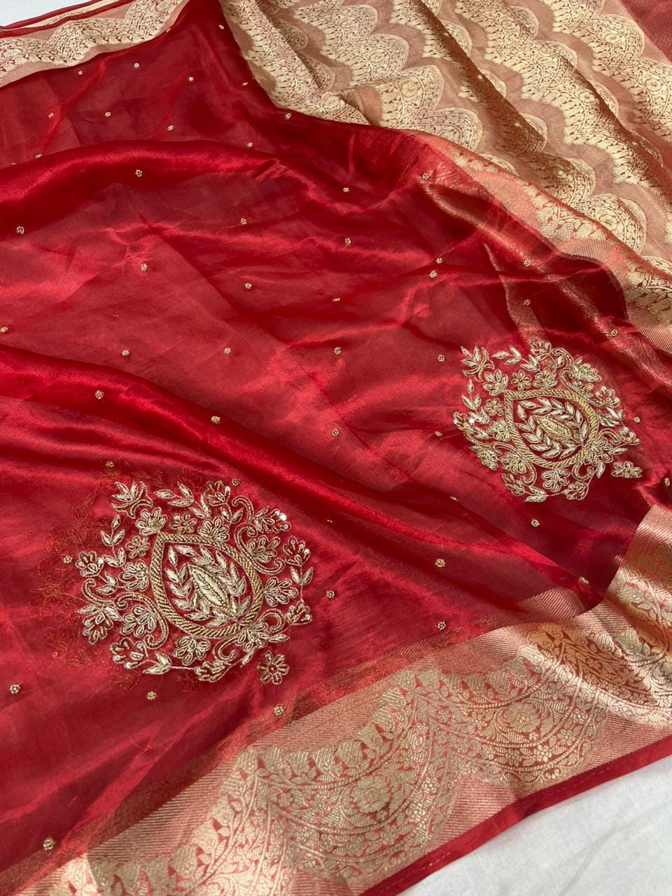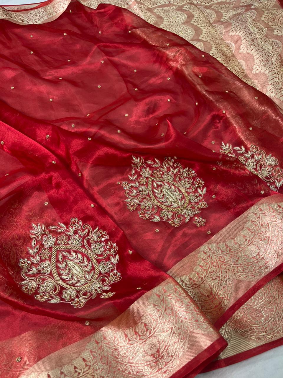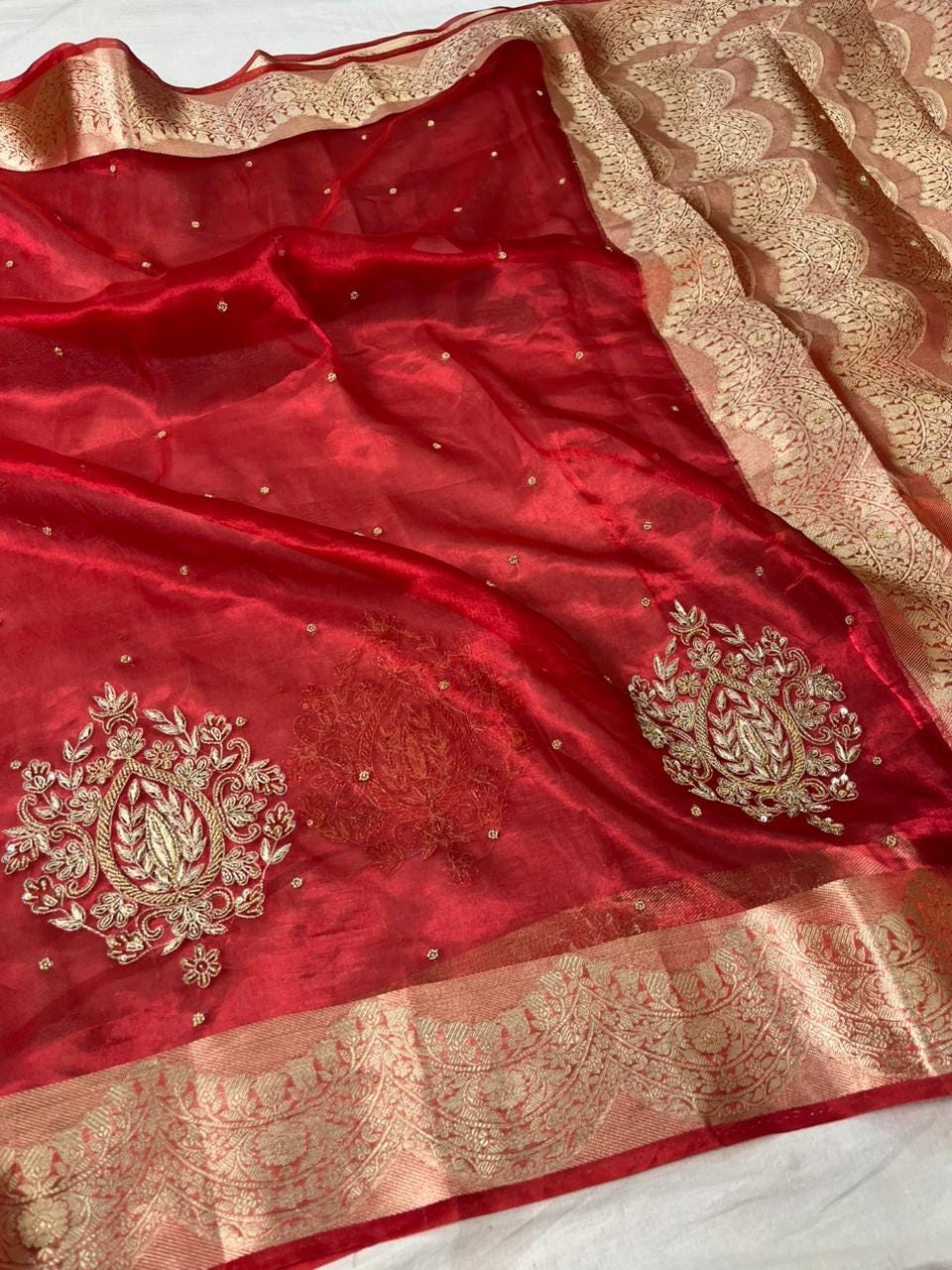 Dry Clean Only! To preserve the high-luster metallic sheen of the pure tissue silk and protect the delicate Zardozi and Aari hand-embroidery, strictly dry clean and store folded in a breathable muslin bag.