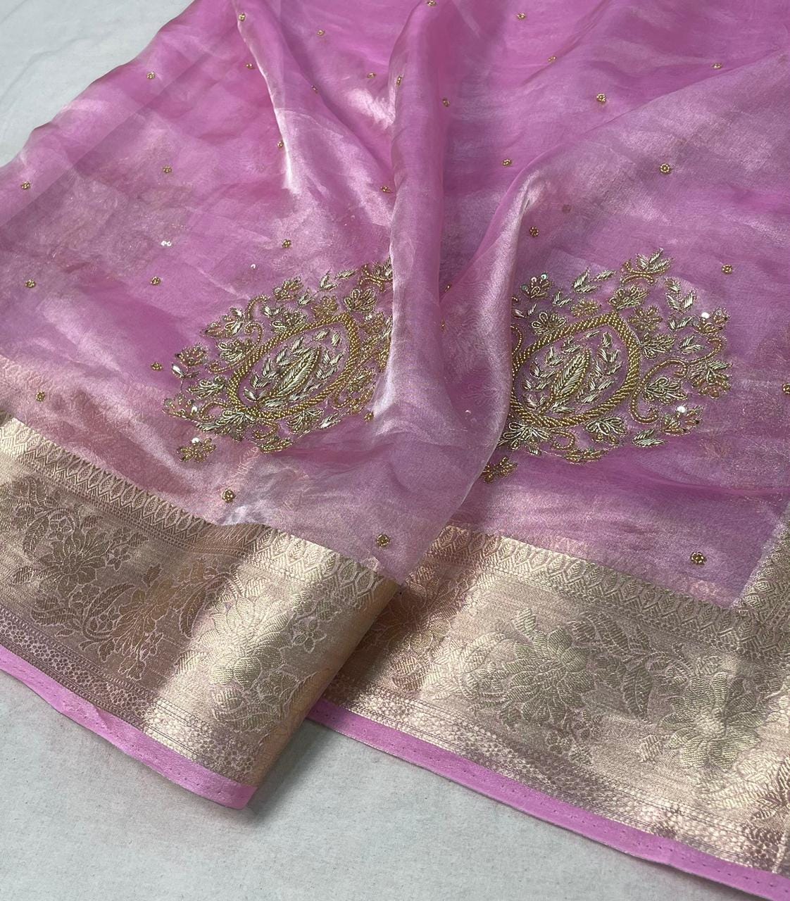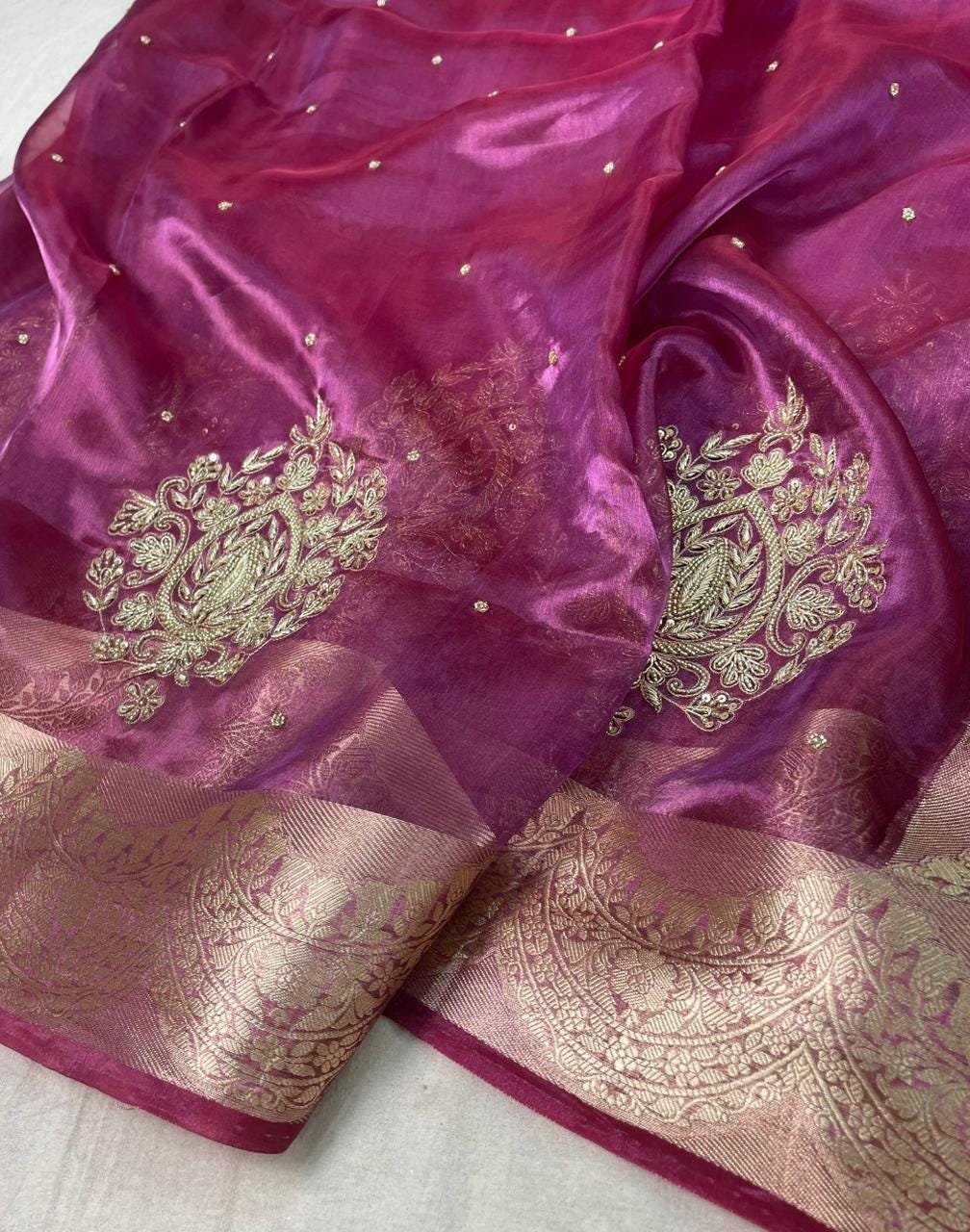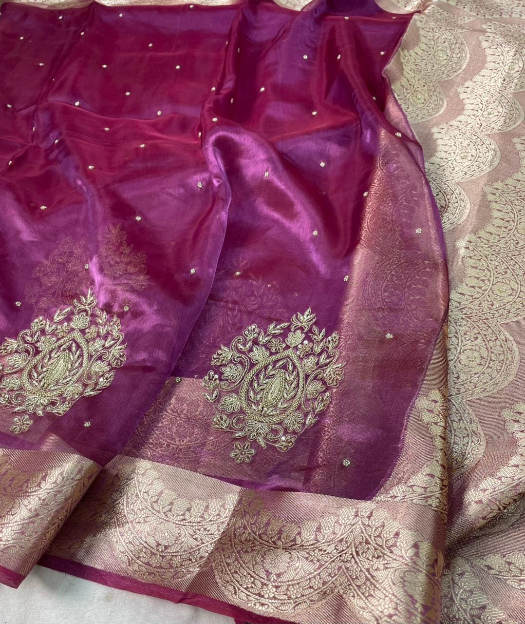 Dry Clean Only! To preserve the high-luster metallic sheen of the pure tissue silk and protect the delicate Zardozi and Aari hand-embroidery, strictly dry clean and store folded in a breathable muslin bag.