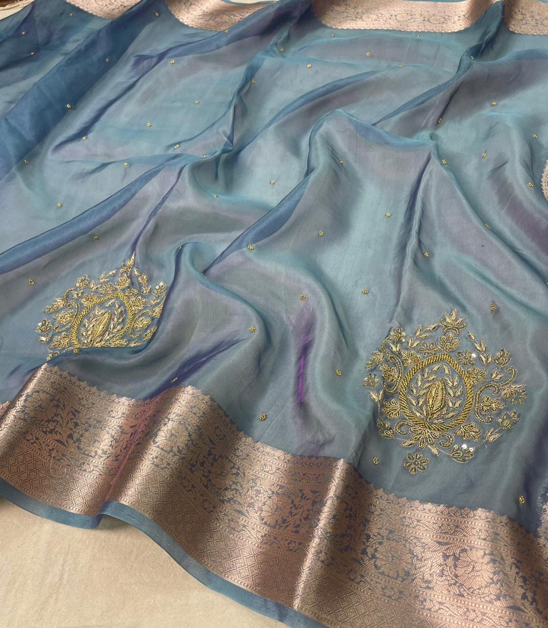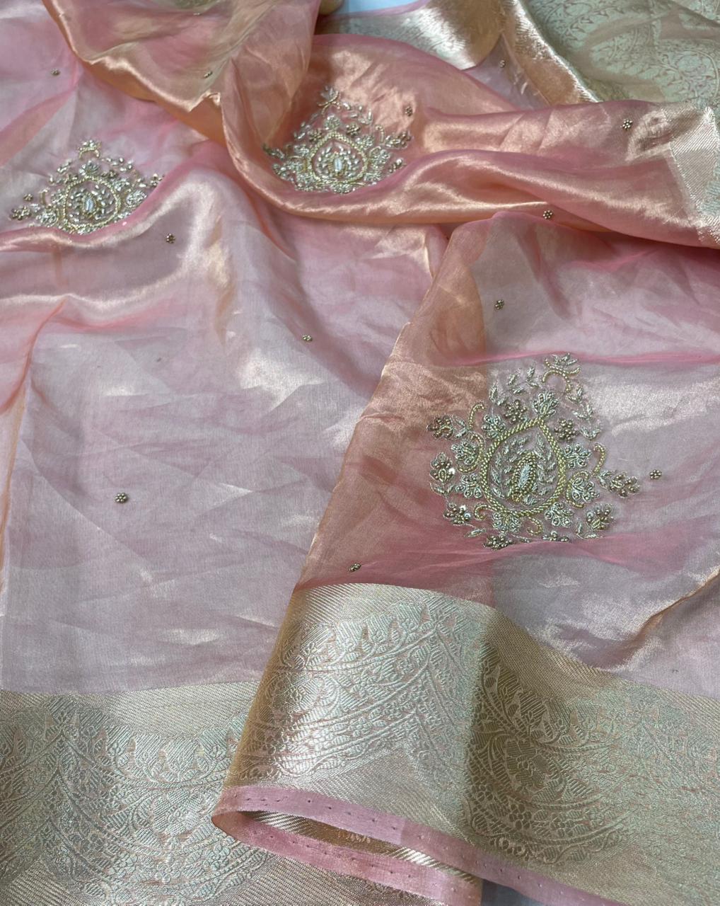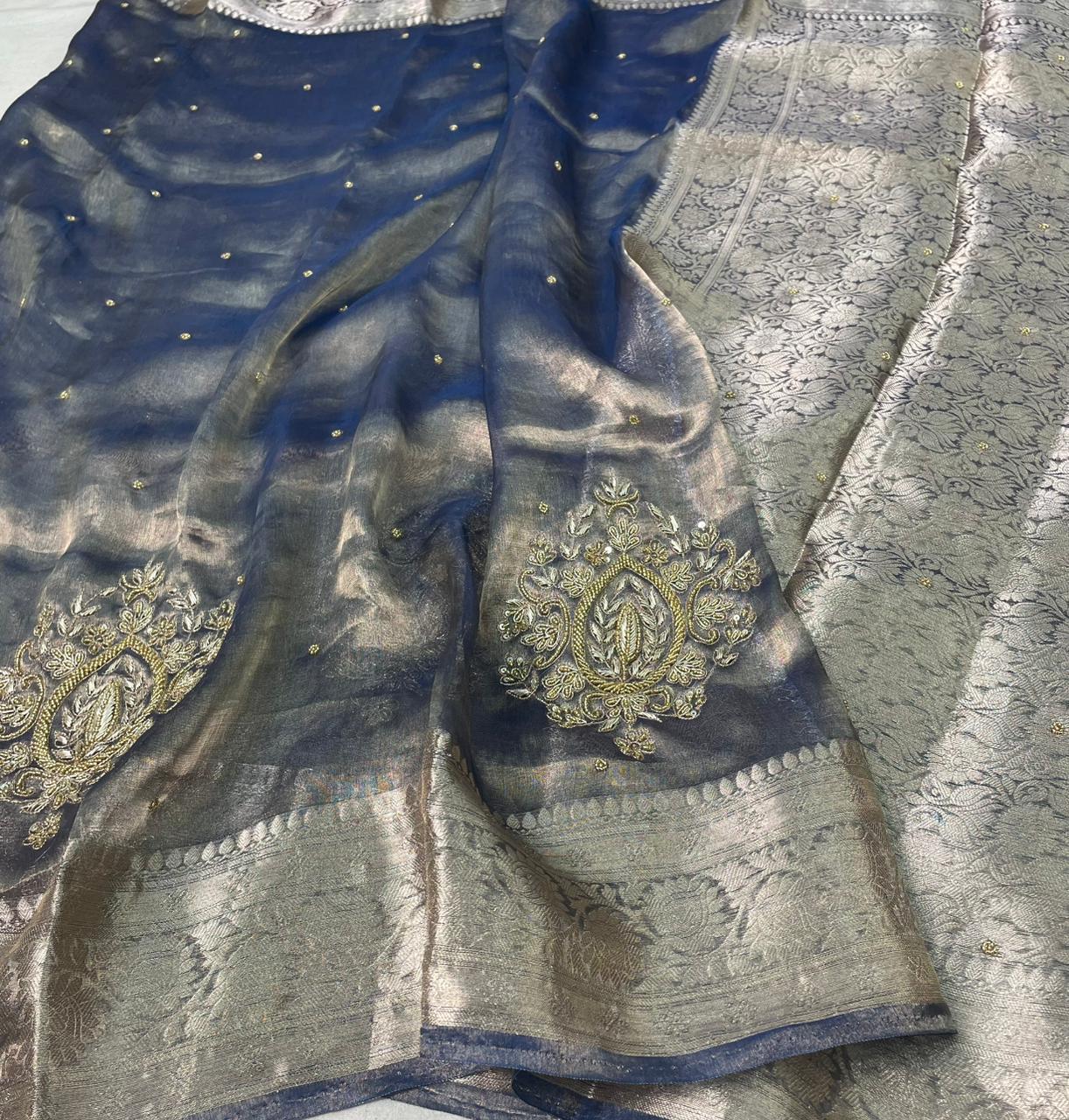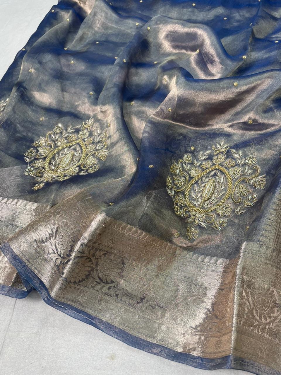 Step into pure, liquid radiance. This exquisite Pure Tissue Silk saree is a true masterpiece of textile art, featuring a highly sought-after, luxurious metallic sheen that falls into a breathtaking "liquid-gold" drape. The regal traditional fabric is beautifully balanced with modern elegance, showcasing highly intricate hand-embroidered Zardozi and Aari floral medallions and scattered buttis throughout. The piece is flawlessly framed by a trendy, scalloped edge featuring fine gold zari weaving.