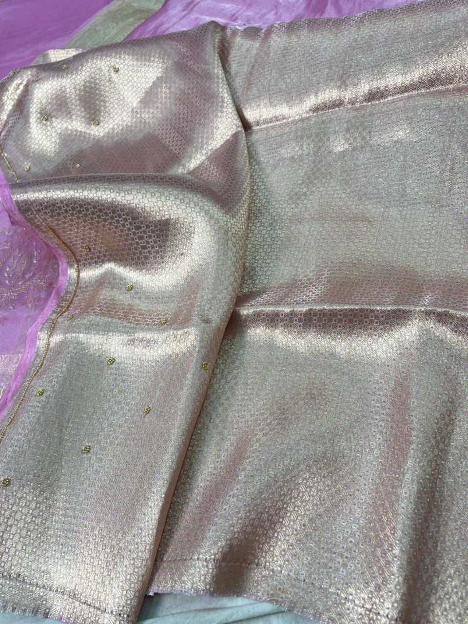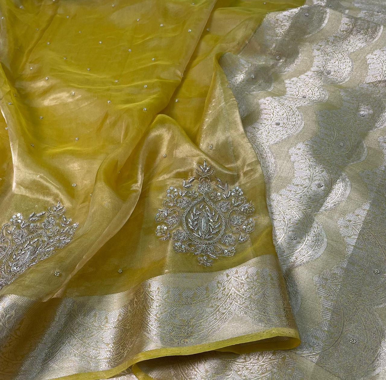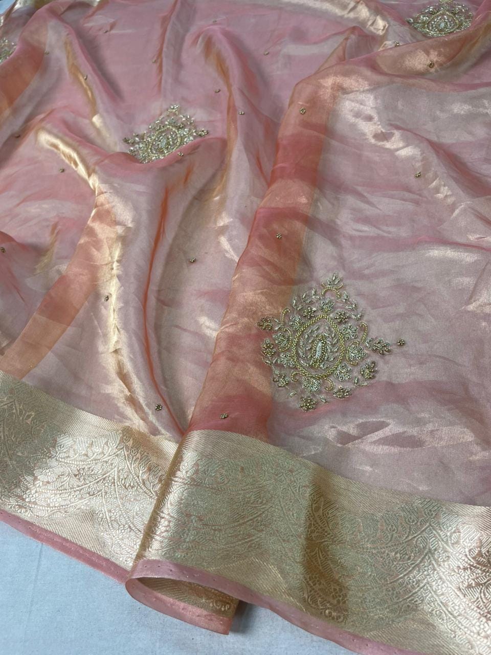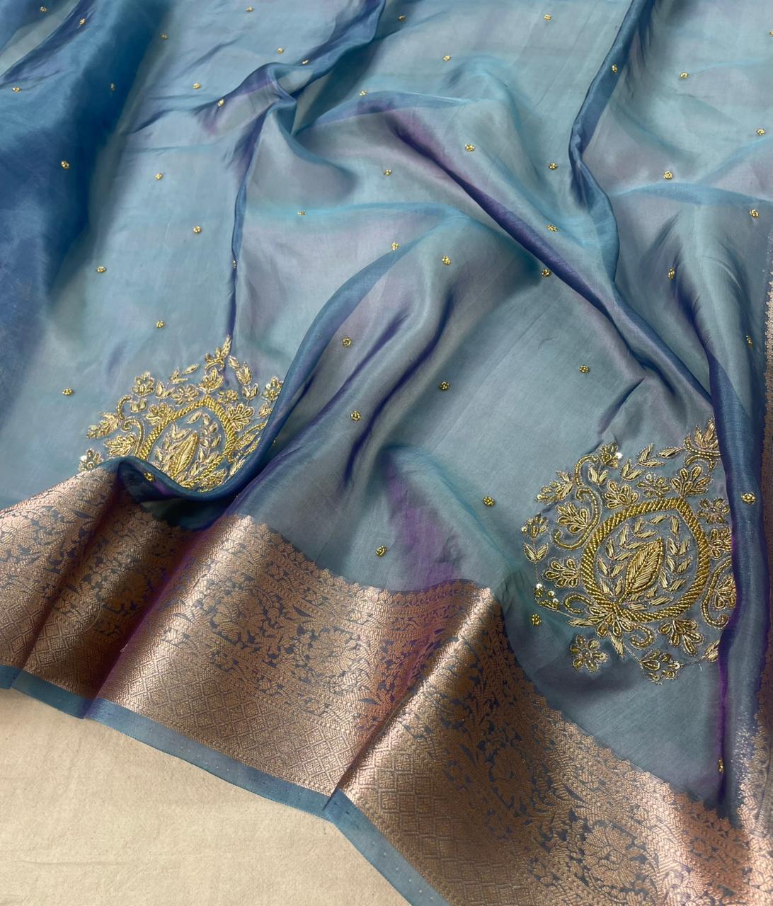 Step into pure, liquid radiance. This exquisite Pure Tissue Silk saree is a true masterpiece of textile art, featuring a highly sought-after, luxurious metallic sheen that falls into a breathtaking "liquid-gold" drape. The regal traditional fabric is beautifully balanced with modern elegance, showcasing highly intricate hand-embroidered Zardozi and Aari floral medallions and scattered buttis throughout. The piece is flawlessly framed by a trendy, scalloped edge featuring fine gold zari weaving.