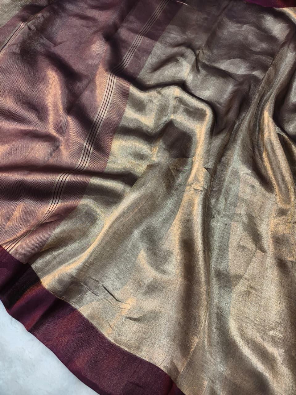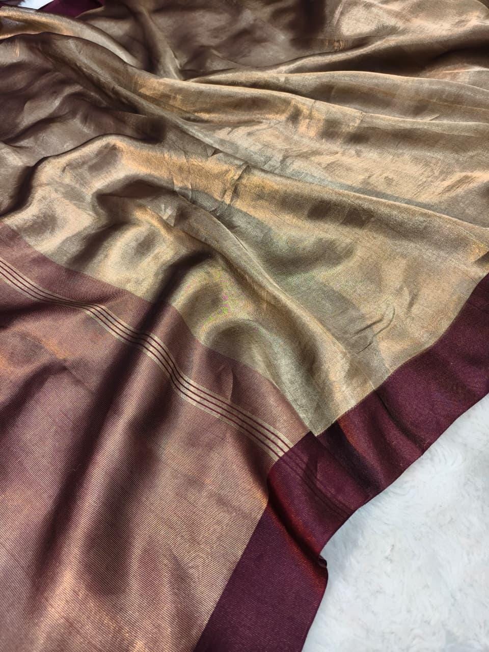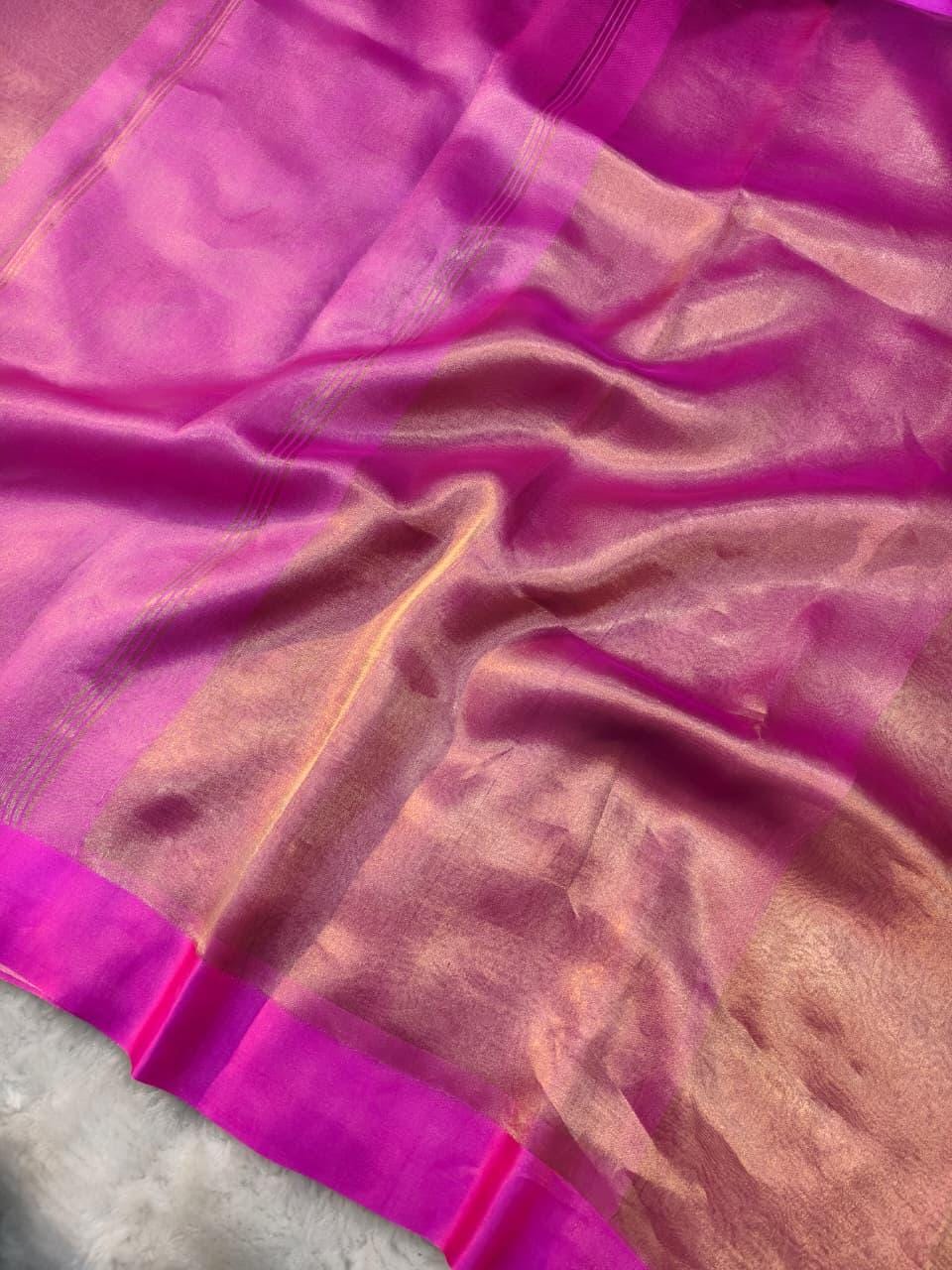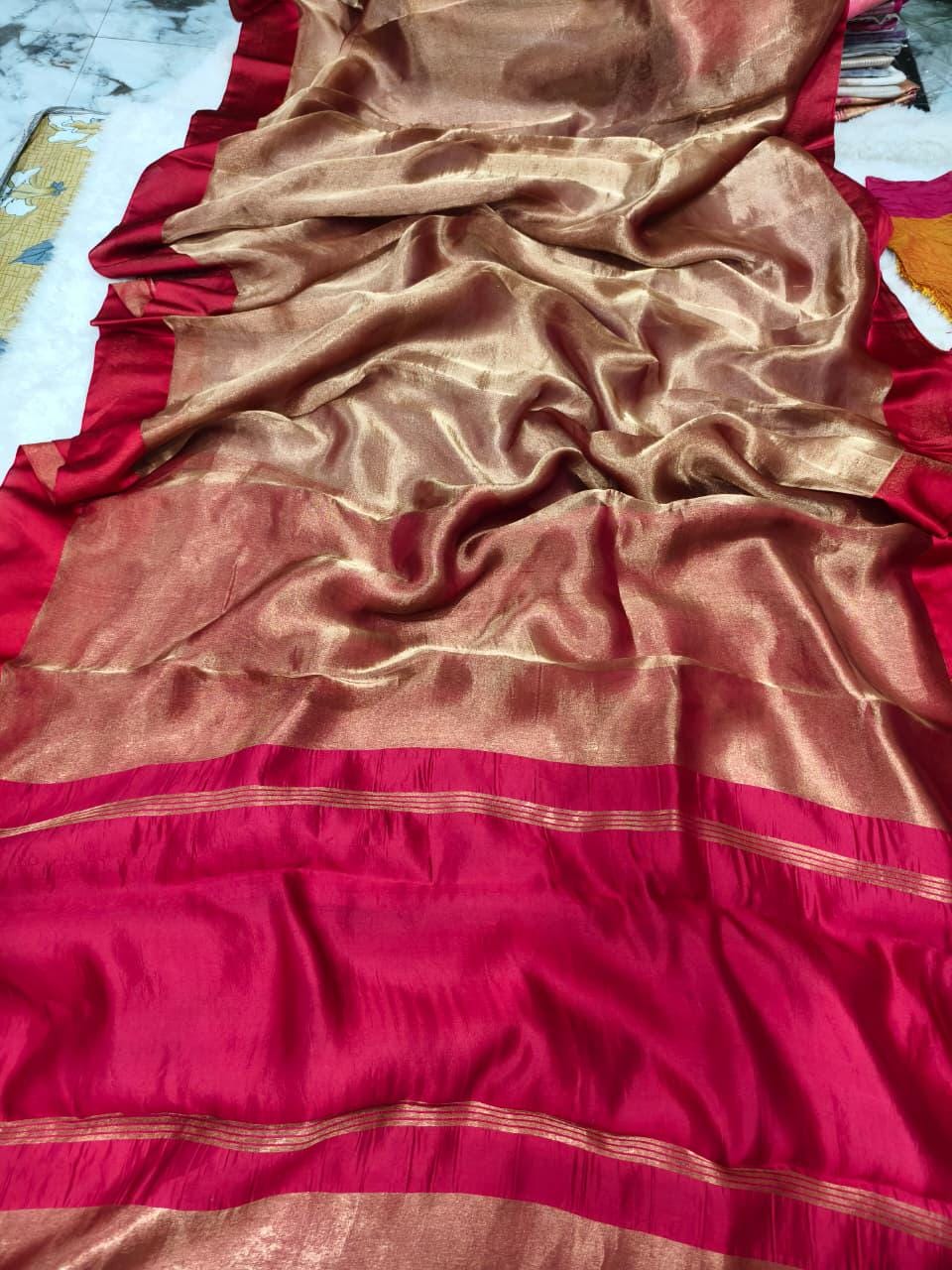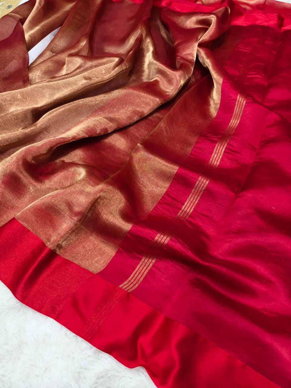 Fabric: High-Luster Pure Tissue Silk (Renowned for its metallic sheen and breathtaking, fluid "liquid-gold" drape).