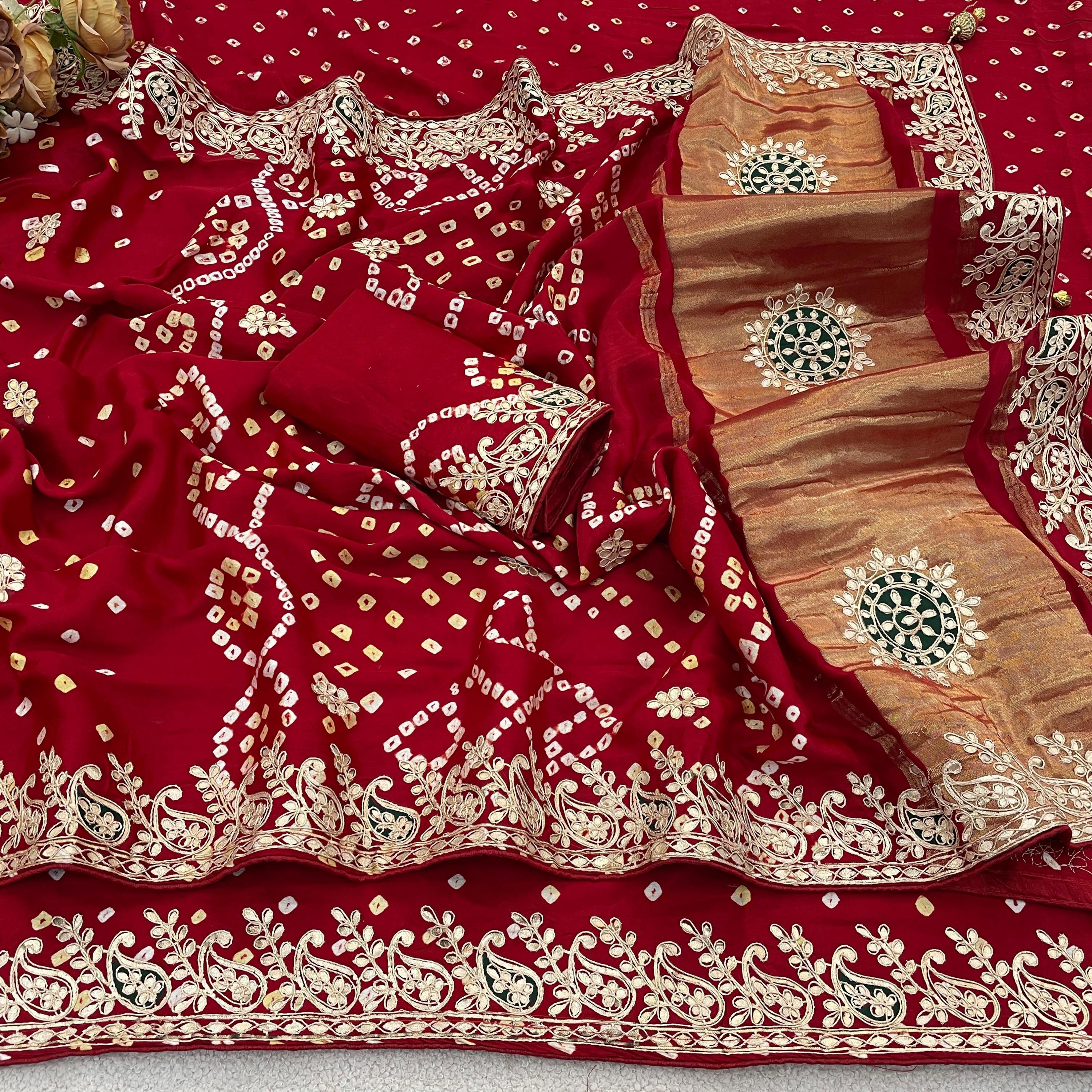 • Jaipuri Gota Patti Border: A rich, wide golden border meticulously applied by hand using traditional Gota techniques.