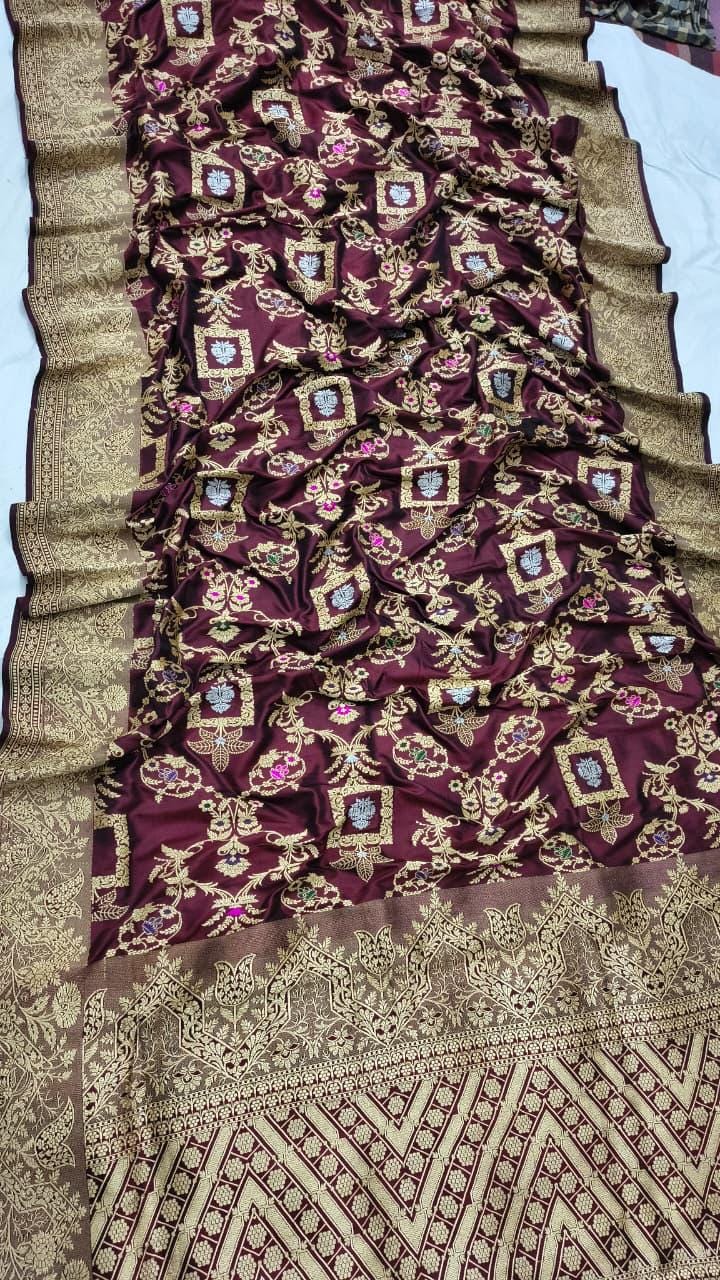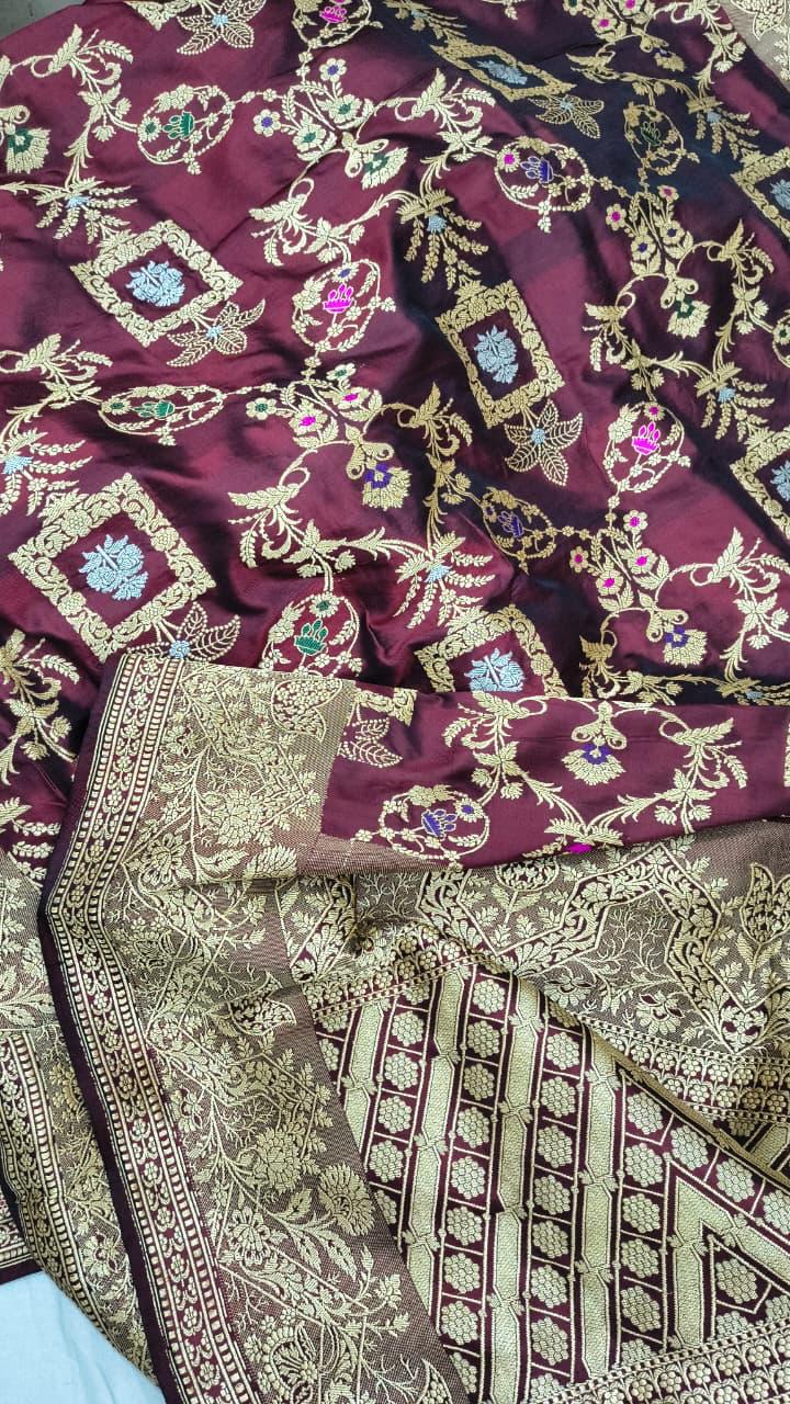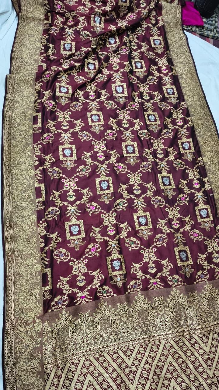 Presenting the crown jewel of Banarasi artistry—the Meena Jaal Katan Silk Saree. This is a labor of love, where every floral motif is individually hand-woven into the fabric using the elite 'Kadwa' technique, ensuring a flawless finish on both sides.