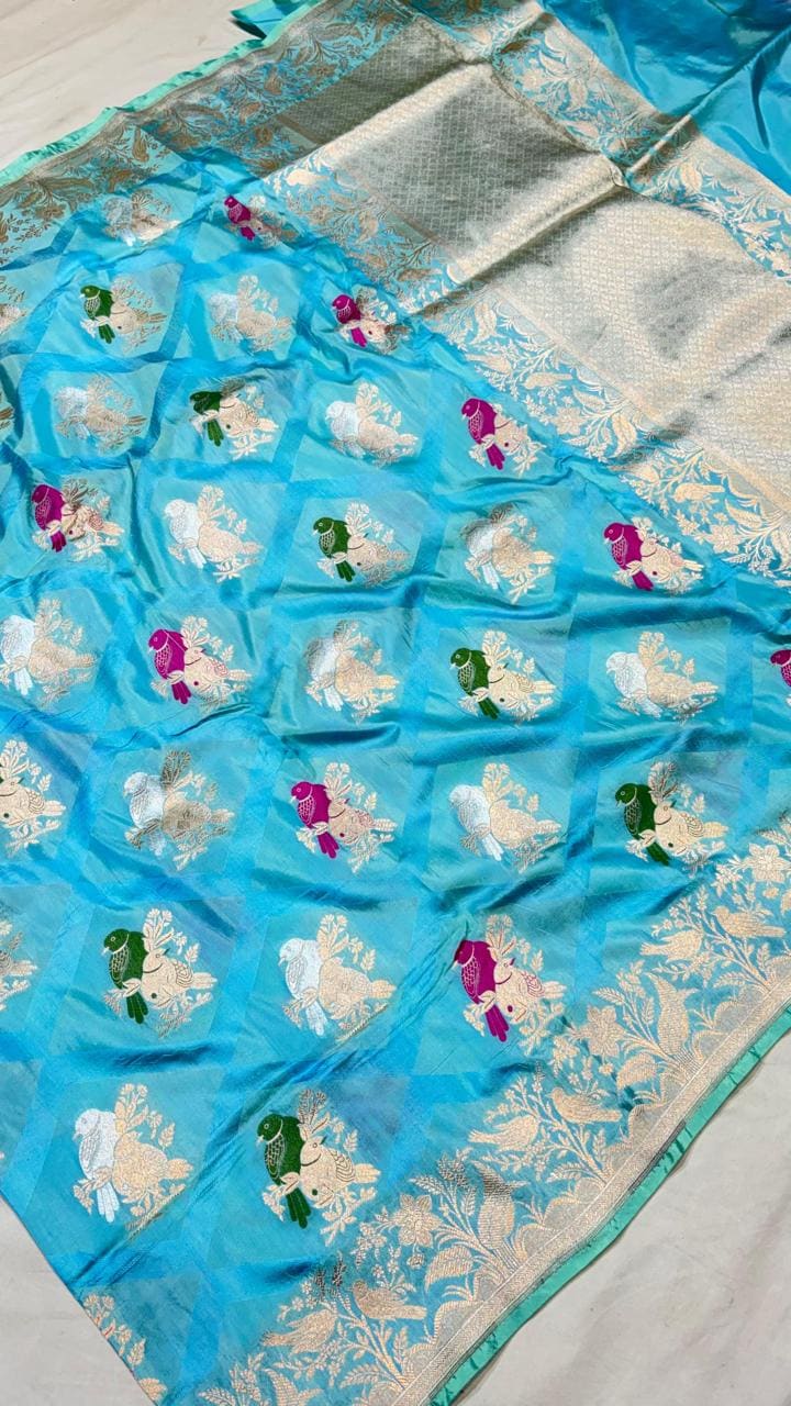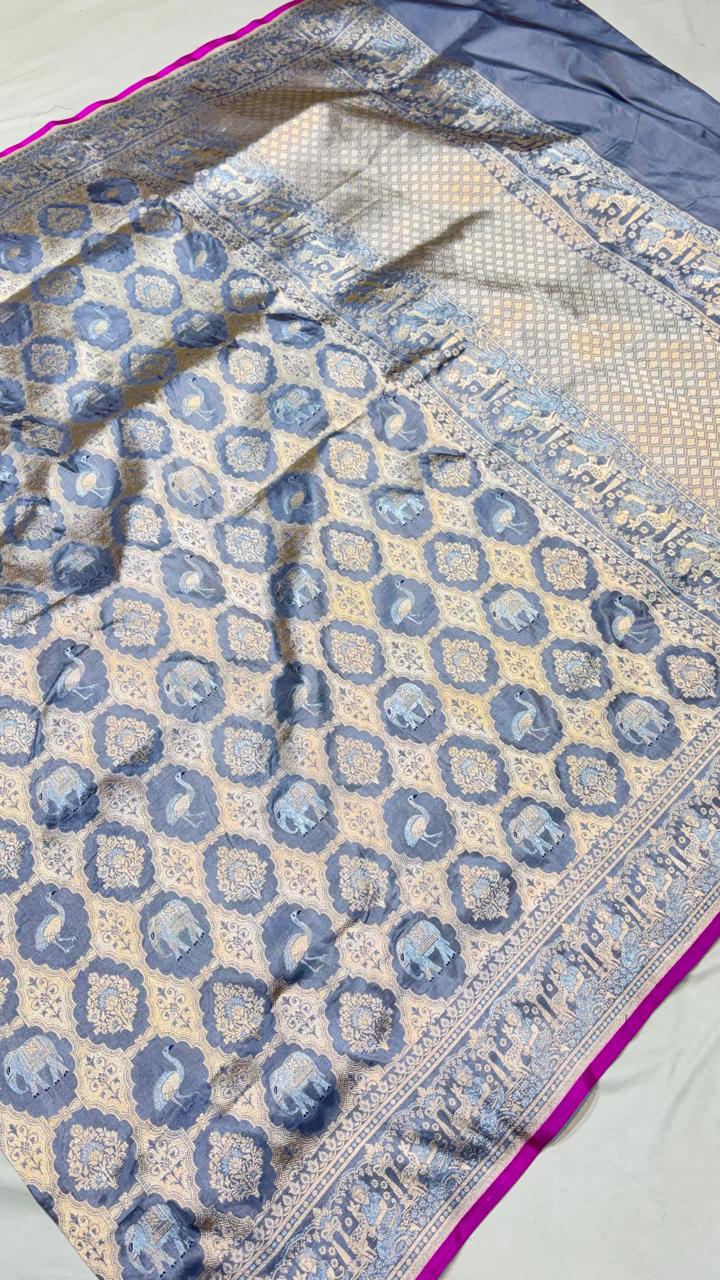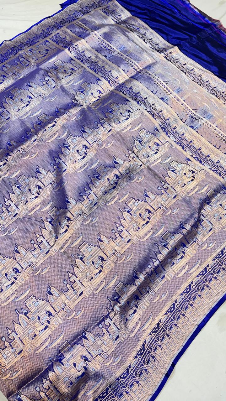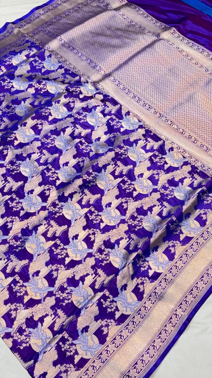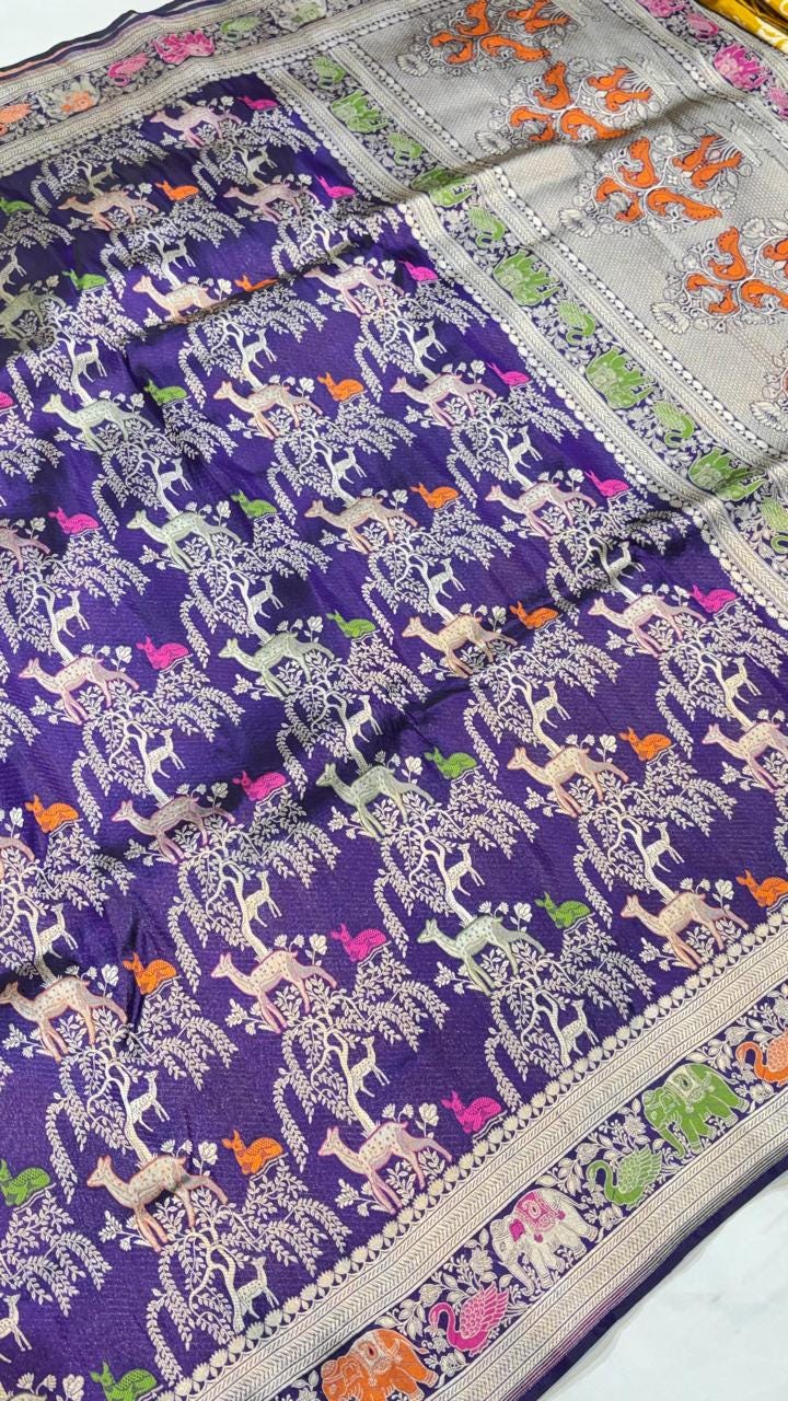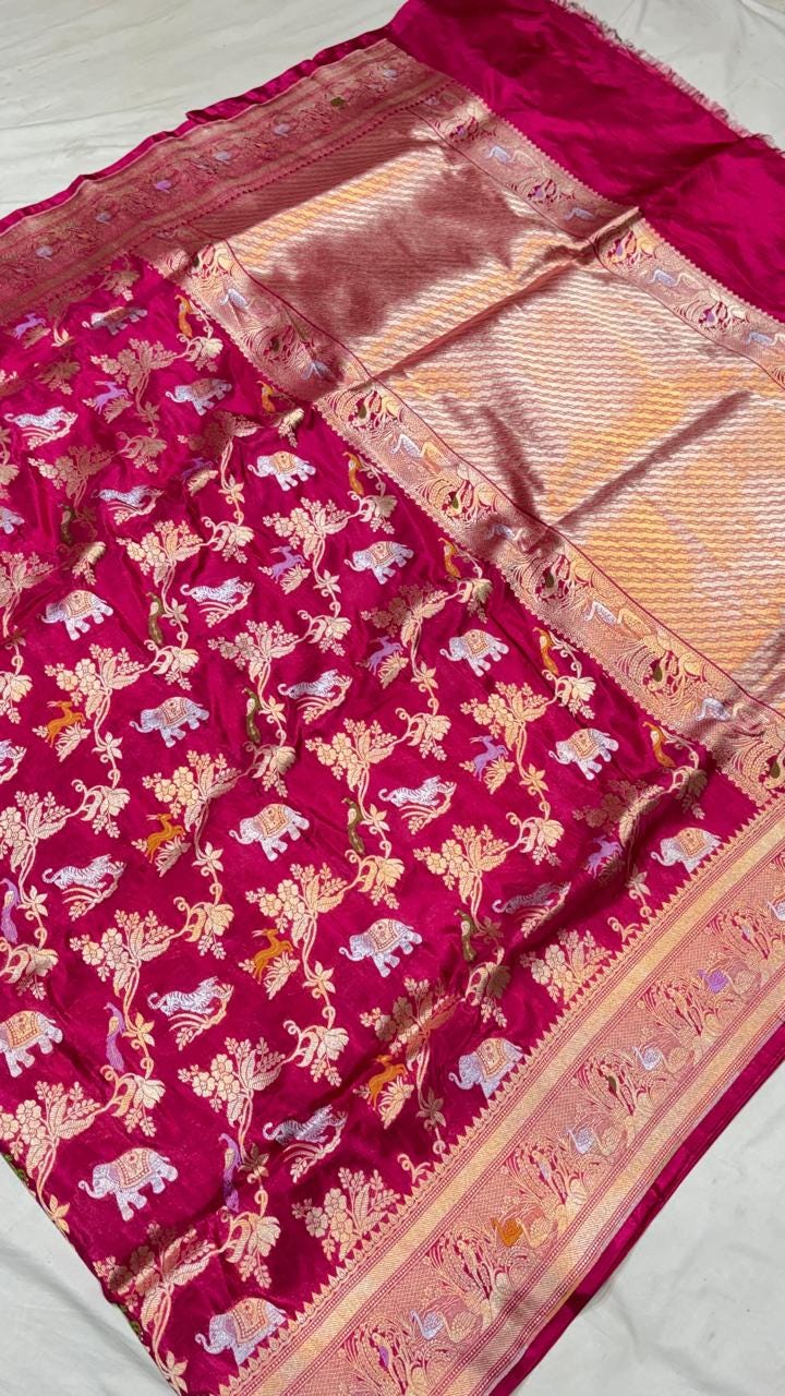 Experience the luxury of khaddi katan tissue Silk, adorned with exquisite handloom prints and a stunning organic banaras silk weave. This saree is a perfect fusion of heritage and contemporary elegance, making it ideal for weddings, festive occasions, and grand celebrations. A timeless masterpiece for your ethnic collection!