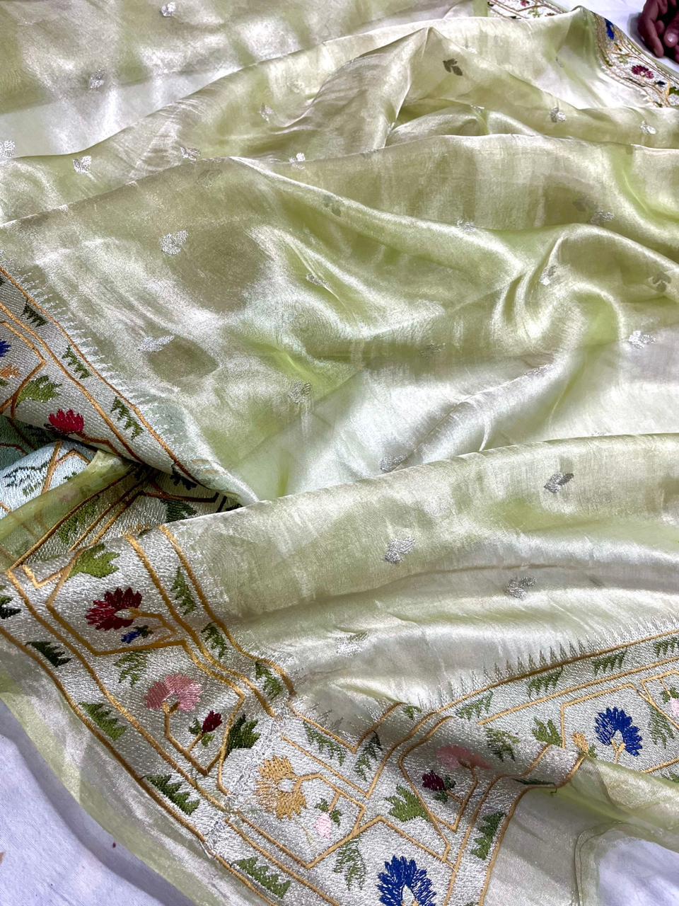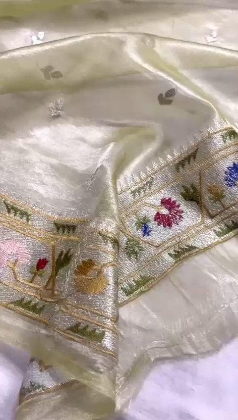 Experience the luxury of khaddi katan tissue Silk, adorned with exquisite handloom prints and a stunning organic banaras silk weave. This saree is a perfect fusion of heritage and contemporary elegance, making it ideal for weddings, festive occasions, and grand celebrations. A timeless masterpiece for your ethnic collection!