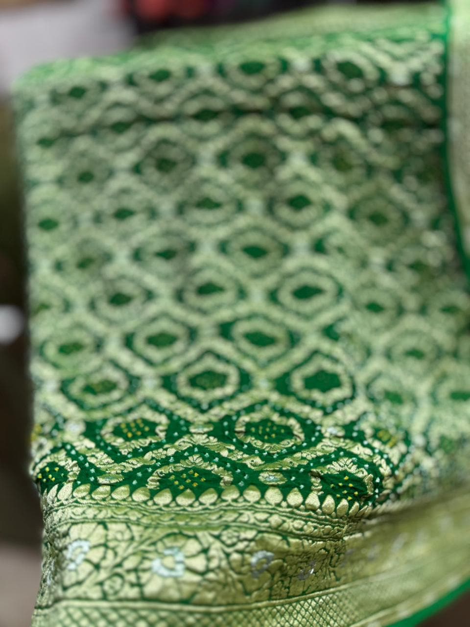 • Authentic Rai Bandhani: Features intricate white-colored Bandhej dots, hand-tied in the traditional 'Rai' style to create a stunning abstract design.