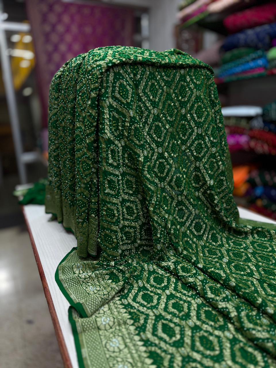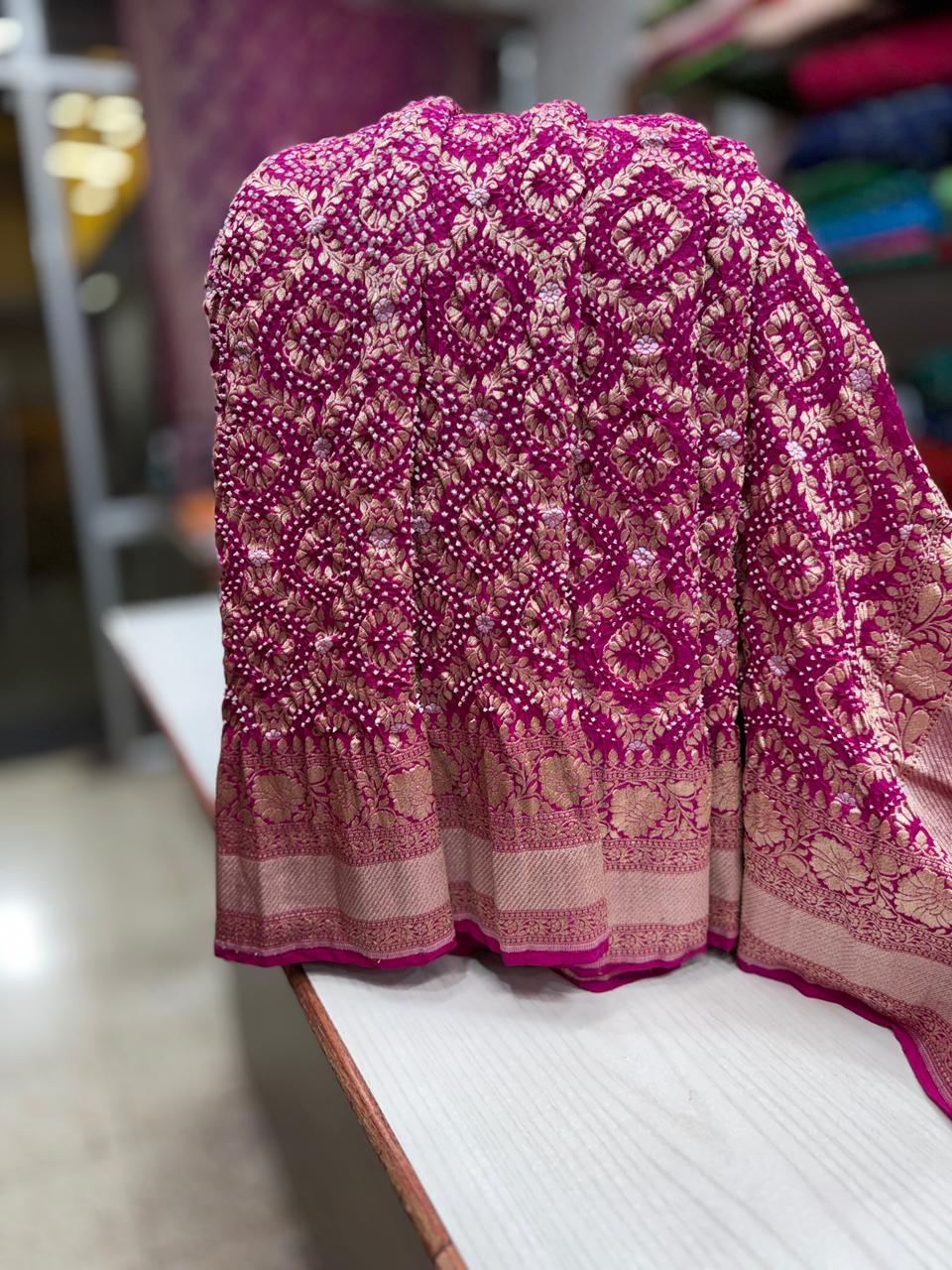 Experience the breathtaking synergy of ancestral crafts with our Heavy Khadi Georgette Rai Bandhani Saree. This piece is a soulful tribute to artisanal patience, featuring the microscopic 'Rai' (mustard seed) tie-dye technique on a premium, high-density handloom base.