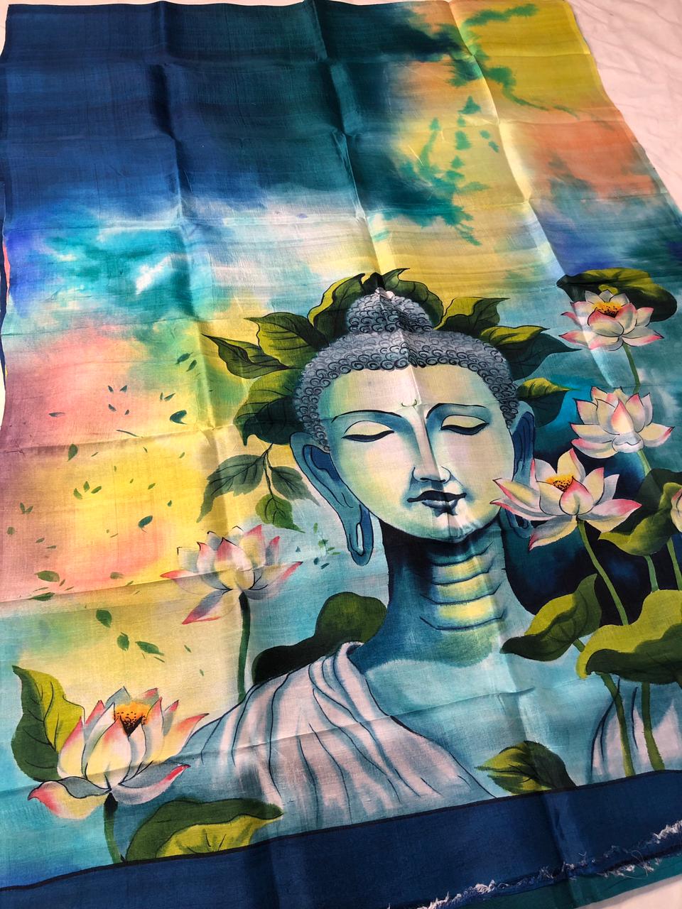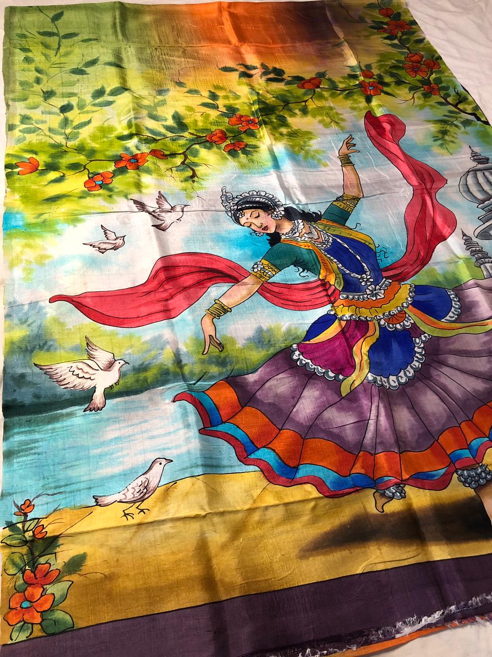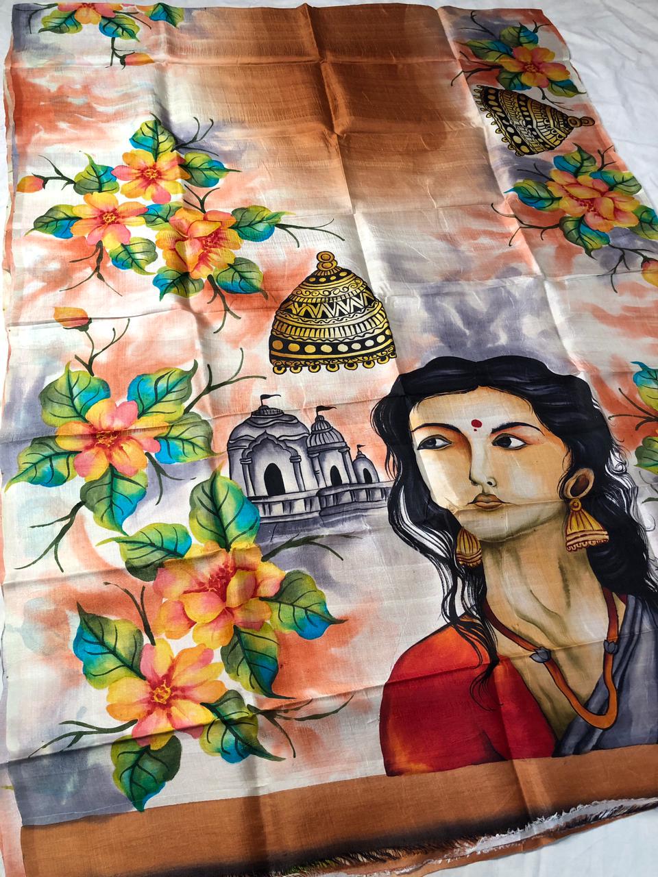 Experience the raw, organic elegance of Pure Tussar Silk. This handcrafted masterpiece features an ethereal hand-painted design, meticulously applied to a premium handloom base by our master artisans.