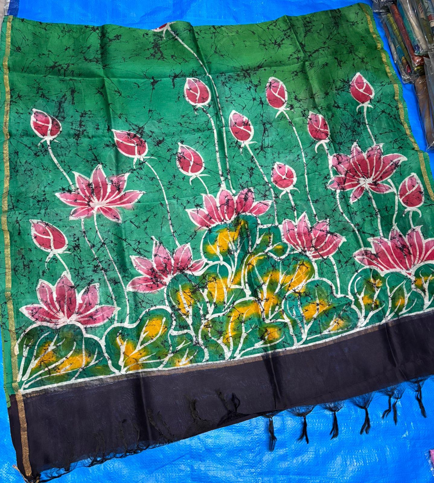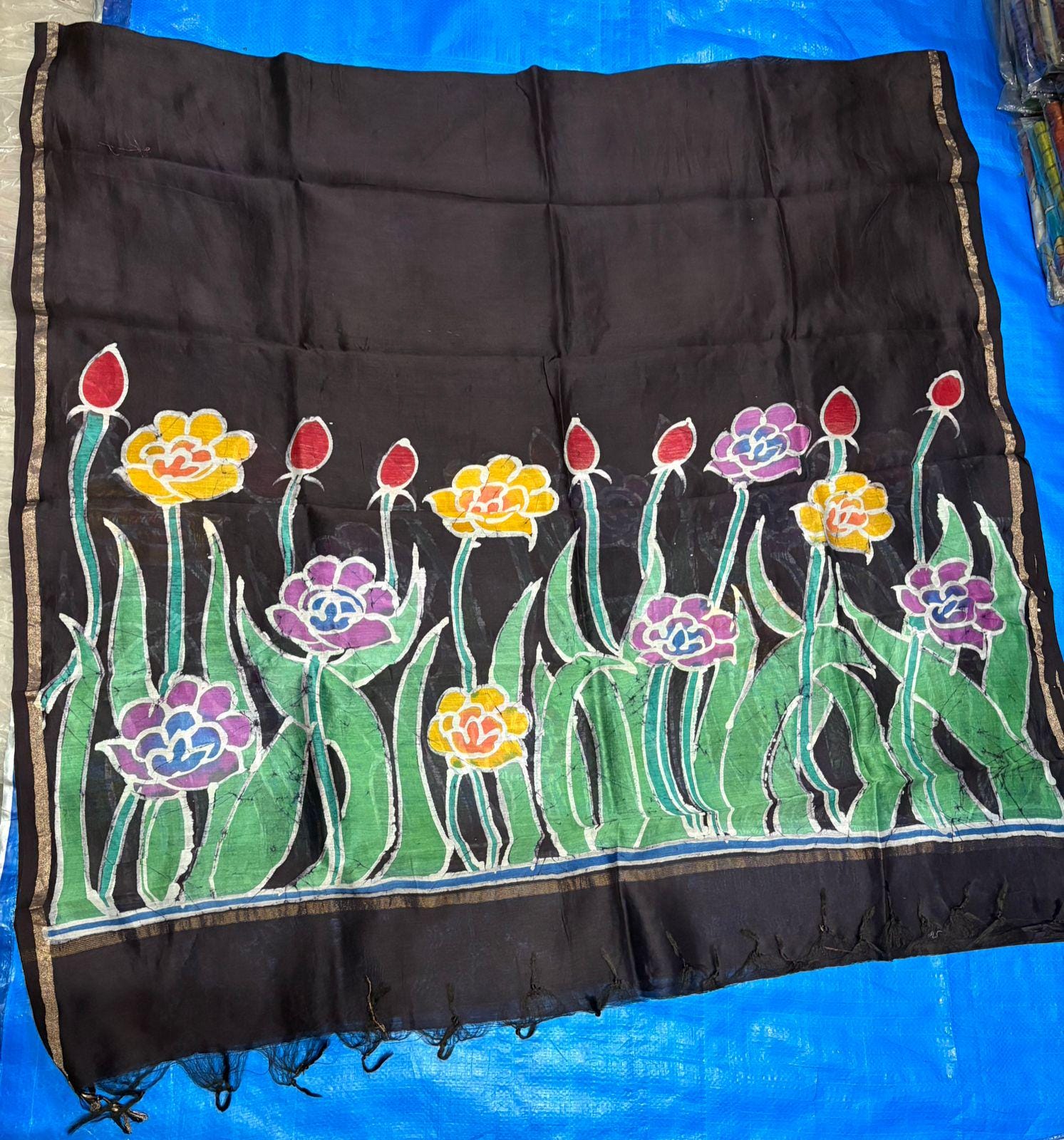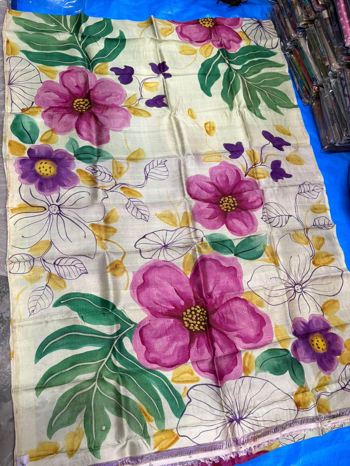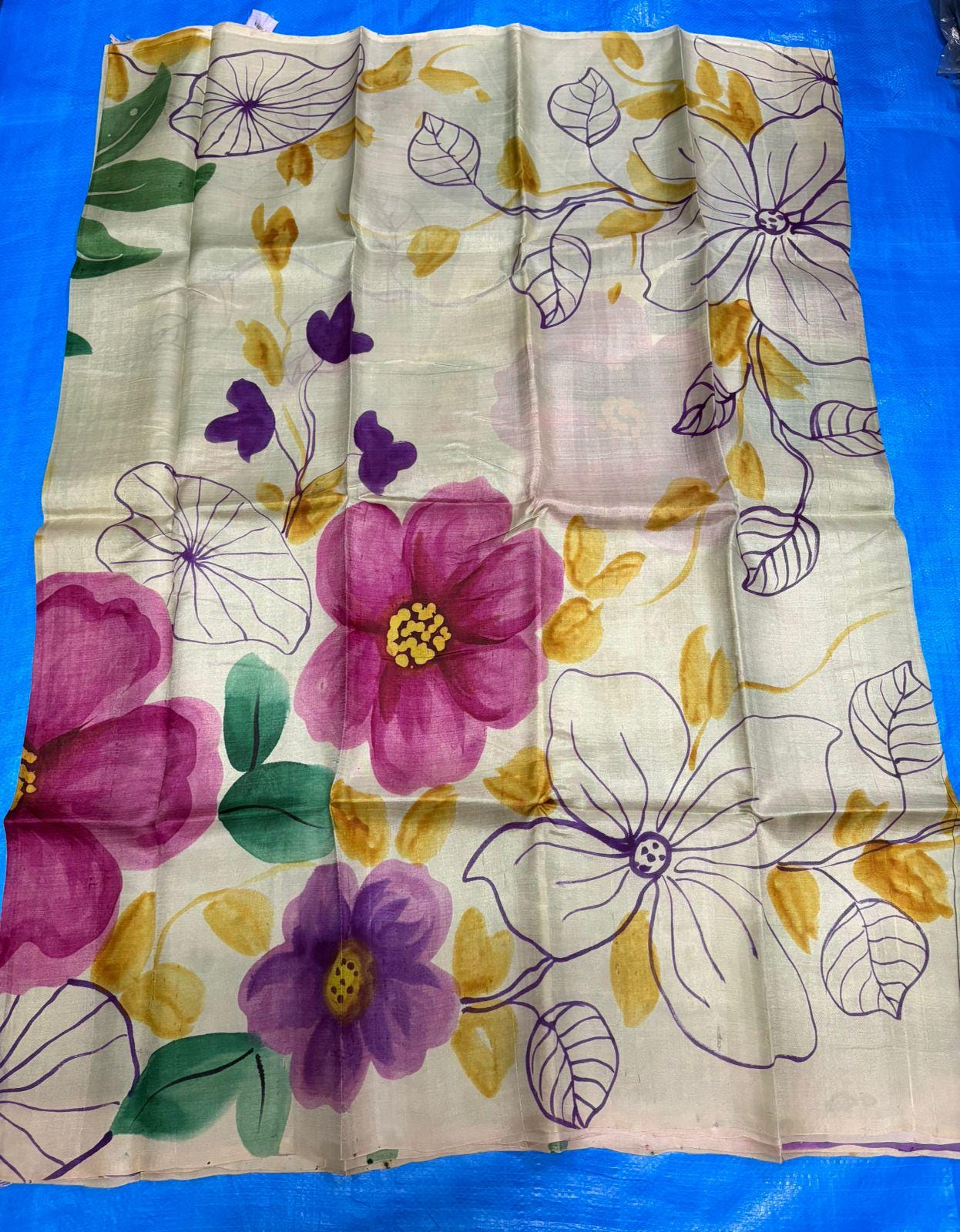 • Hand-Painted Artistry: Unlike printed sarees, each floral motif is hand-painted, ensuring that no two pieces are exactly alike—a true signature of The Upcycling Story.
