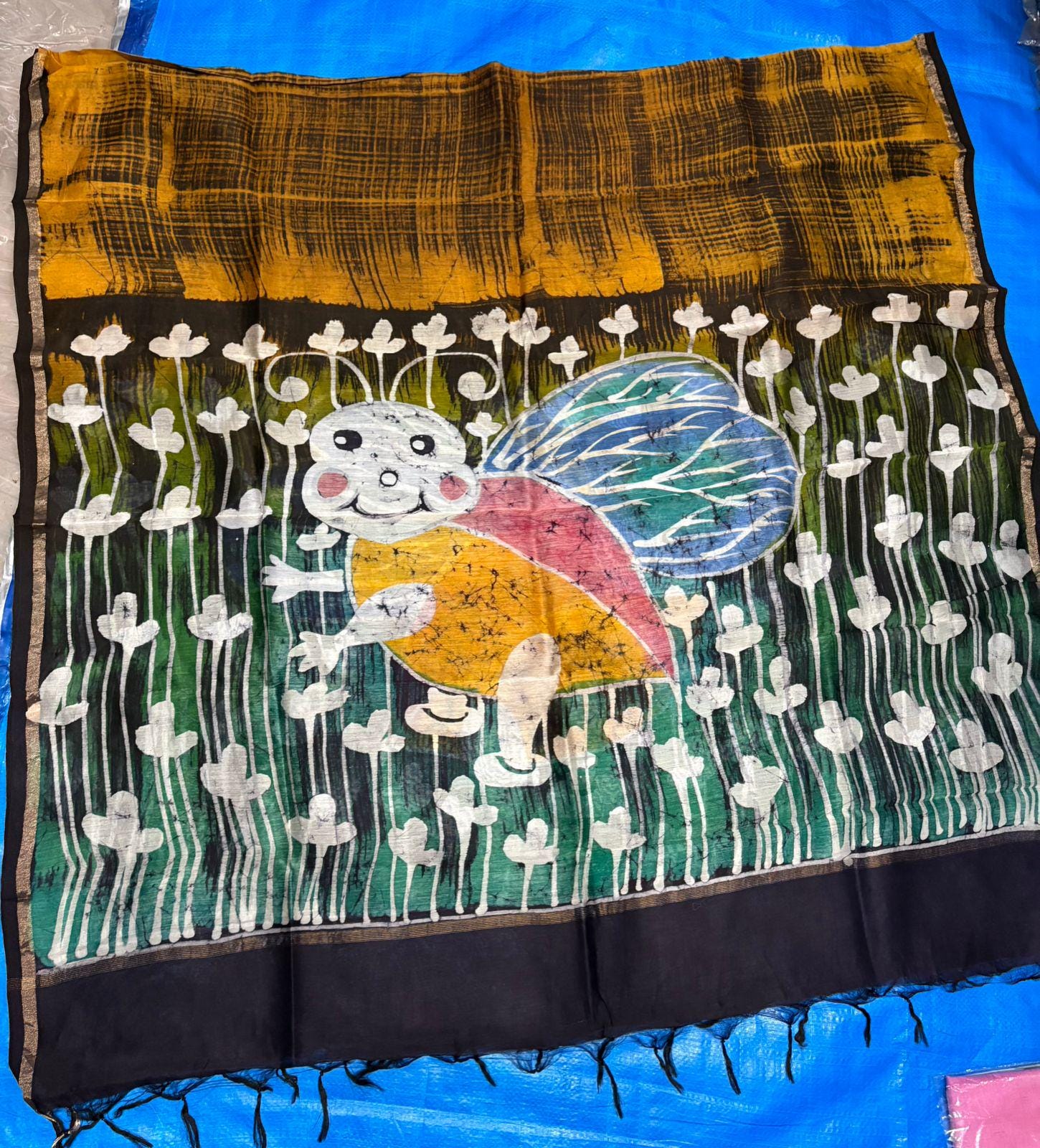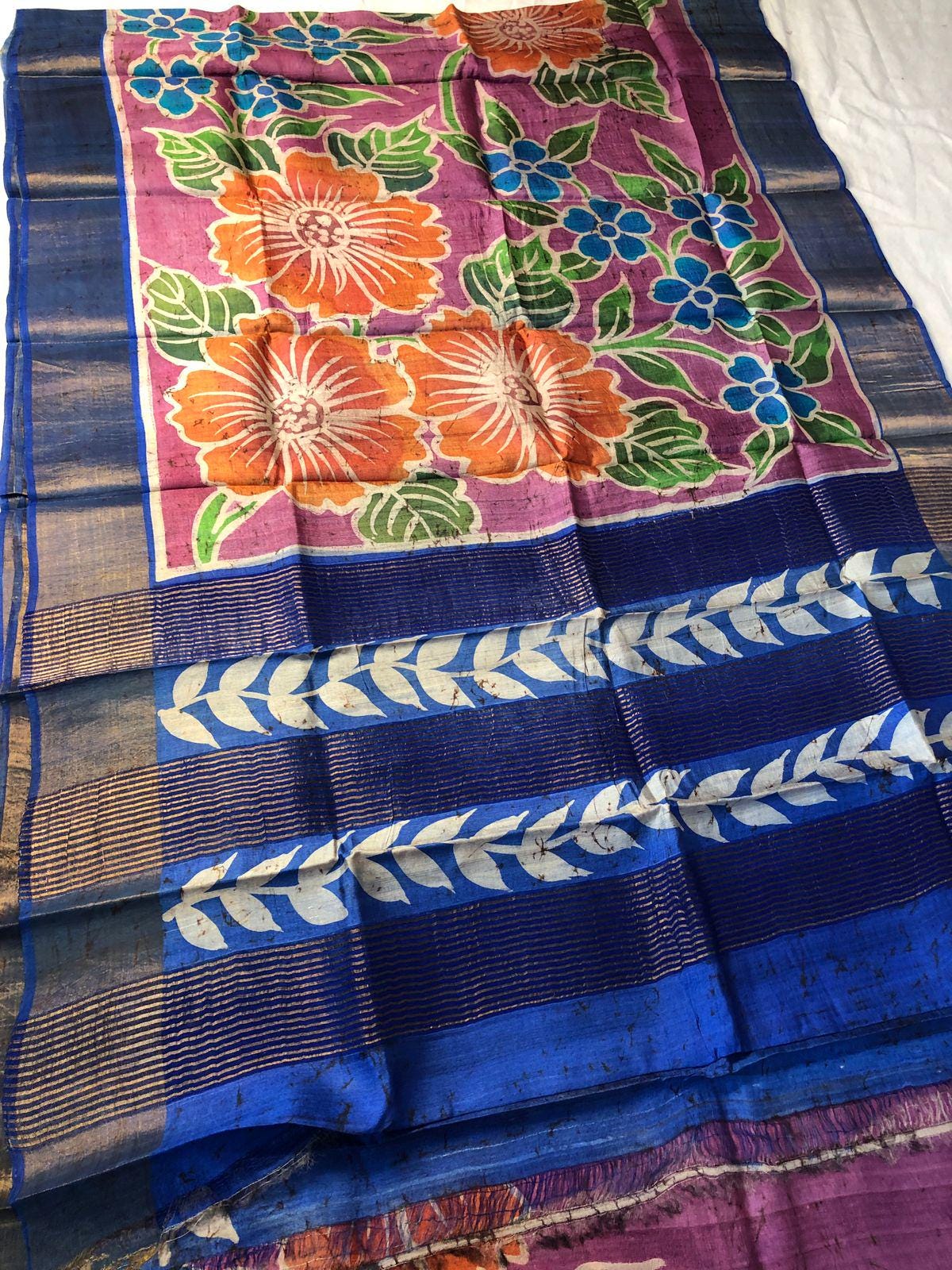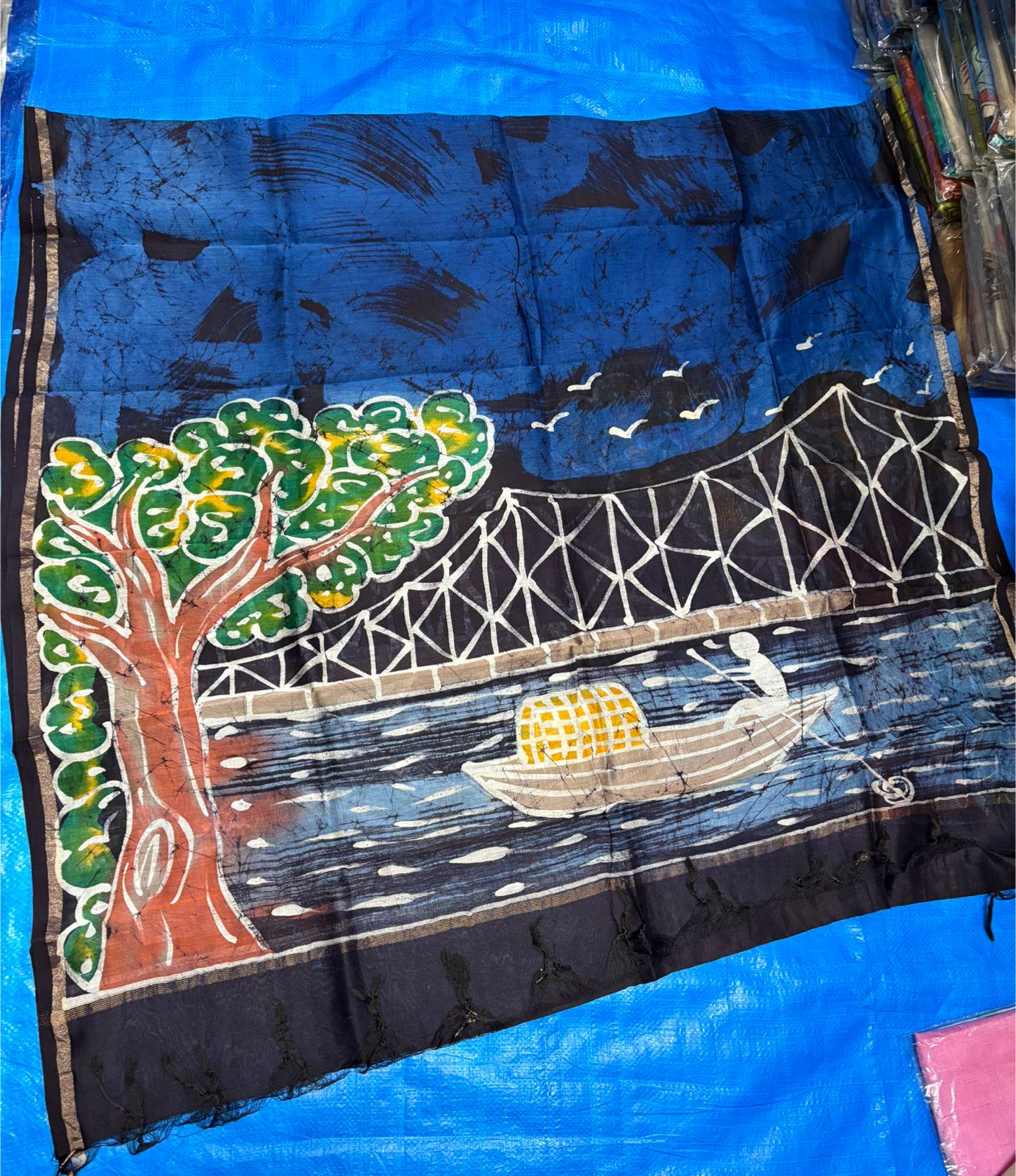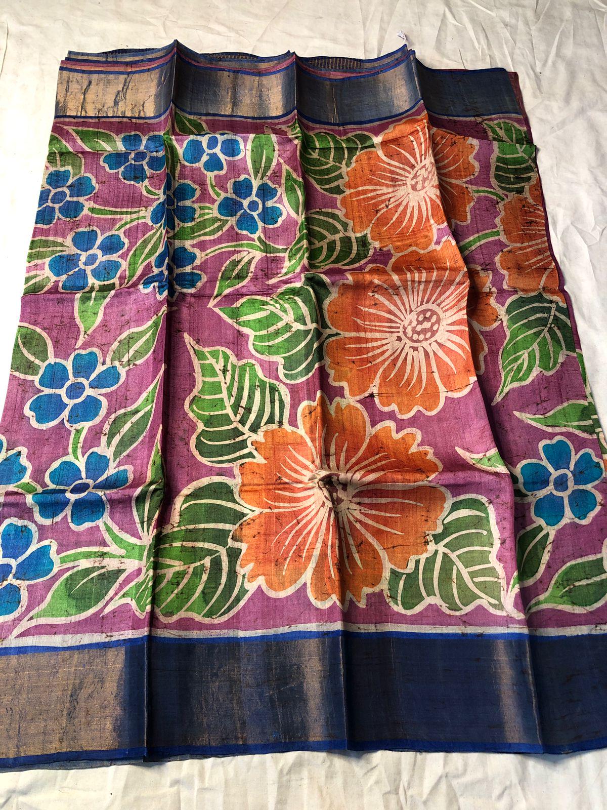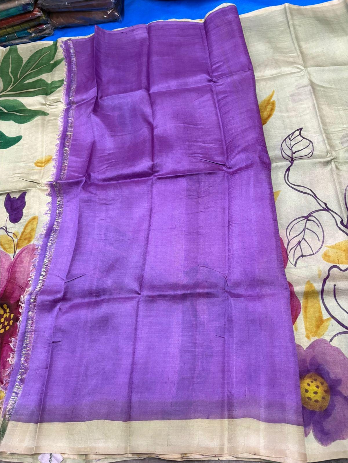 Experience the raw, organic elegance of Pure Tussar Silk. This handcrafted masterpiece features an ethereal hand-painted design, meticulously applied to a premium handloom base by our master artisans.