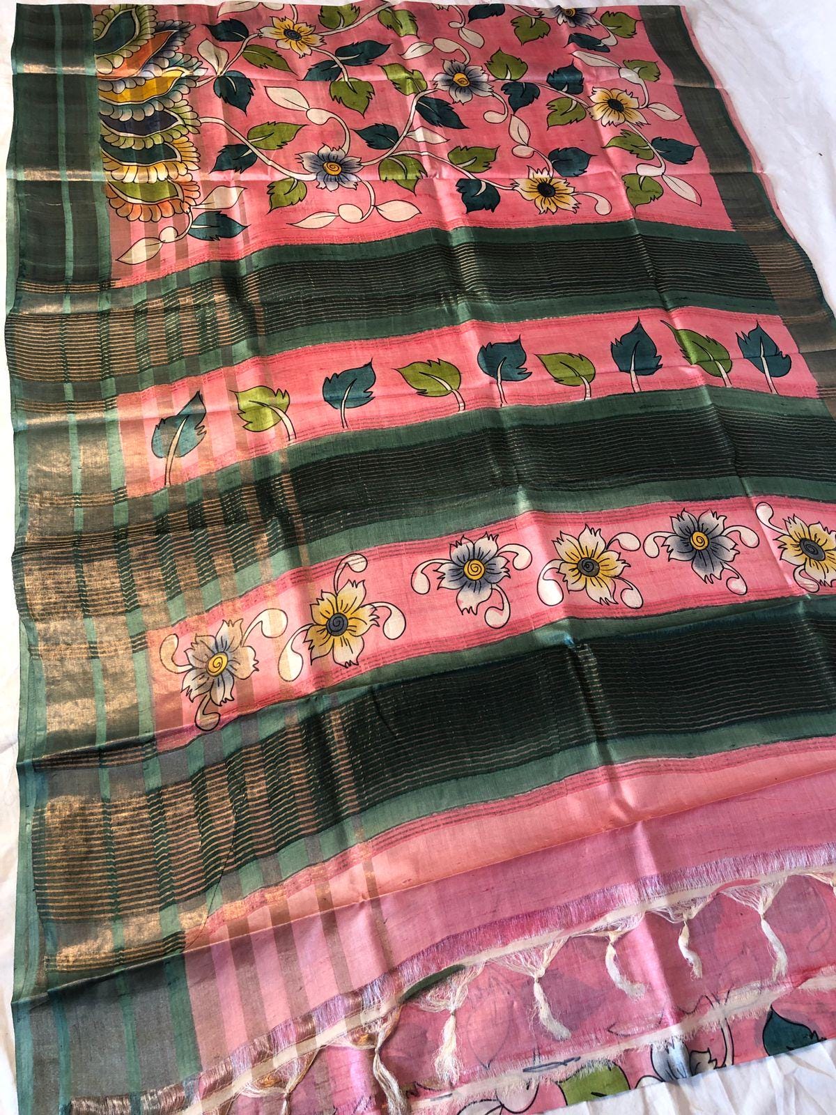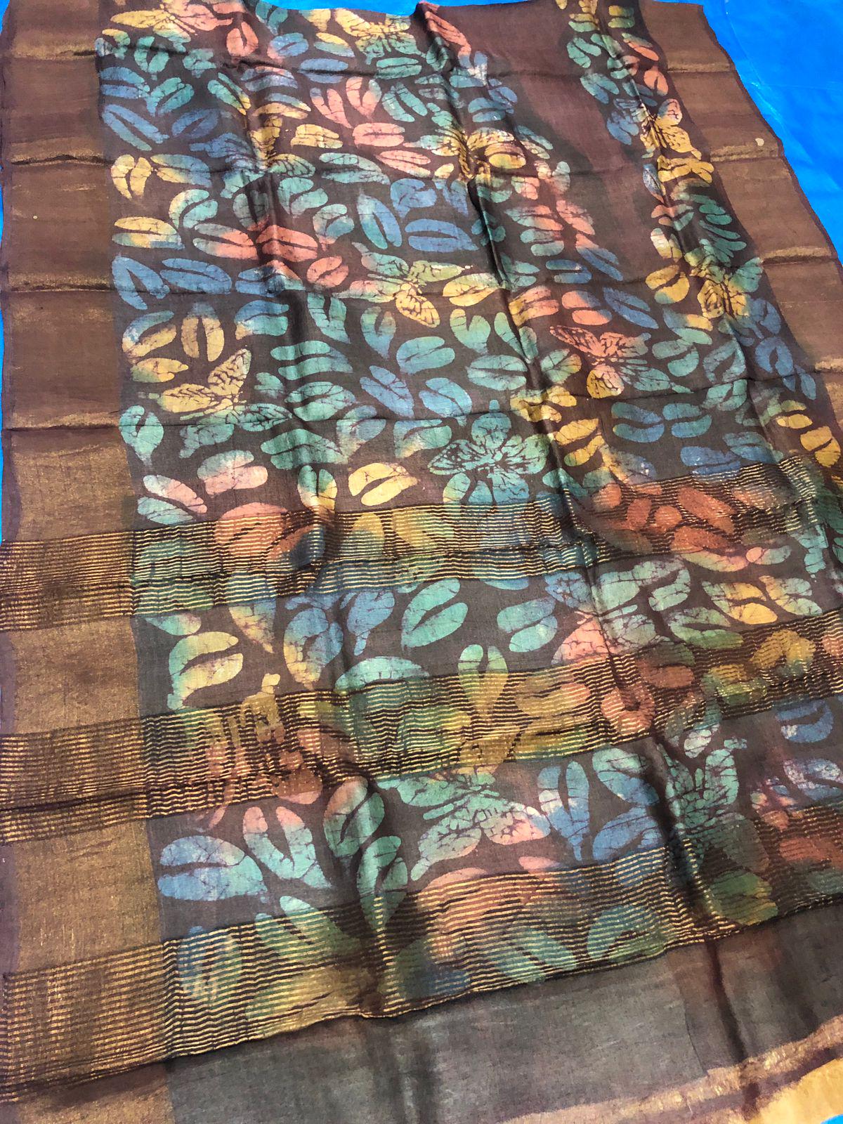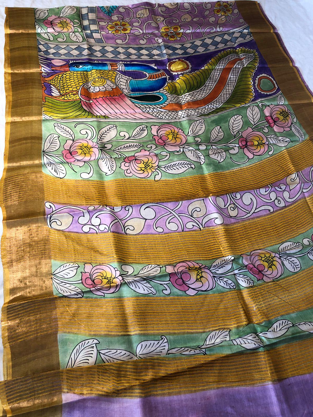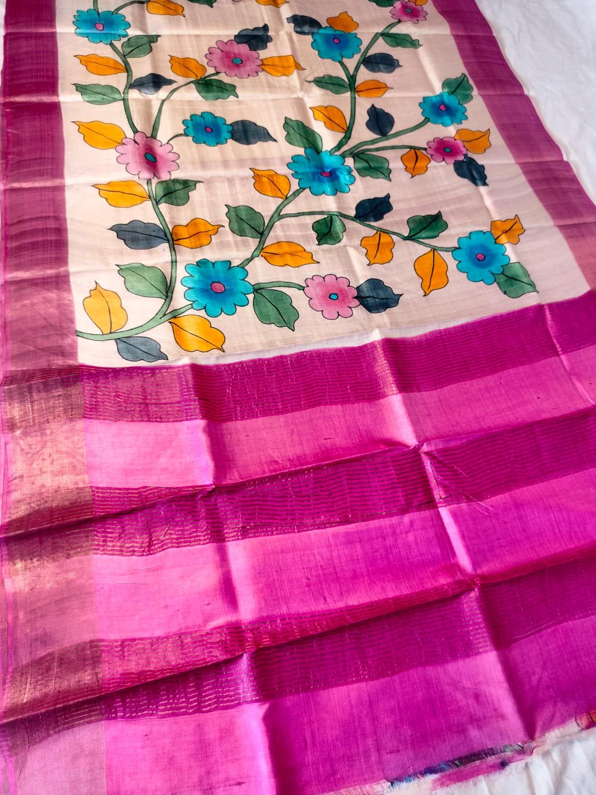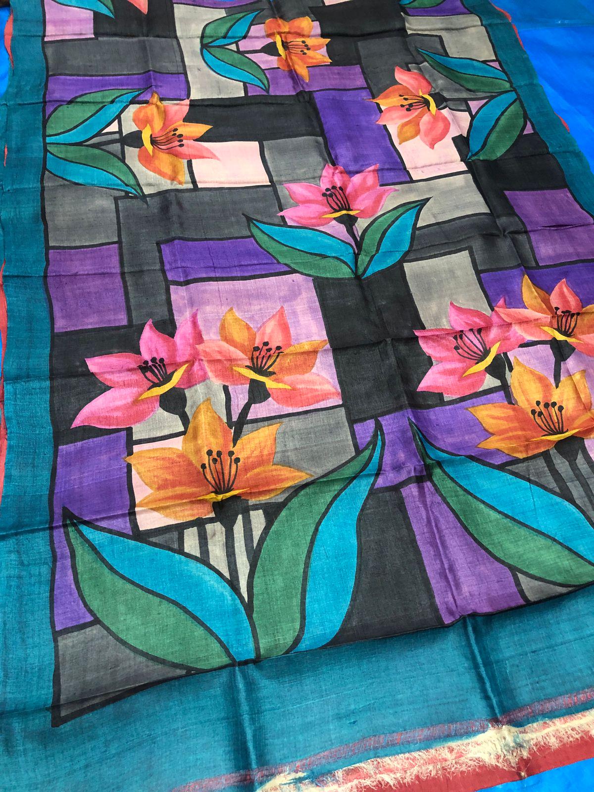 Experience the raw, organic elegance of Pure Tussar Silk. This handcrafted masterpiece features an ethereal hand-painted design, meticulously applied to a premium handloom base by our master artisans.