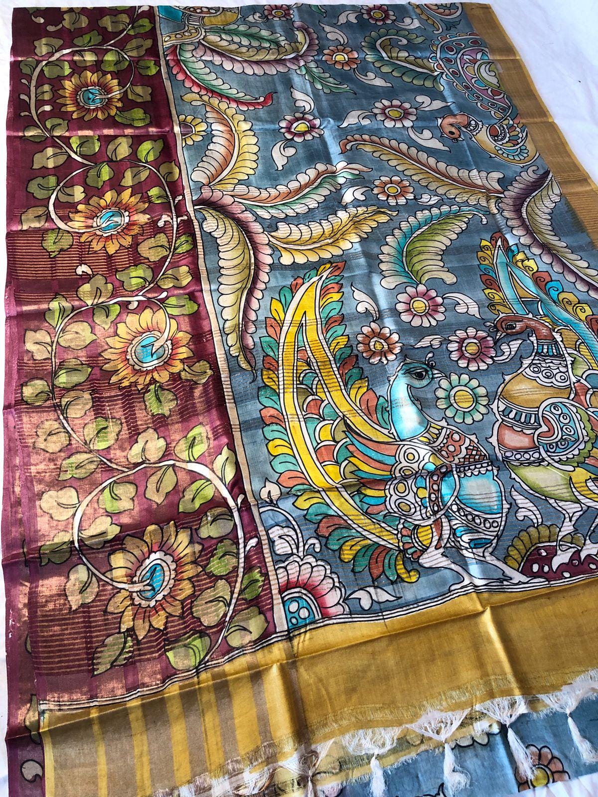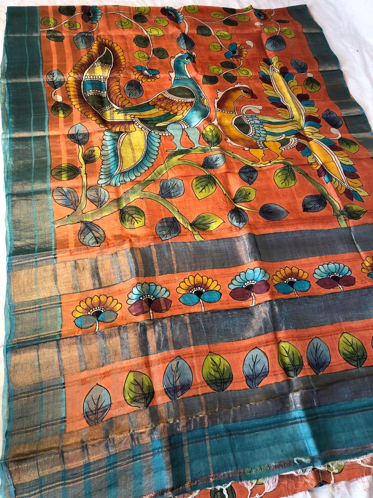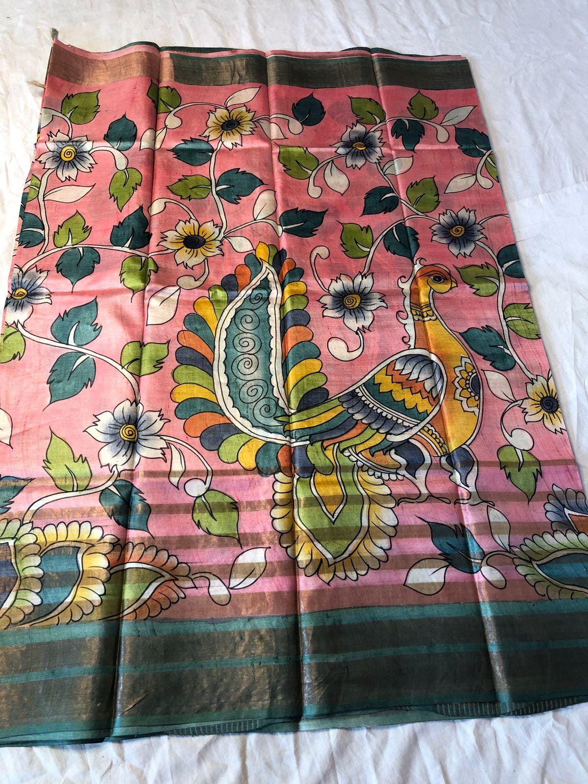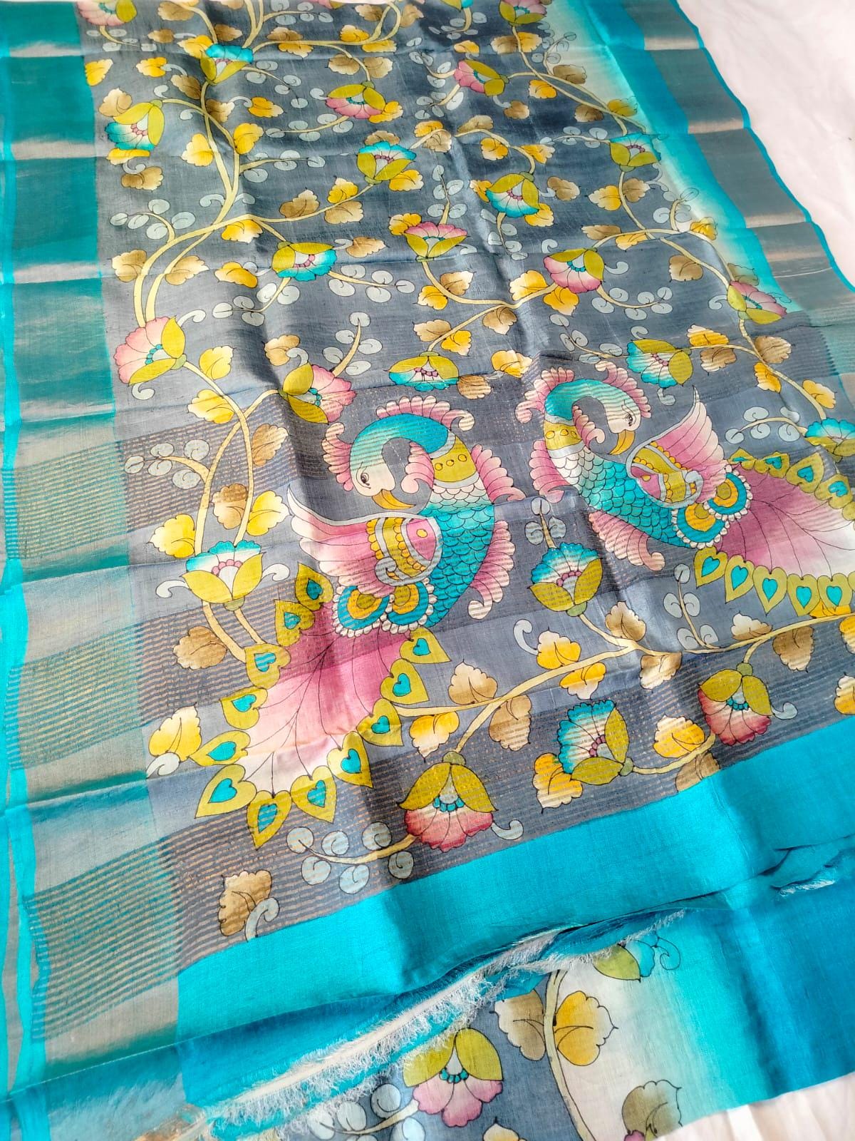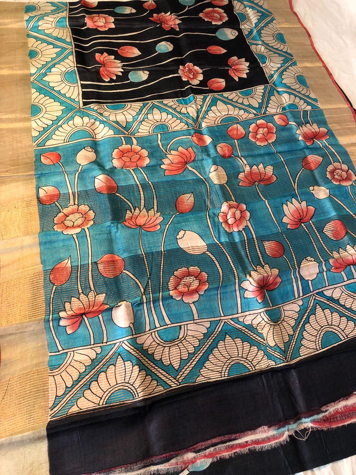 Experience the raw, organic elegance of Pure Tussar Silk. This handcrafted masterpiece features an ethereal hand-painted design, meticulously applied to a premium handloom base by our master artisans.