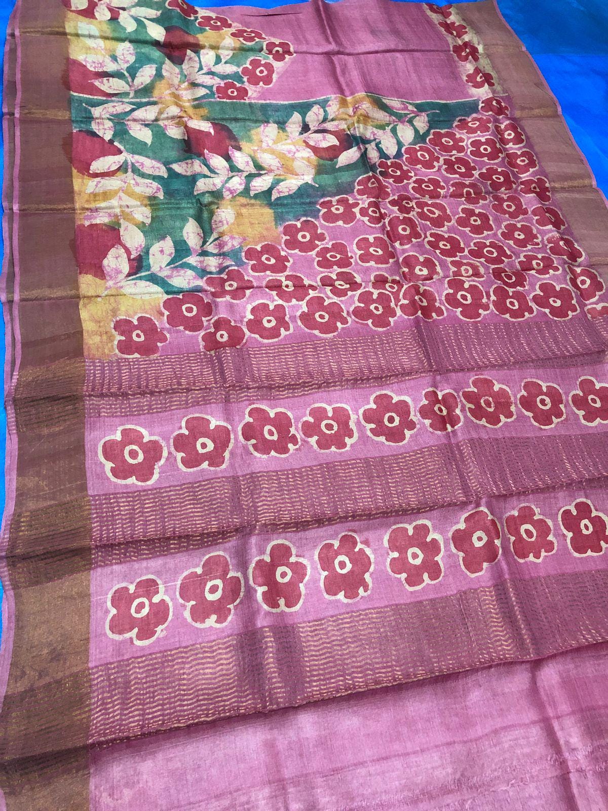 • Hand-Painted Artistry: Unlike printed sarees, each floral motif is hand-painted, ensuring that no two pieces are exactly alike—a true signature of The Upcycling Story.
