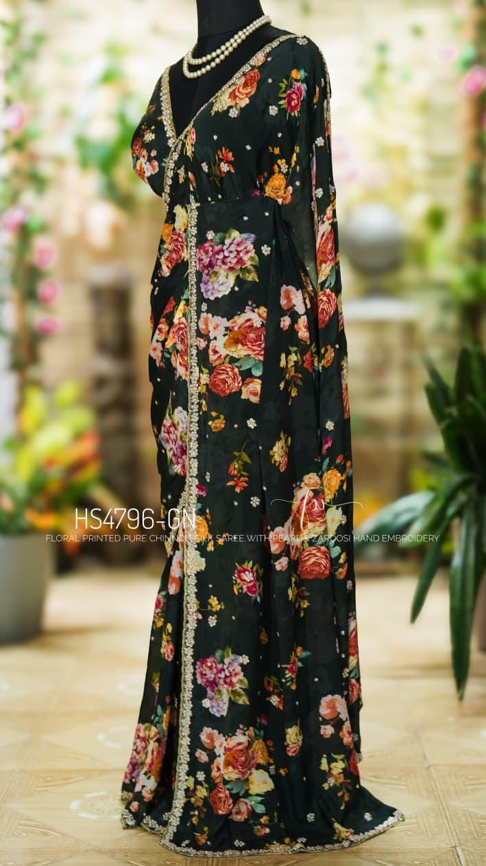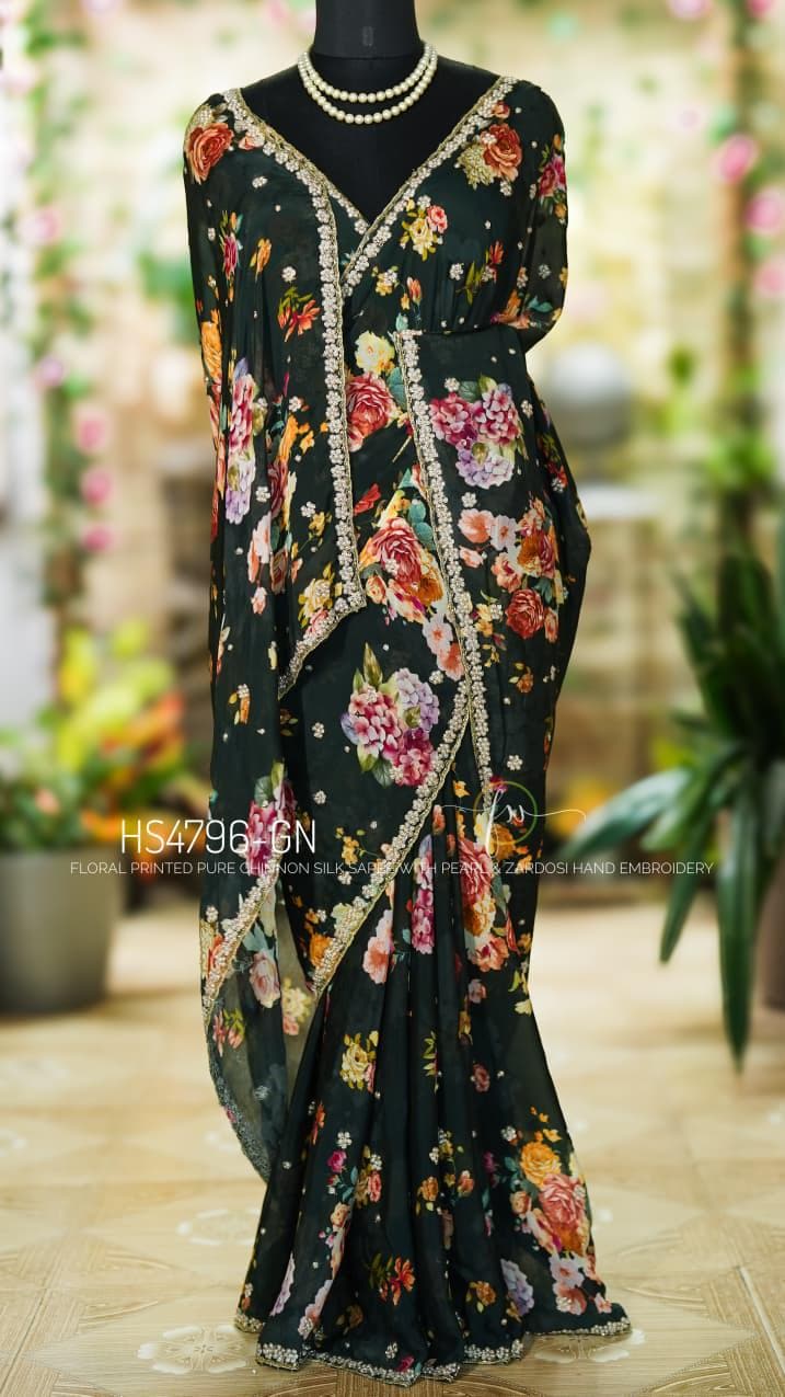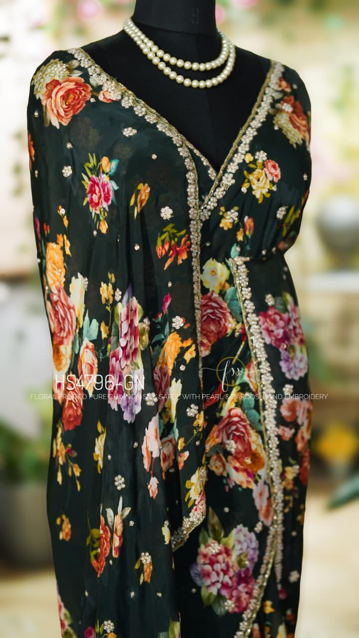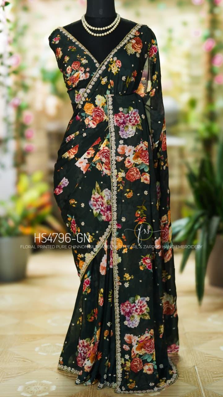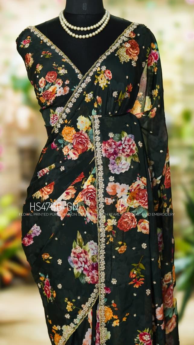 Step into effortless grace with our Floral Handwork Edit. This pure Chinon Silk masterpiece is designed for the modern woman who values the fusion of soft, breezy prints and the opulent texture of traditional Indian needlework.
