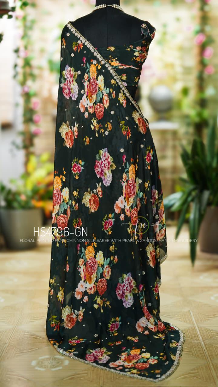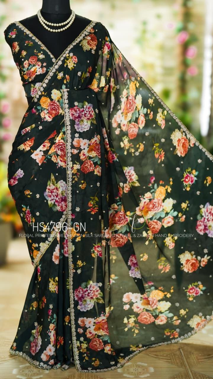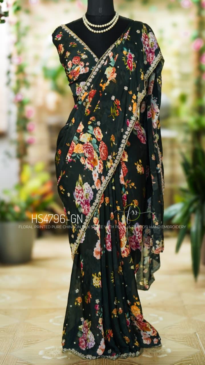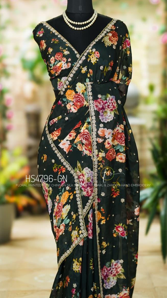 Step into effortless grace with our Floral Handwork Edit. This pure Chinon Silk masterpiece is designed for the modern woman who values the fusion of soft, breezy prints and the opulent texture of traditional Indian needlework.