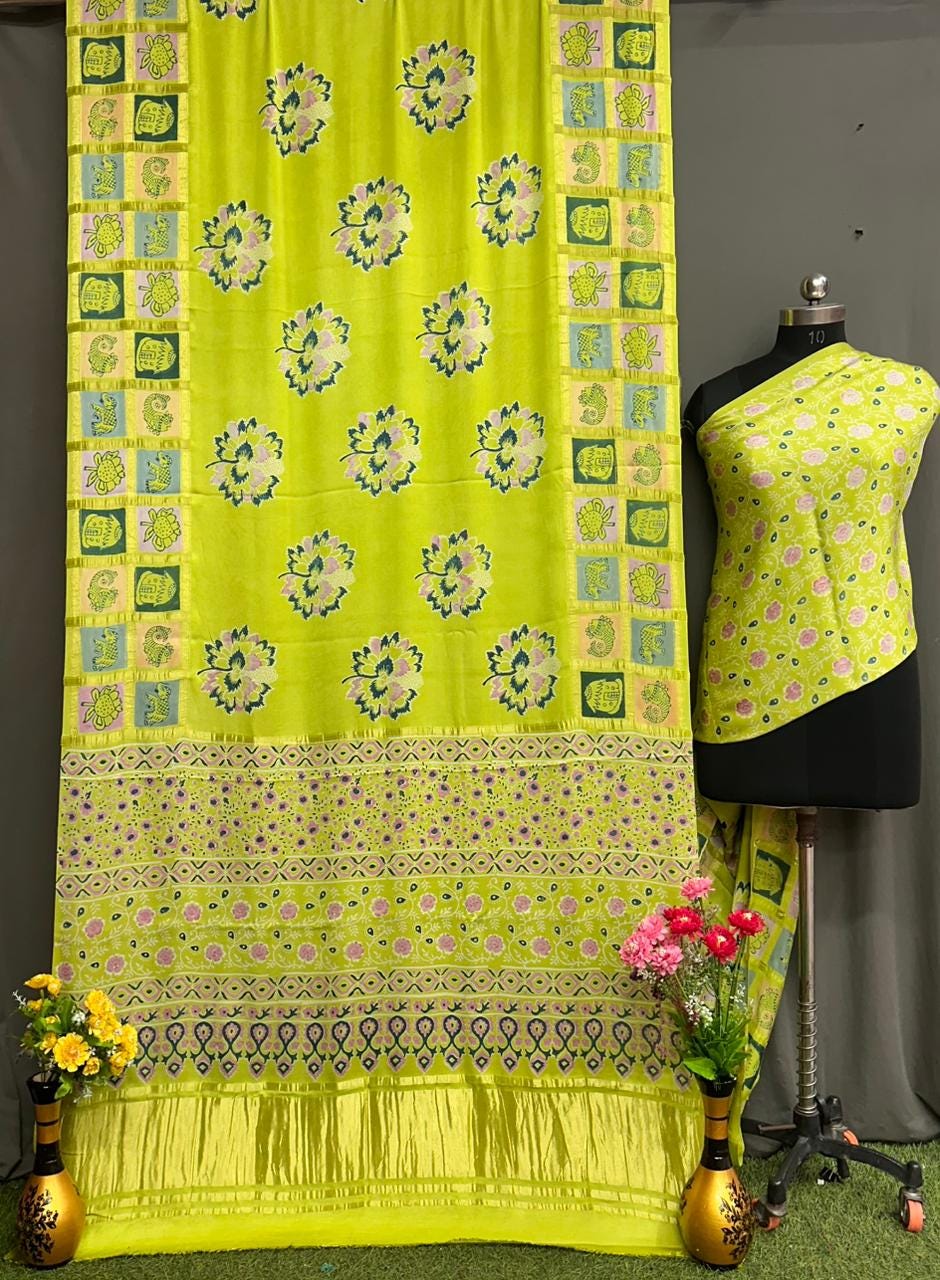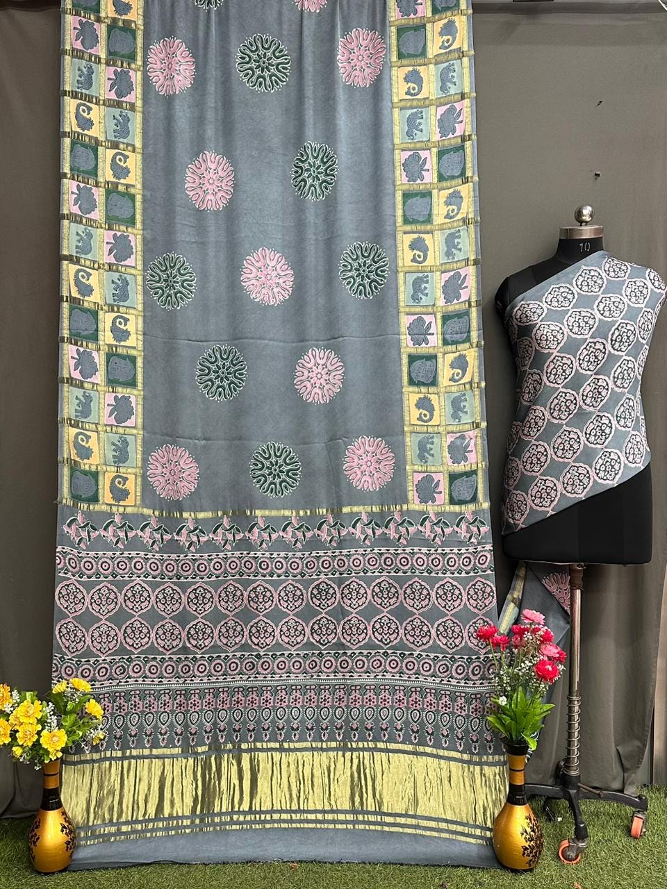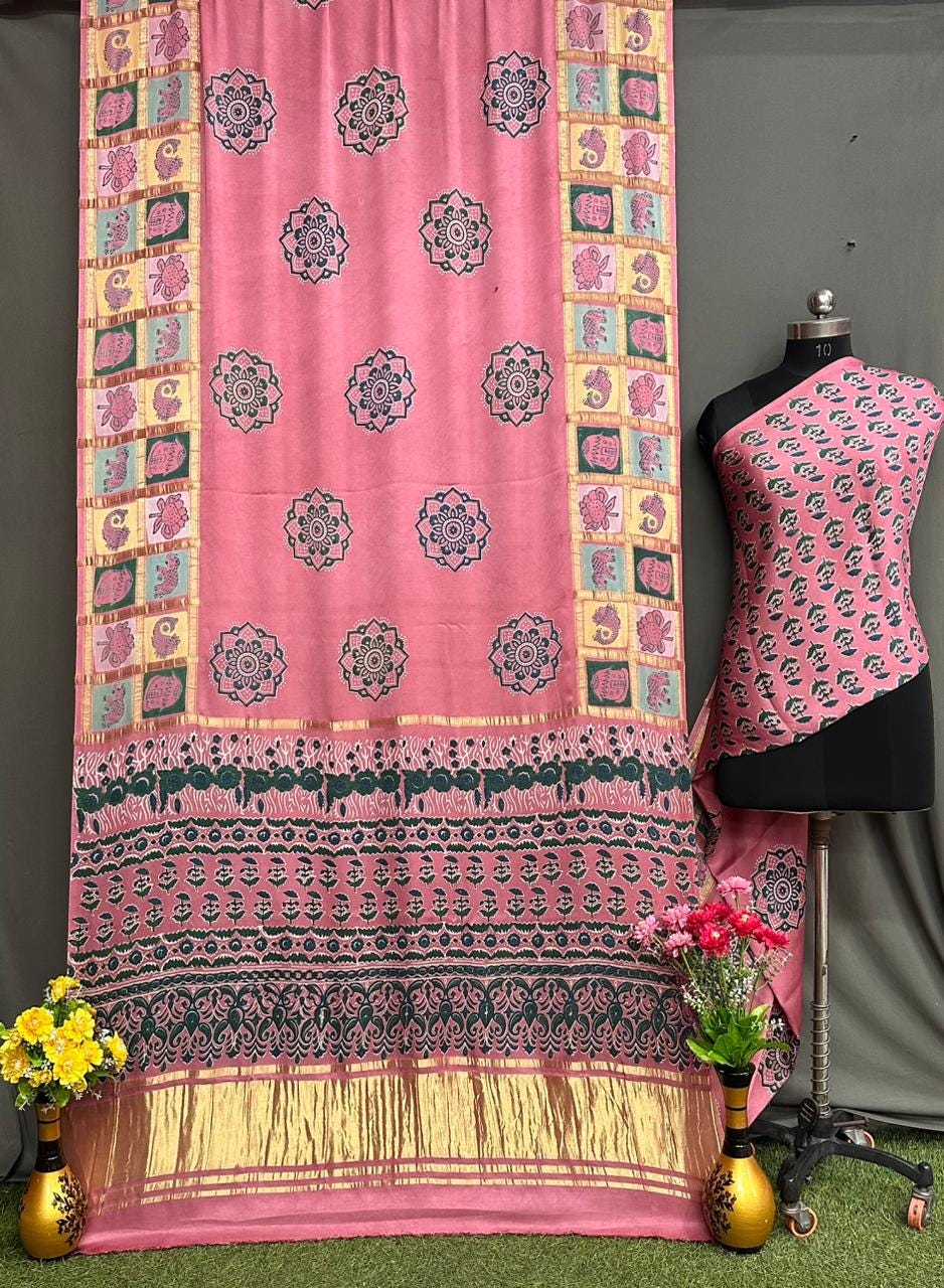 Experience the luxury of heavy modal Silk, adorned with exquisite retro prints and a stunning modal fabric. This saree is a perfect fusion of heritage and contemporary elegance, making it ideal for weddings, festive occasions, and grand celebrations. A timeless masterpiece for your ethnic collection!