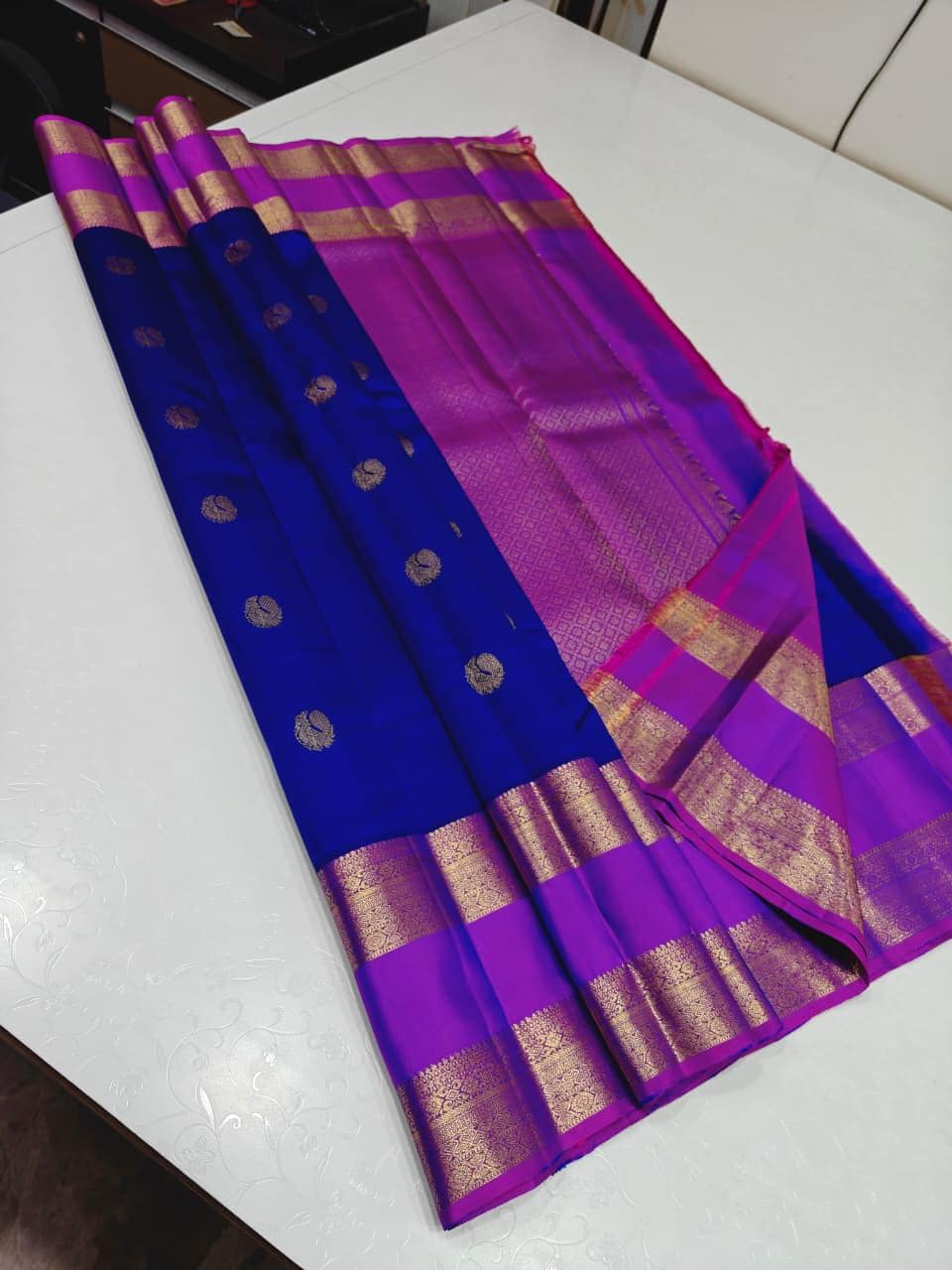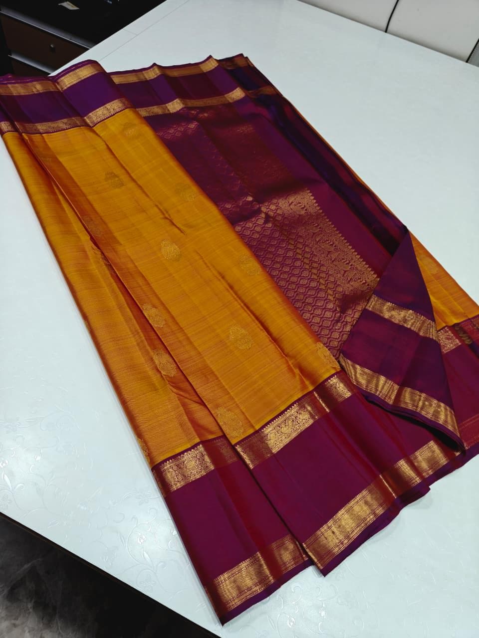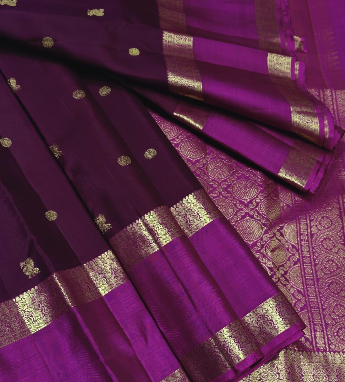 Drape yourself in timeless elegance with this 2 Gram Gold Kancheepuram Handloom Silk Saree, a masterpiece woven by skilled artisans of South India. Crafted from rich silk and adorned with pure zari work, this saree radiates regal charm in its vibrant magenta and golden weave. The intricate motifs and traditional border make it a perfect choice for weddings, bridal wear, temple occasions, and festive celebrations.