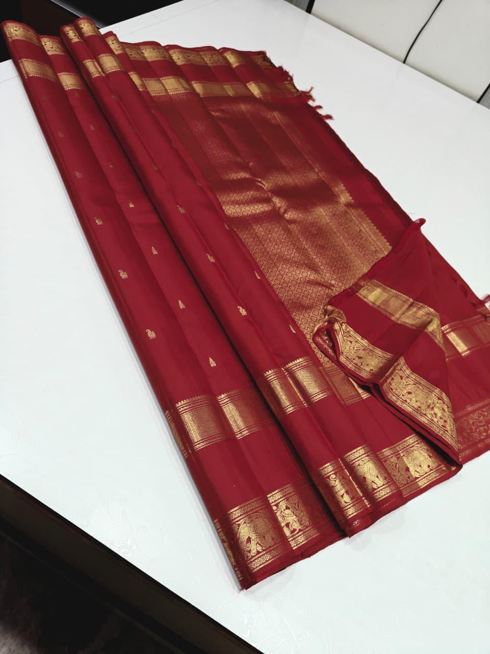 This luxurious pattu saree is lightweight yet grand, ensuring comfort along with a majestic look. Its golden zari shine adds a royal touch, making it a must-have in every saree lover’s collection. Pair it with gold jewelry for an authentic traditional appearance.