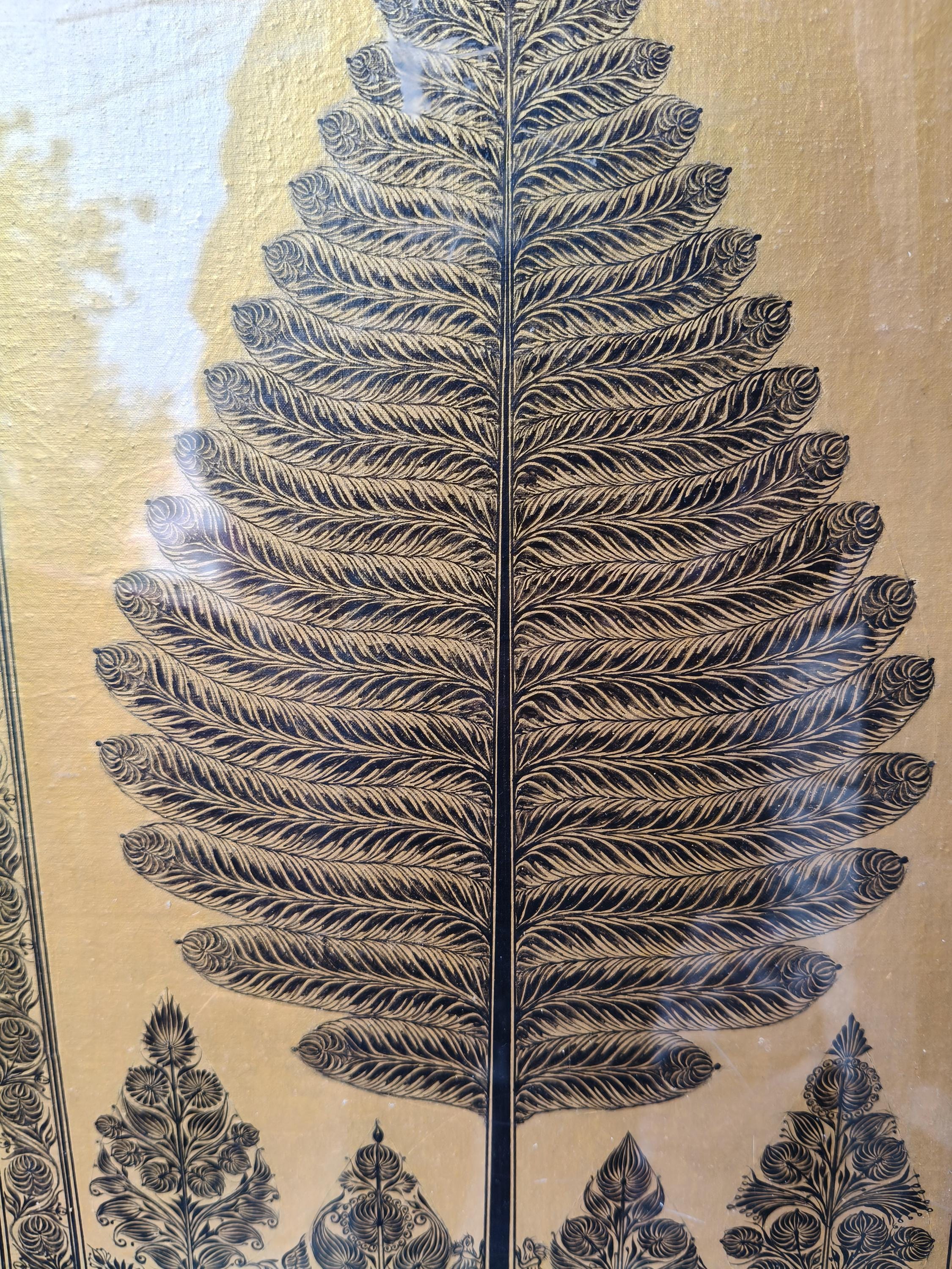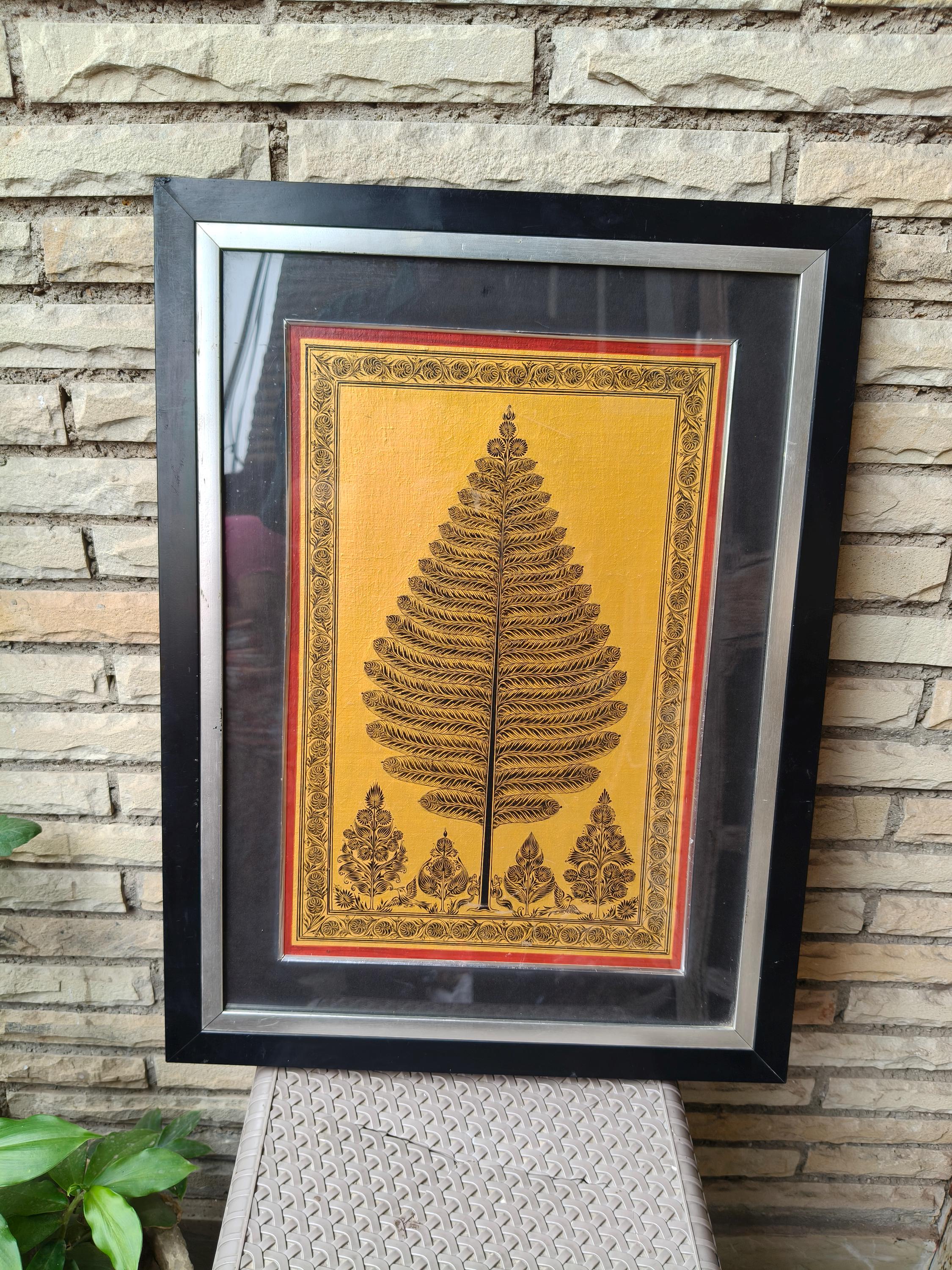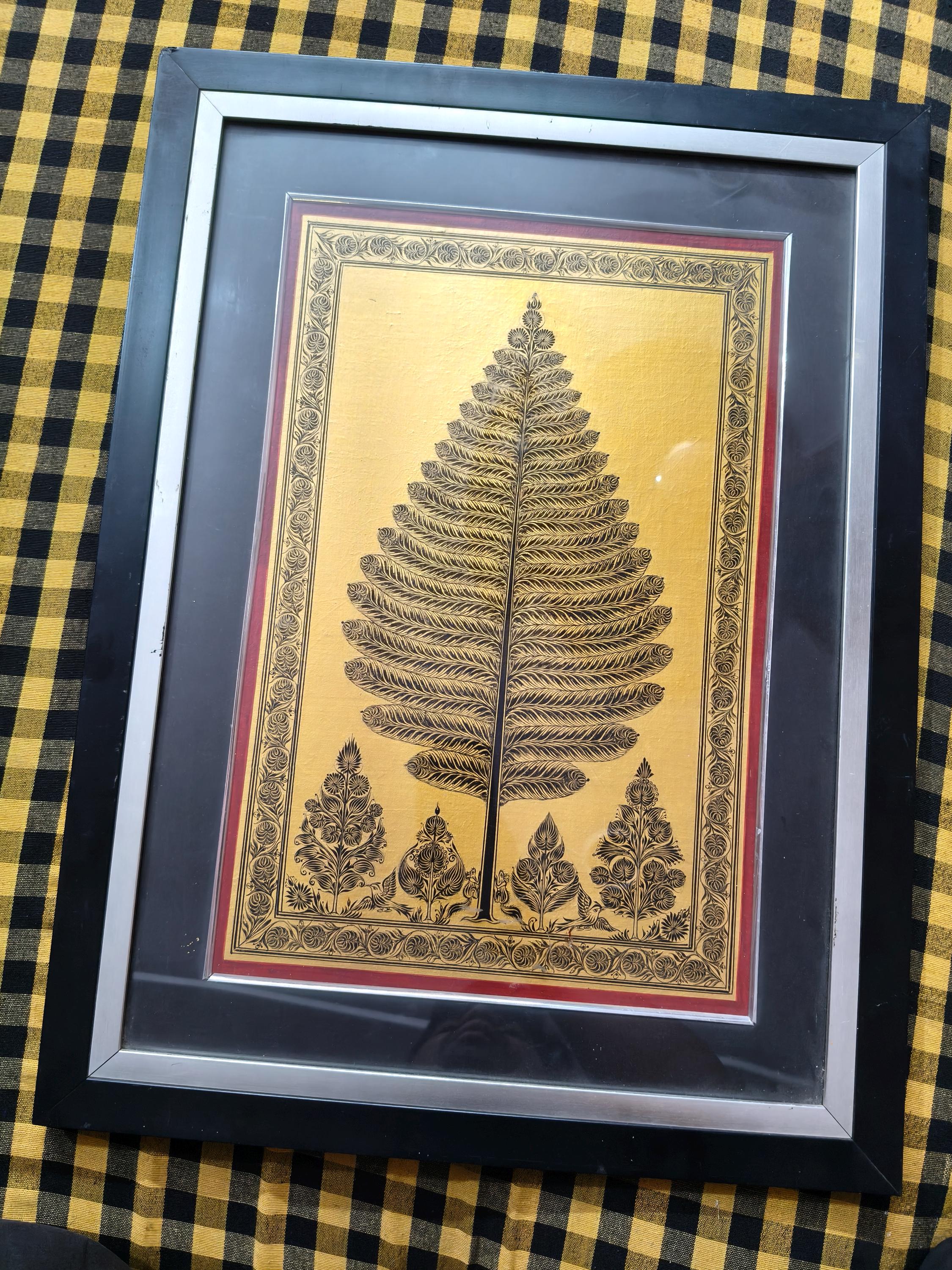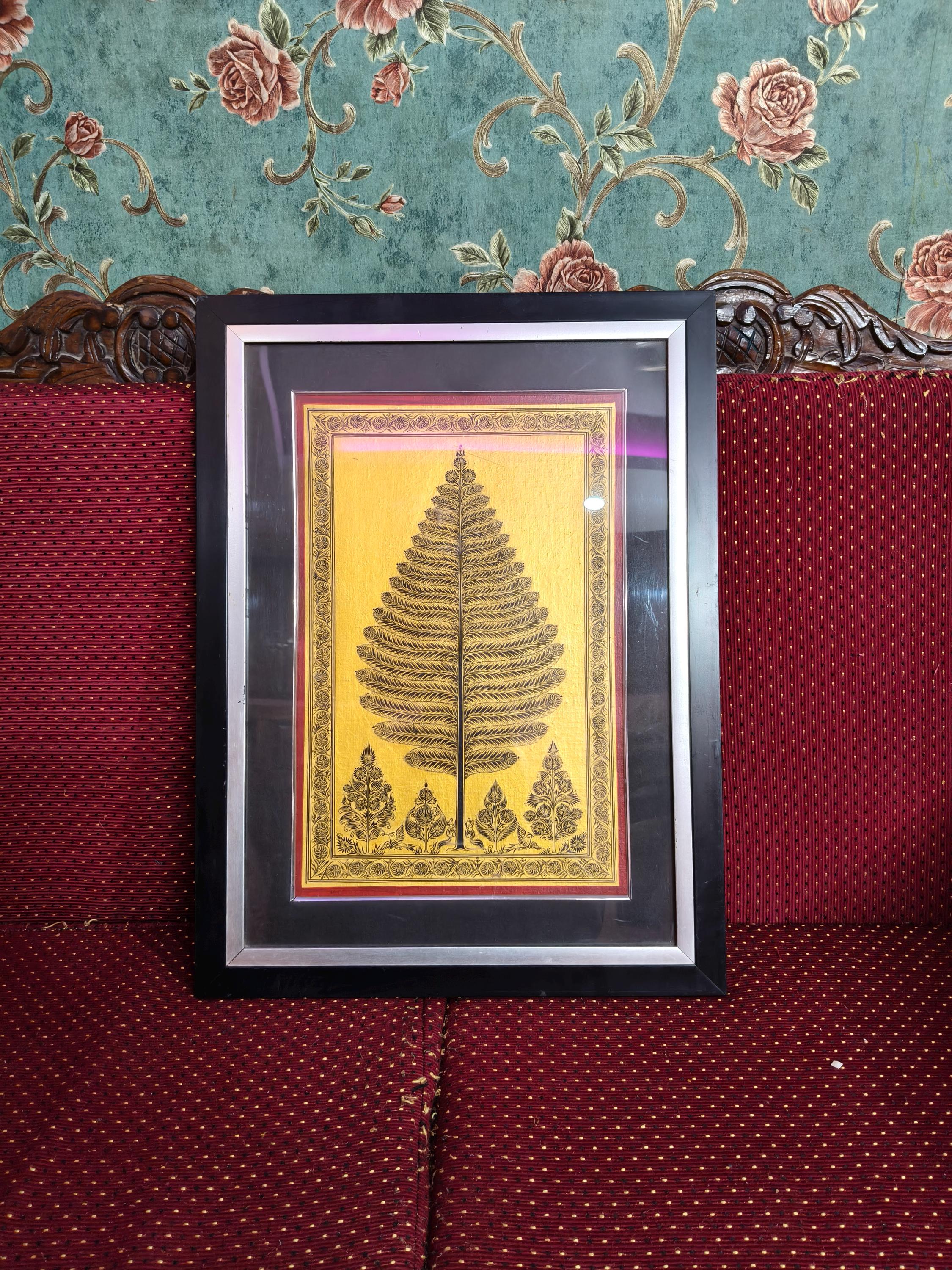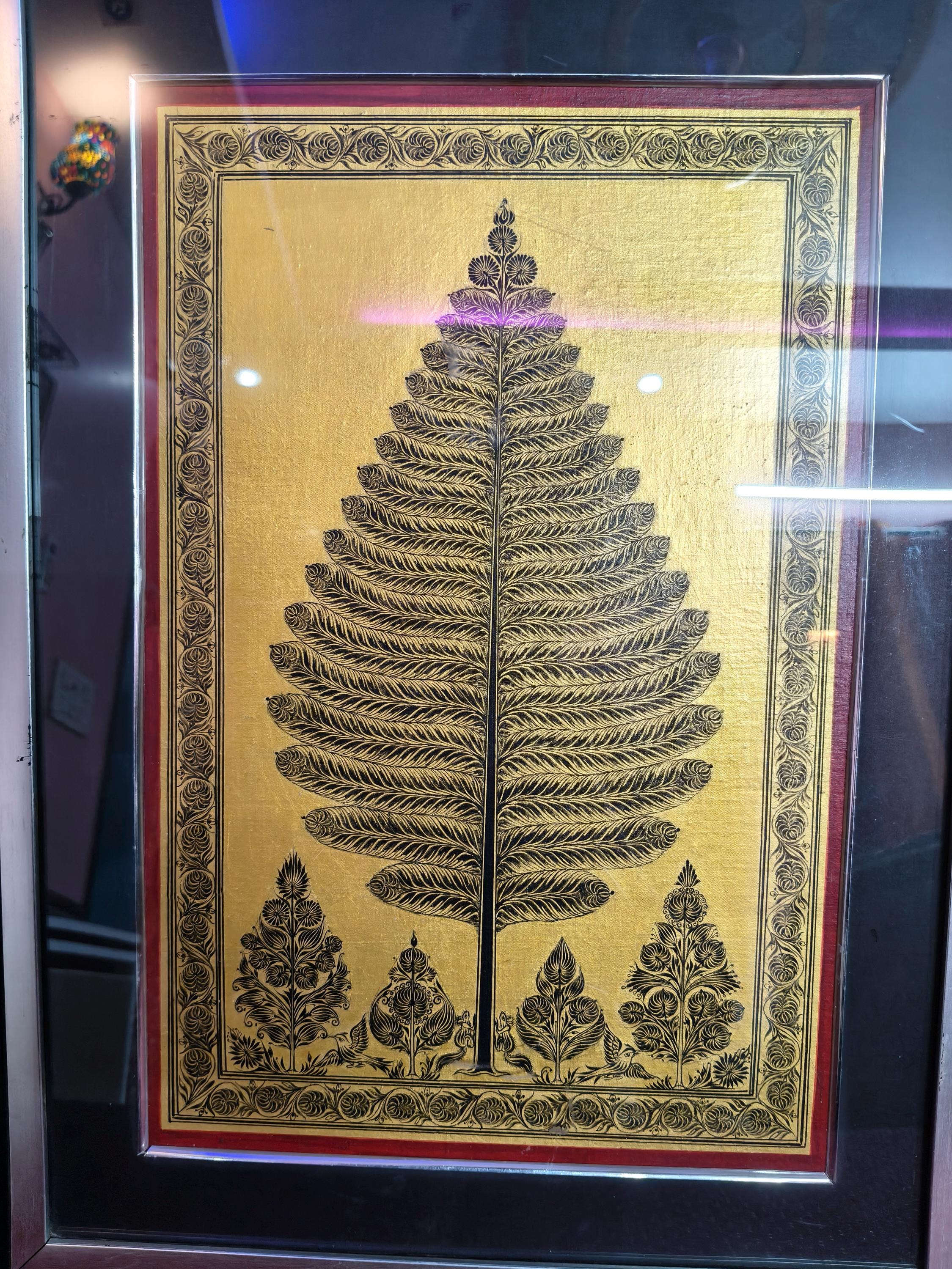 Bring the spiritual energy and golden warmth of authentic Indian textile art into your space. This exquisite "Tree of Life" (Kalpavriksha) is meticulously hand-painted directly onto a canvas of pure Tussar Silk, celebrated for its rich, natural golden luster.