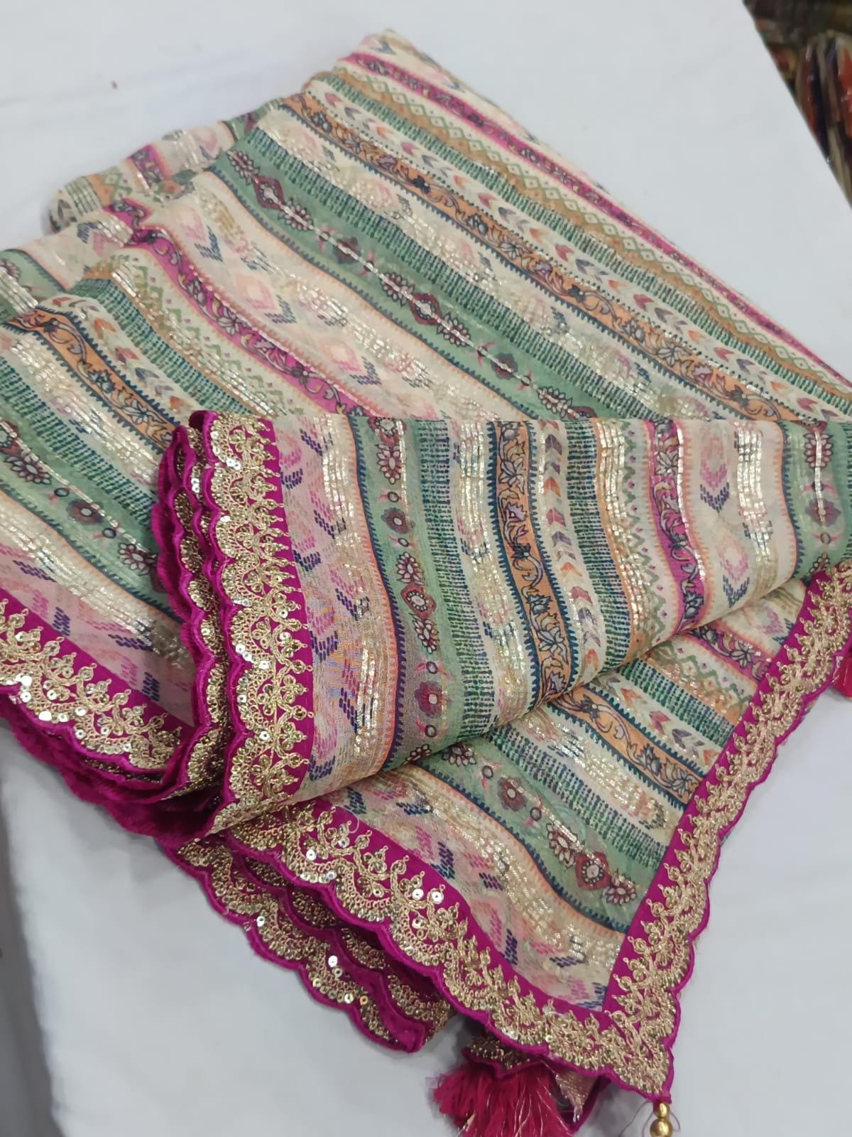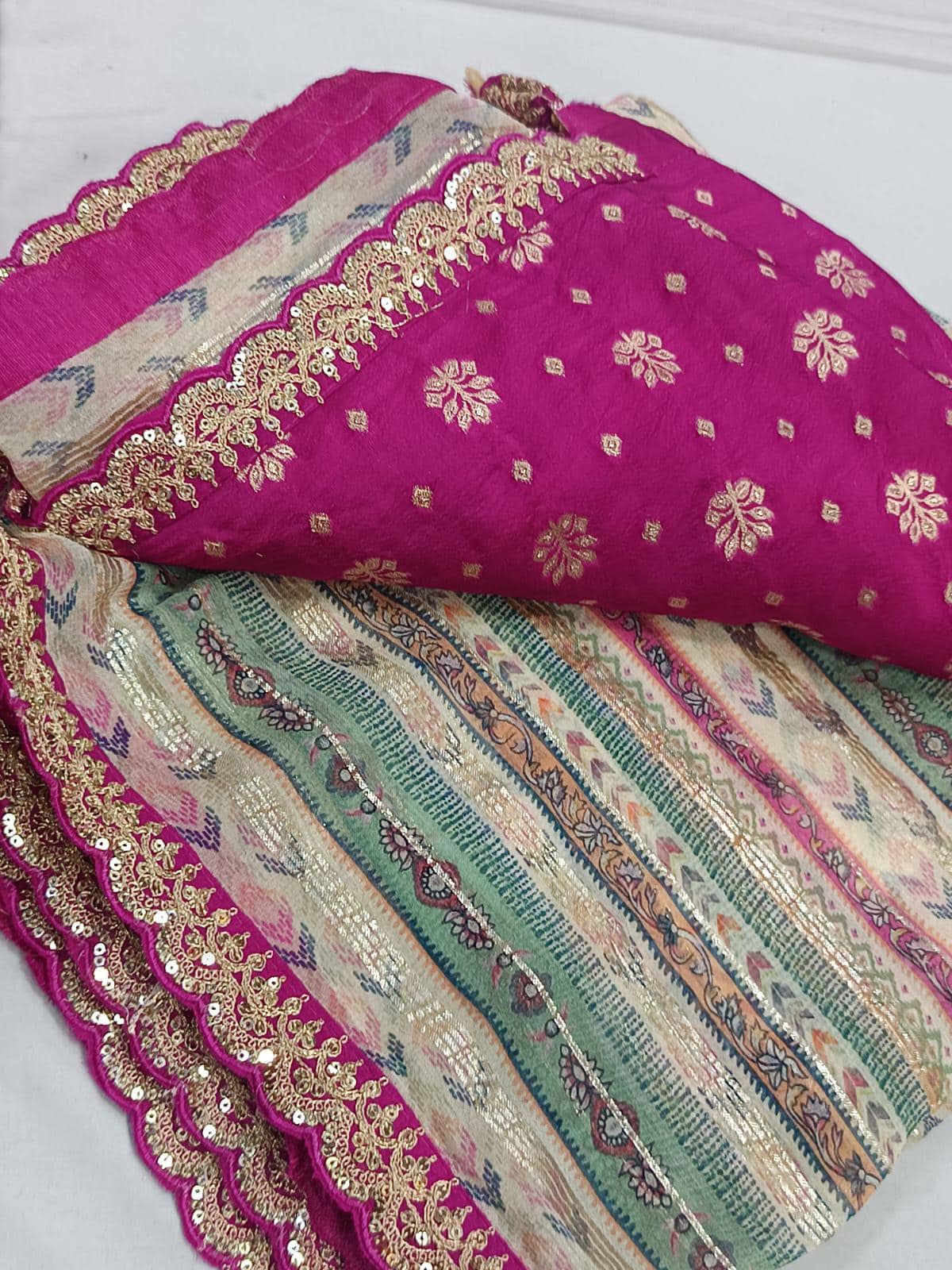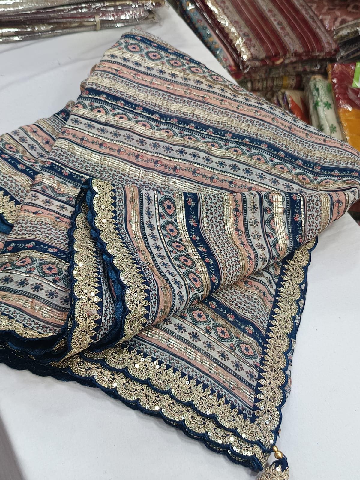 • Designer Scalloped Borders: Finished with an elite, intricately detailed scalloped edge that adds a touch of royal Indian couture to the modern print.