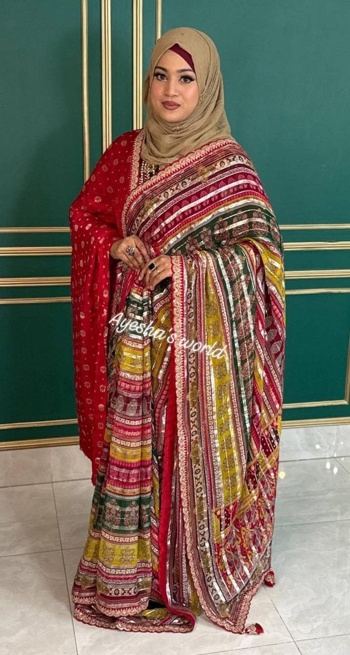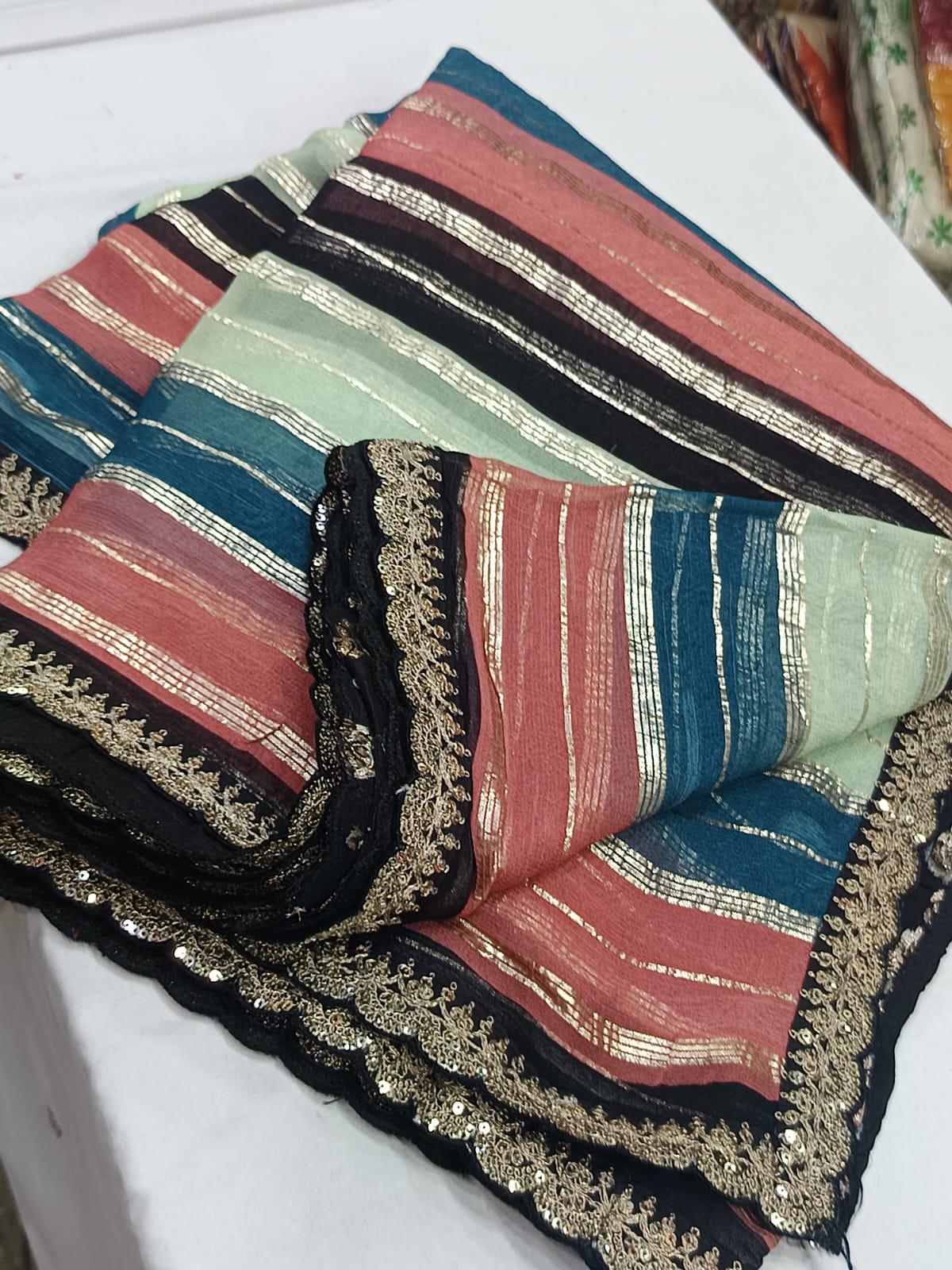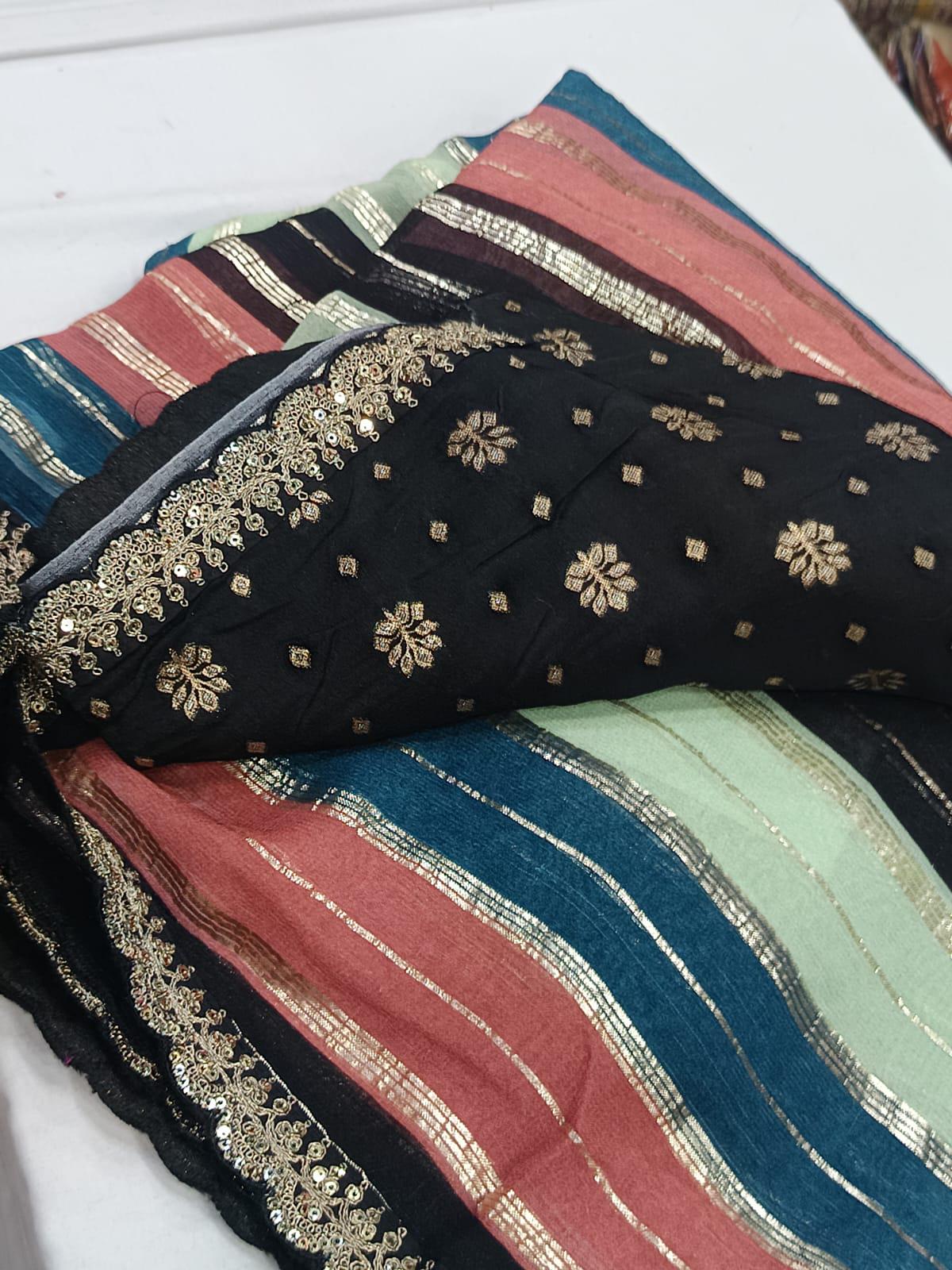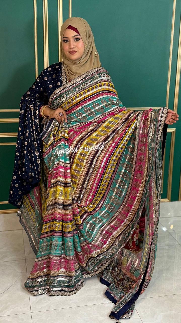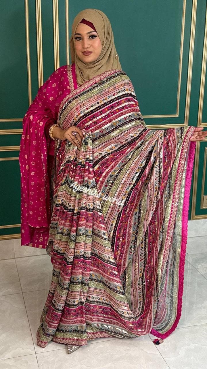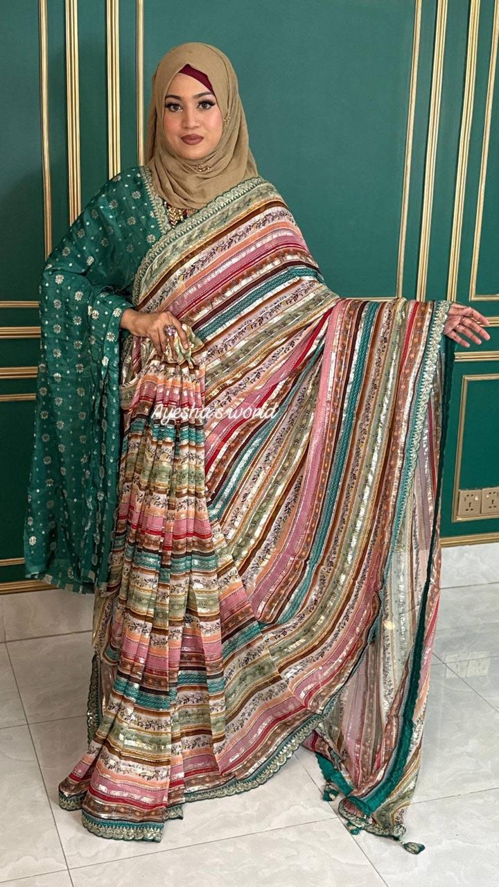 Step into the spotlight with a drape that dances with light. This stunning Georgette saree features a vibrant multi-colored print, interwoven with delicate silver foil striping that runs through the fabric for a sophisticated, high-glamour shimmer.