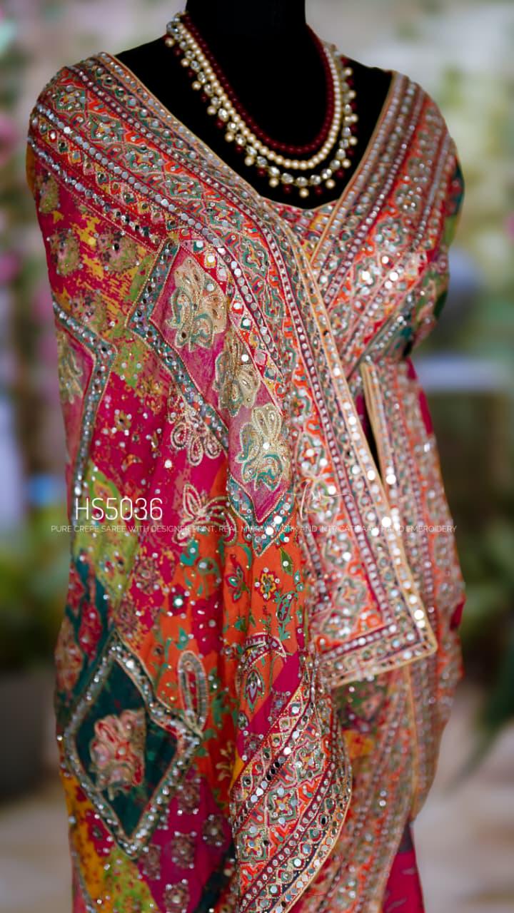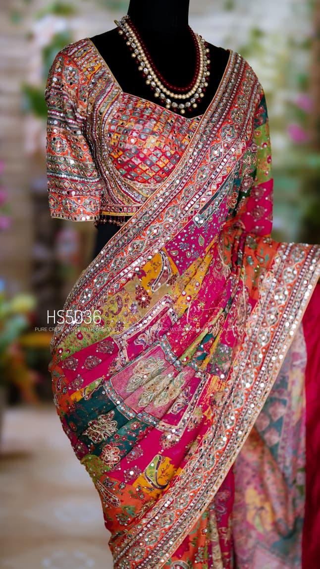 Command the room with effortless, vibrant elegance. This designer Pure Chinnon saree is a rich artistic canvas, featuring a multi-colored Ajrakh patchwork print elevated by breathtaking, heavy hand-embroidery and authentic mirror work.