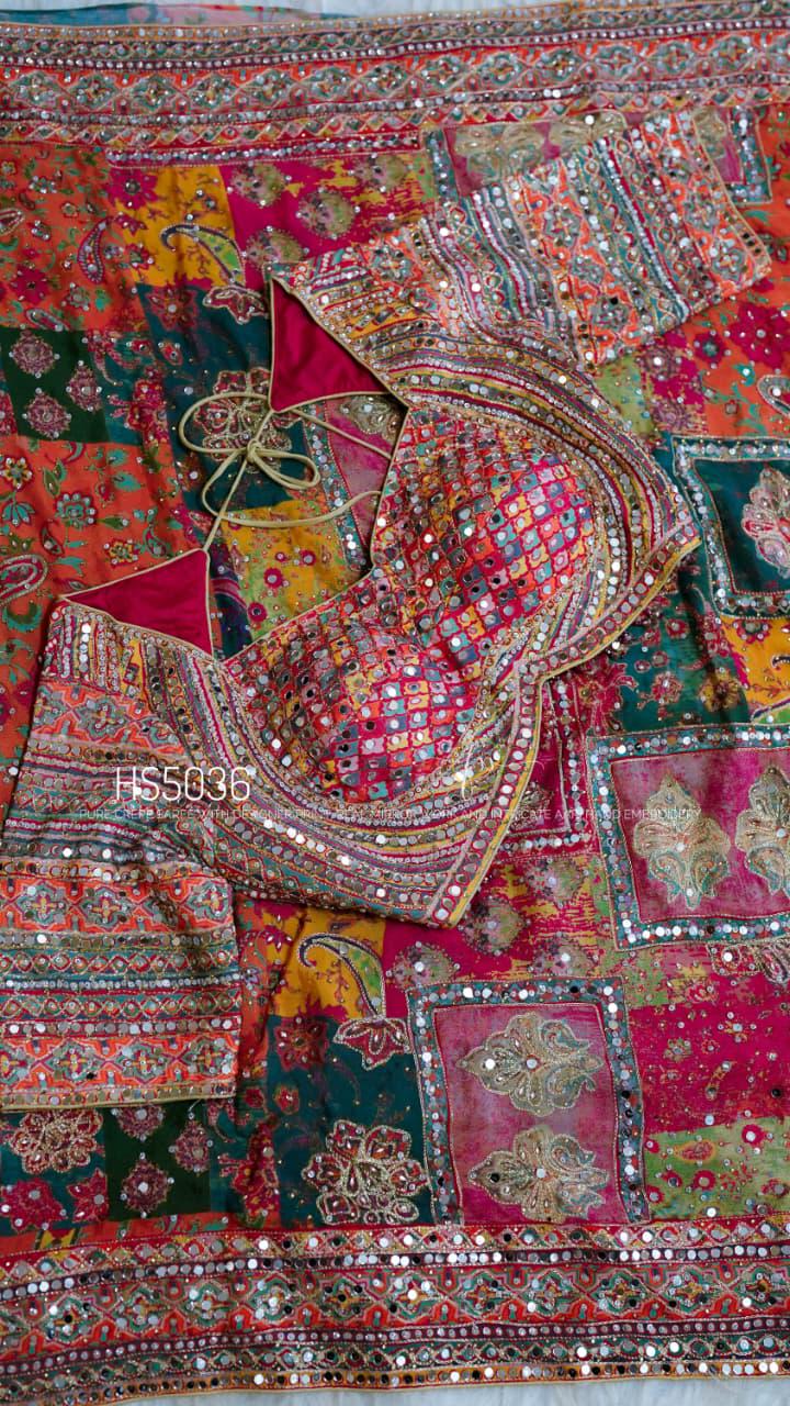 • Real Darpan & Kundan Handwork: Meticulously embellished with authentic real mirrors (darpan), sparkling Kundan stones, and heavy embroidery that shimmers brilliantly under evening lights.