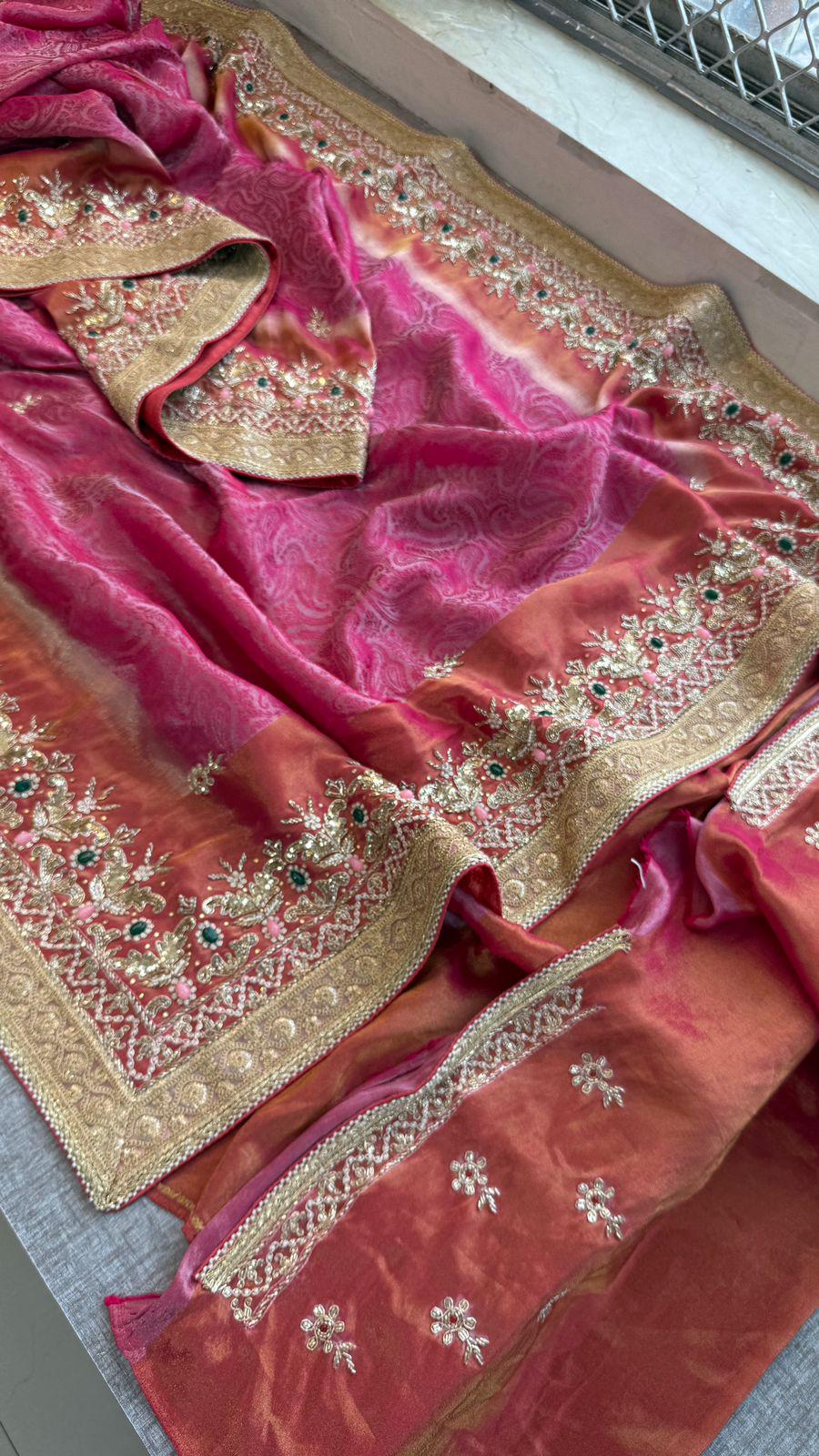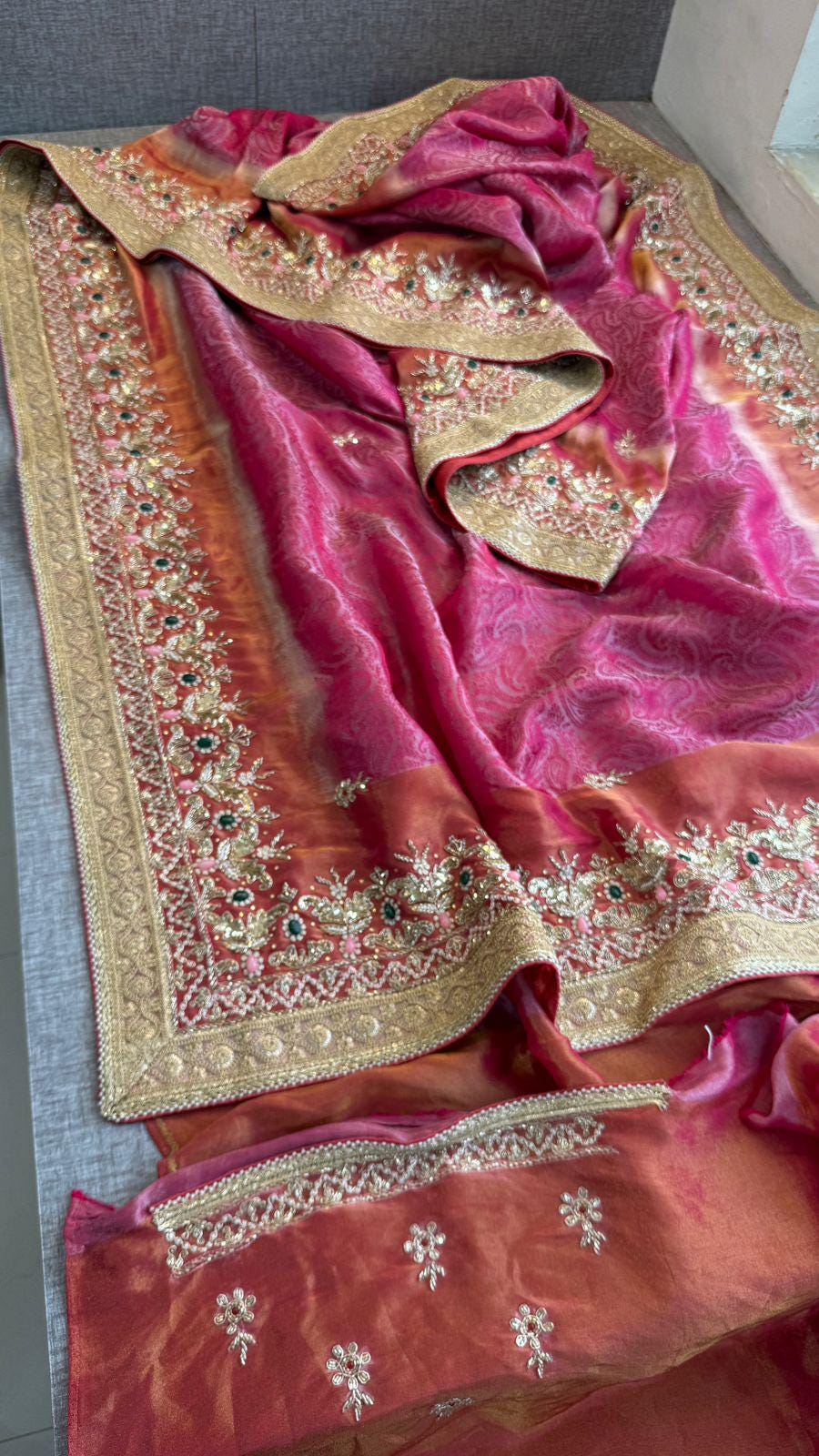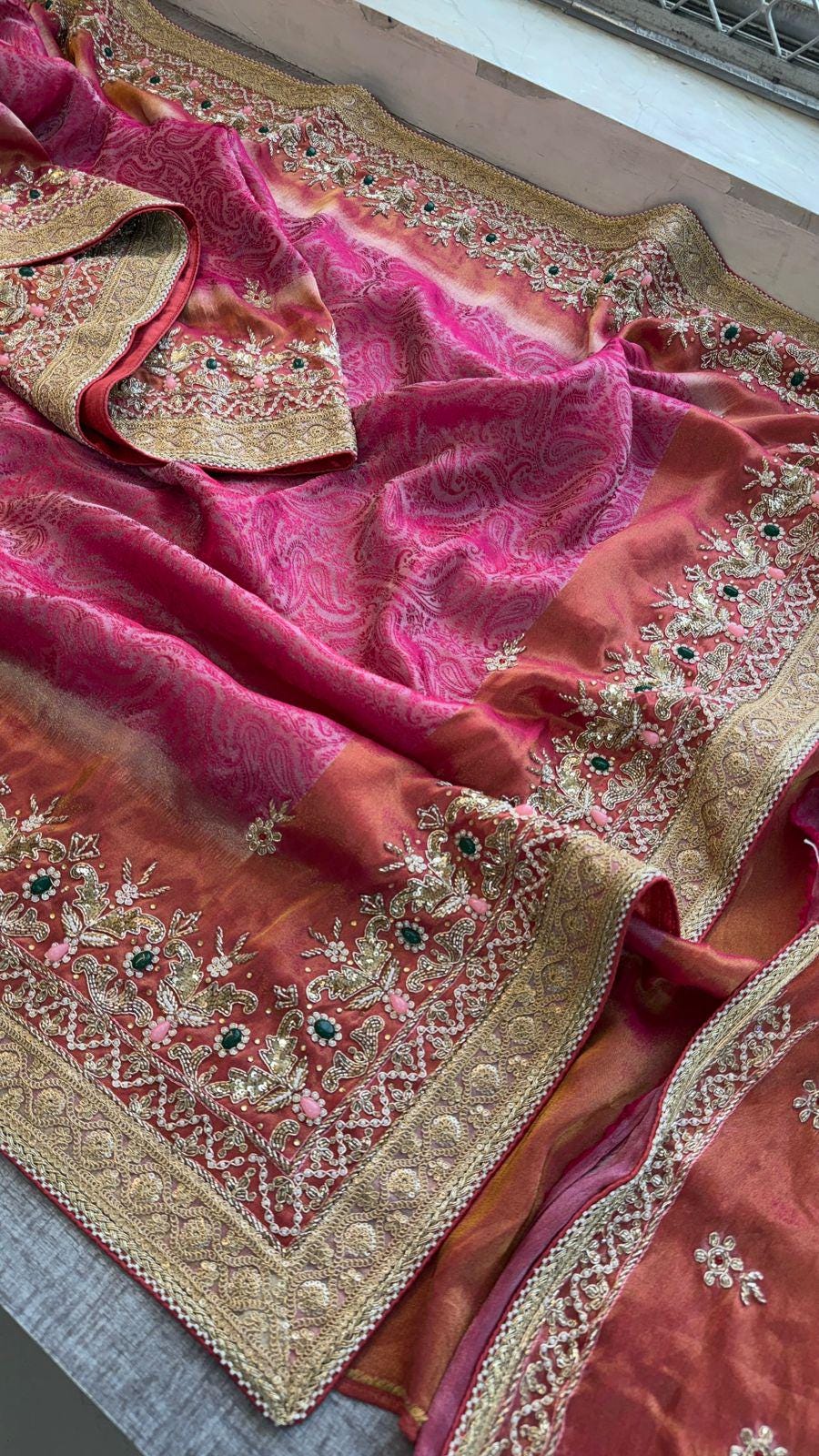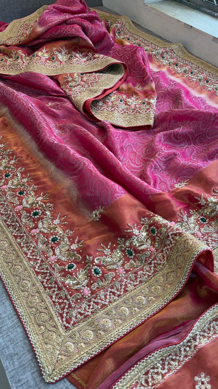 • 7-Element Handwork: Meticulously embellished by master artisans featuring authentic Zardozi metallic threads, sparkling Sequins, glass Kutdana (bugle beads), elegant Pearls, radiant Zarkan (zircons), traditional Gotapatti appliqués, and heavy Stone work.