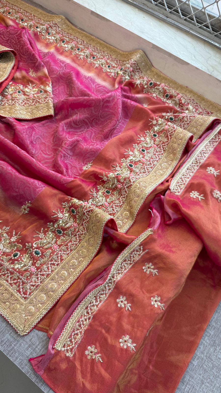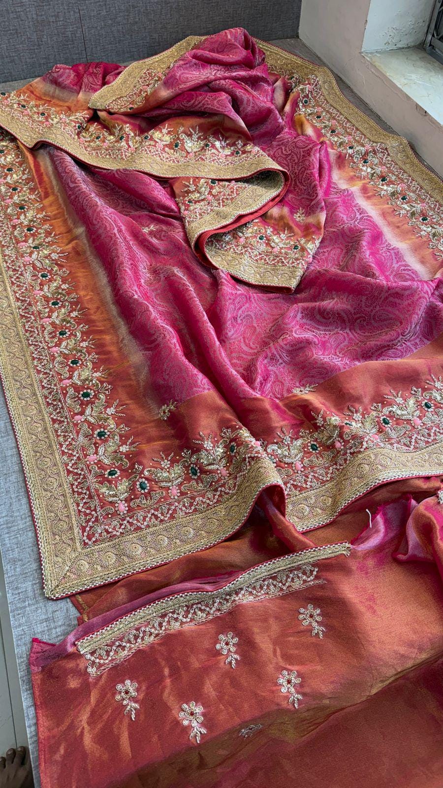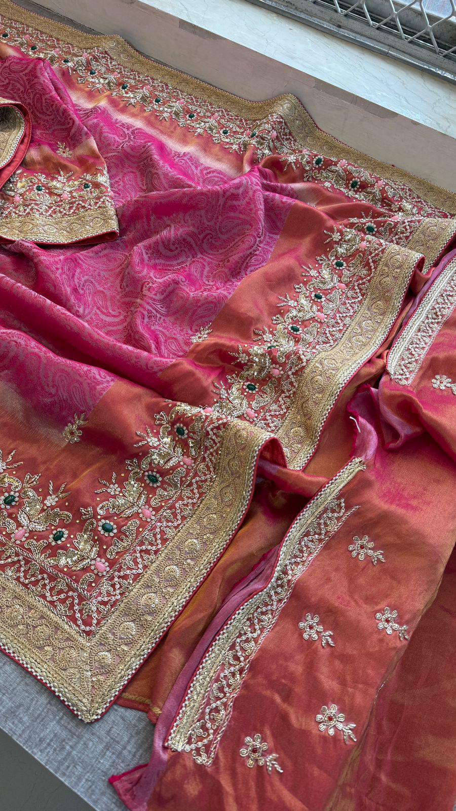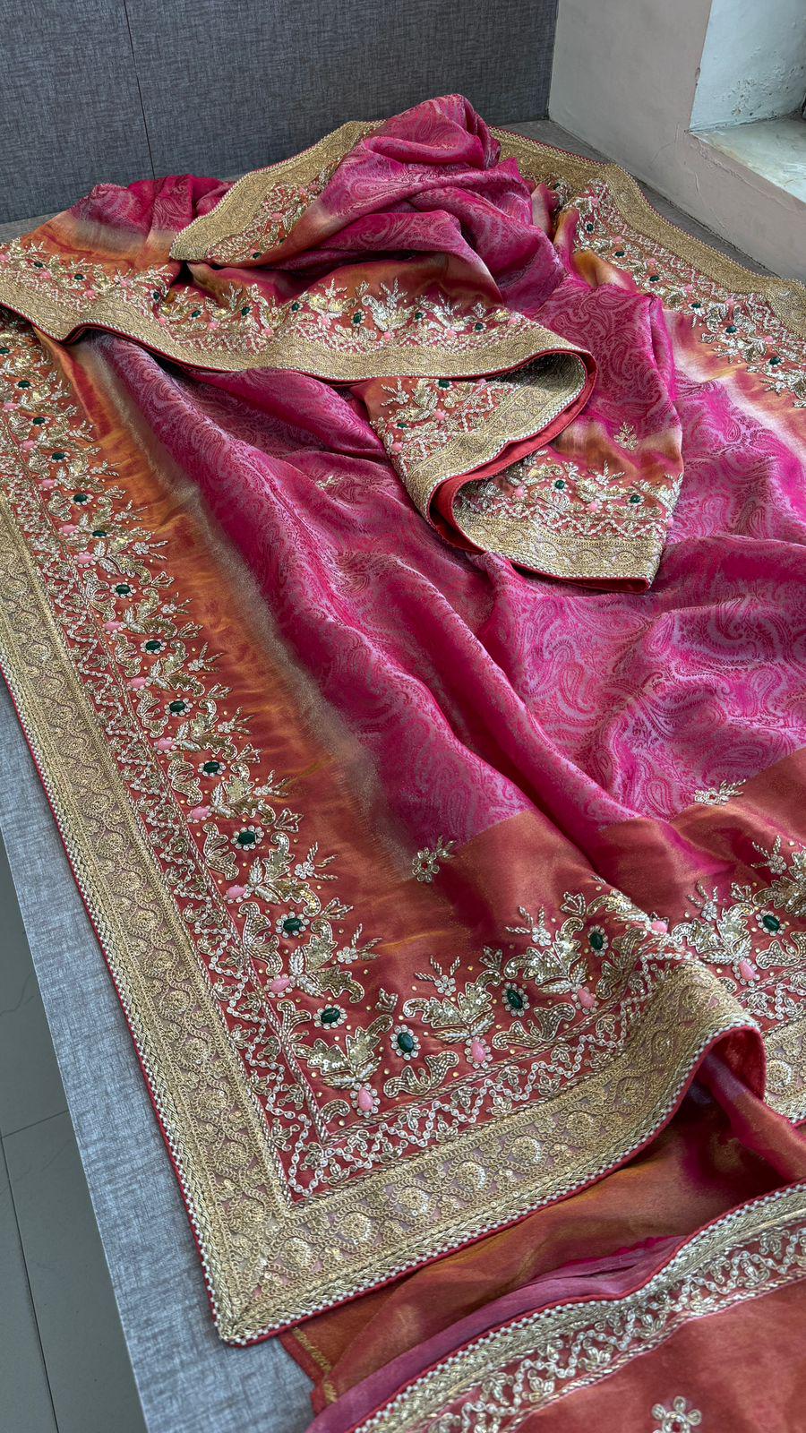 Step into sheer opulence. This breathtaking Pure Cosmo Munga Silk Saree is a masterclass in heavy Indian couture, featuring seven distinct styles of premium hand-embellishments to create a 3D, light-catching masterpiece for weddings and elite festivities.