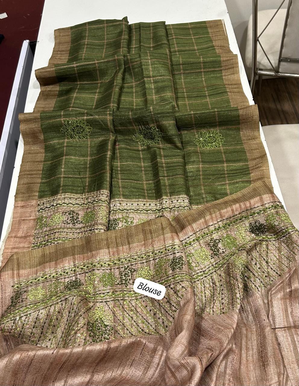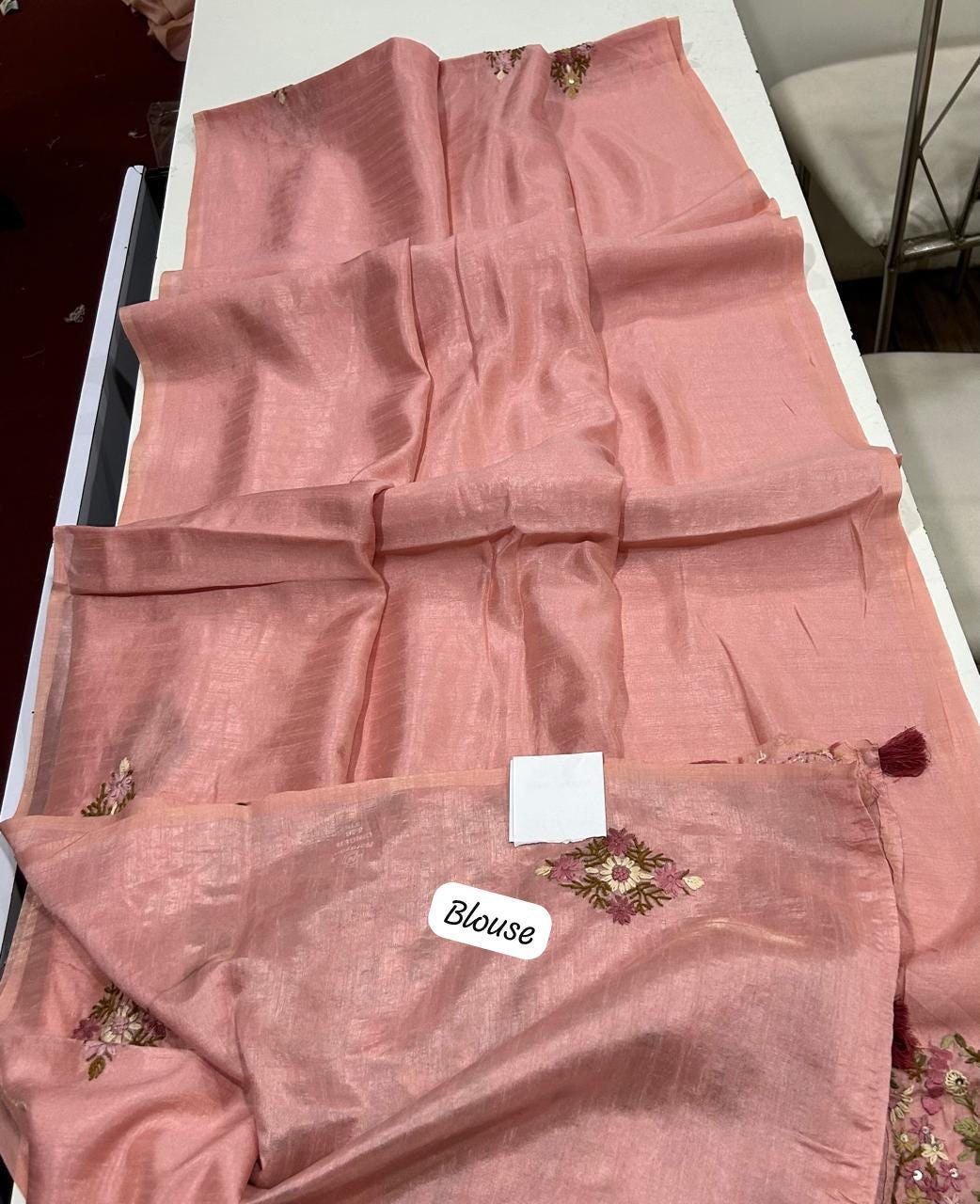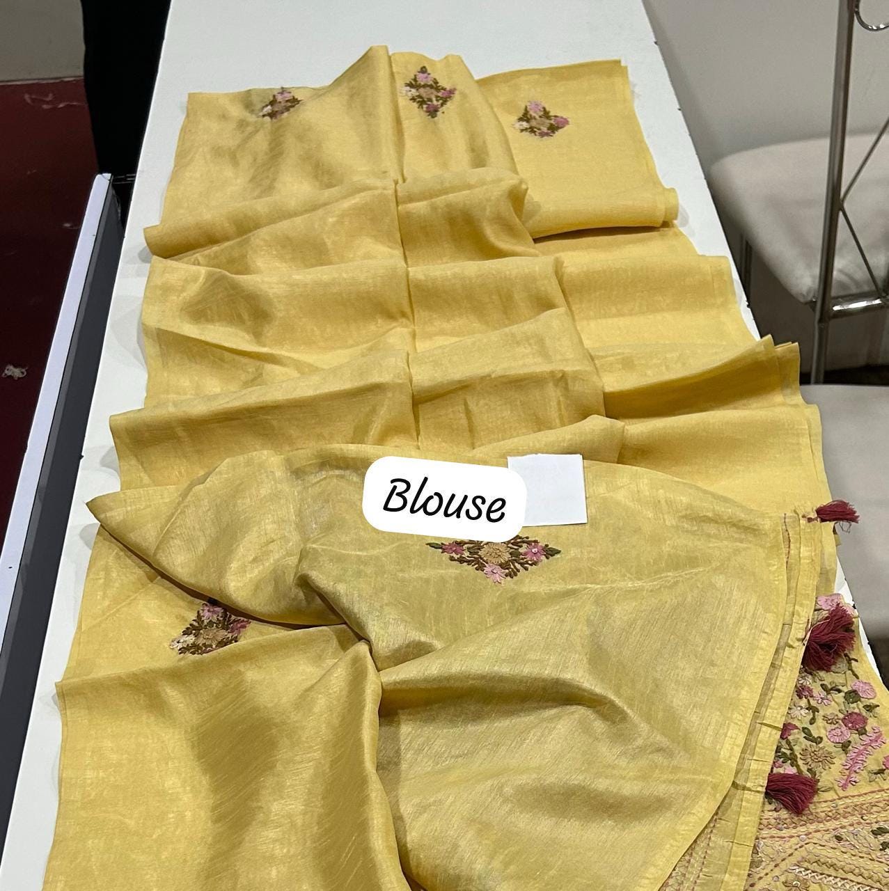 • Customization: We specialize in bespoke 12-point blouse tailoring and custom embroidery at our Delhi studio.