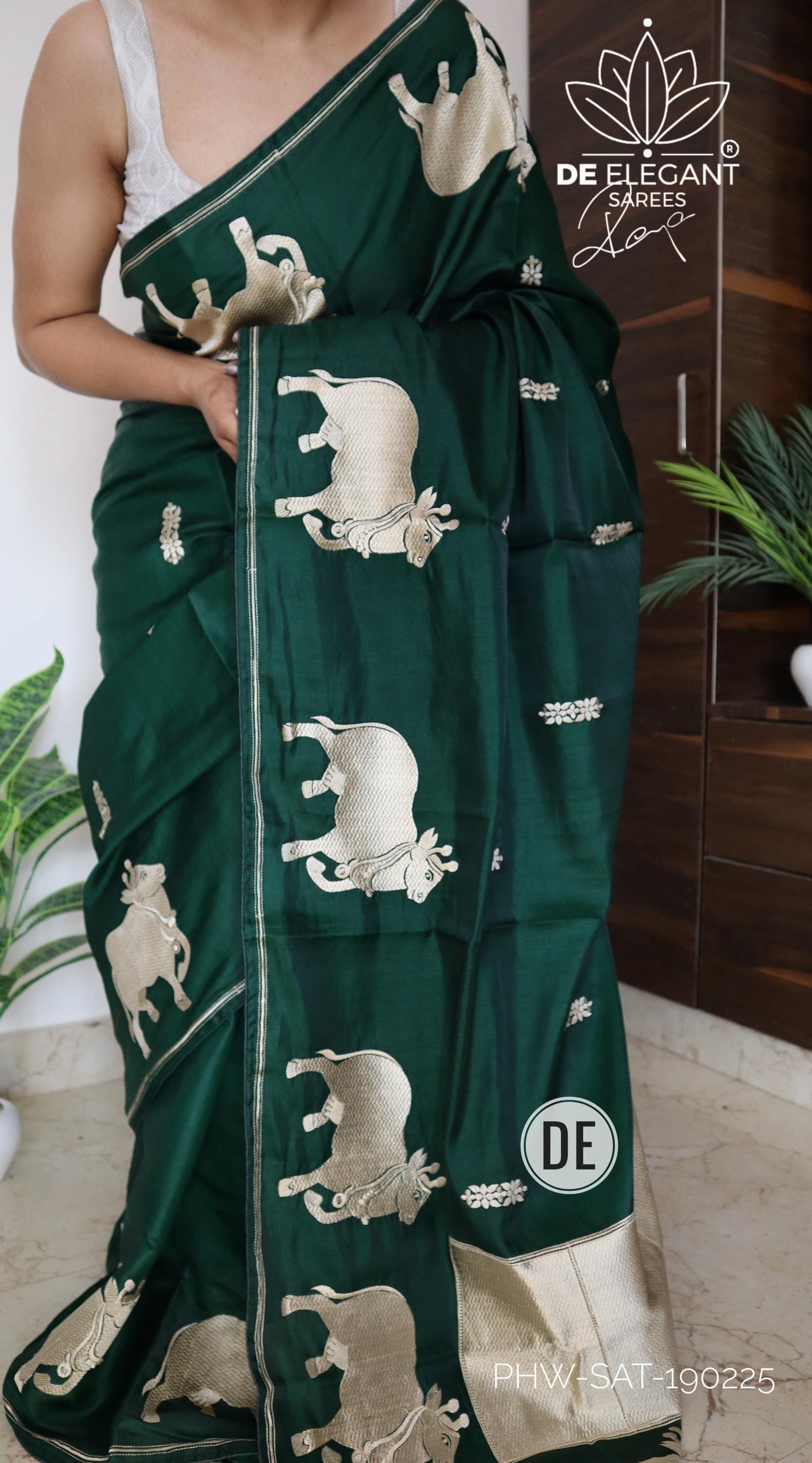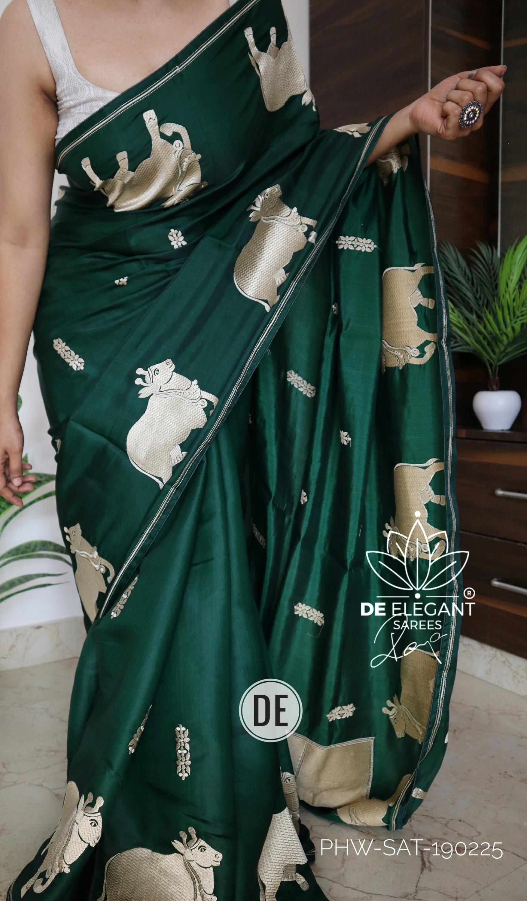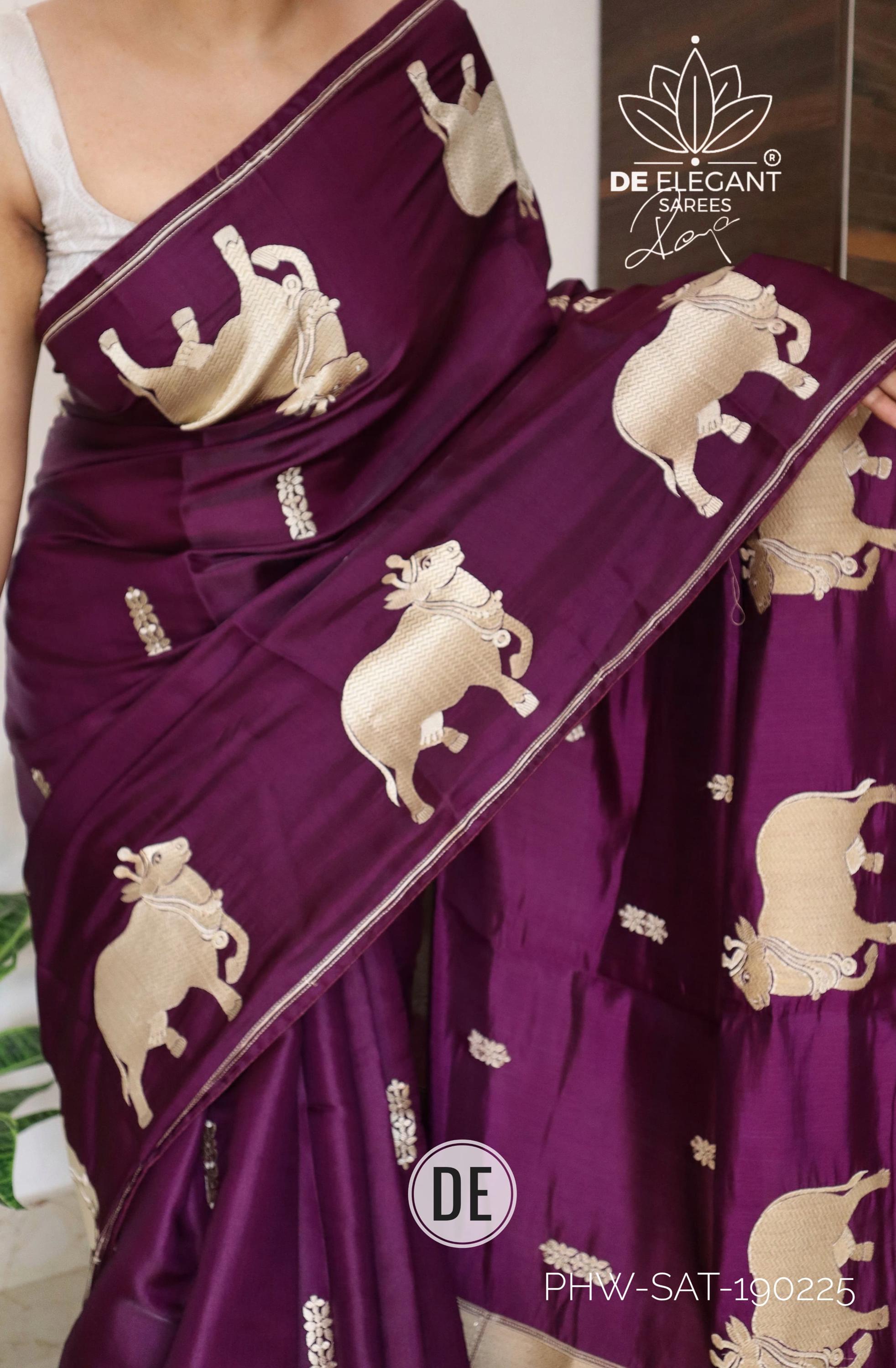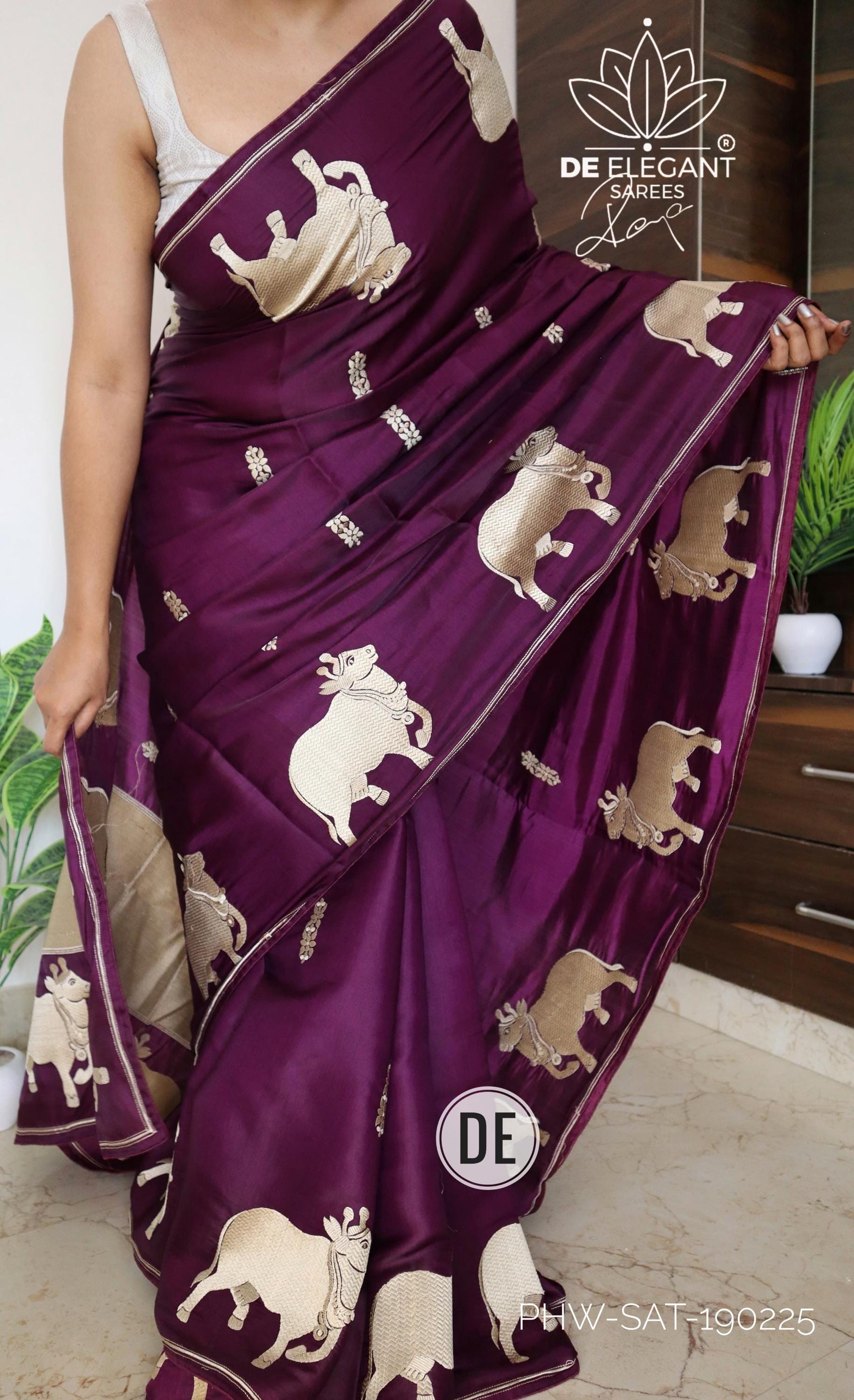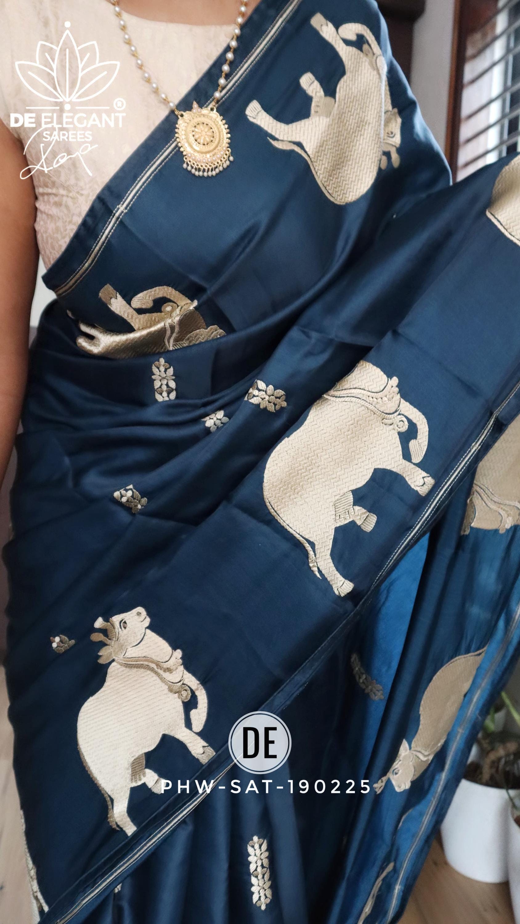 Step into a blend of tradition and glamour with this stunning Munga Satin Saree. Beautifully woven with intricate resham motifs inspired by classic Pichwai art, this saree is a true labor of love for traditional craftsmanship. Available in classic shades, its rich, glamorous drape makes it an unforgettable choice for weddings, cultural festivals, and evening celebrations.