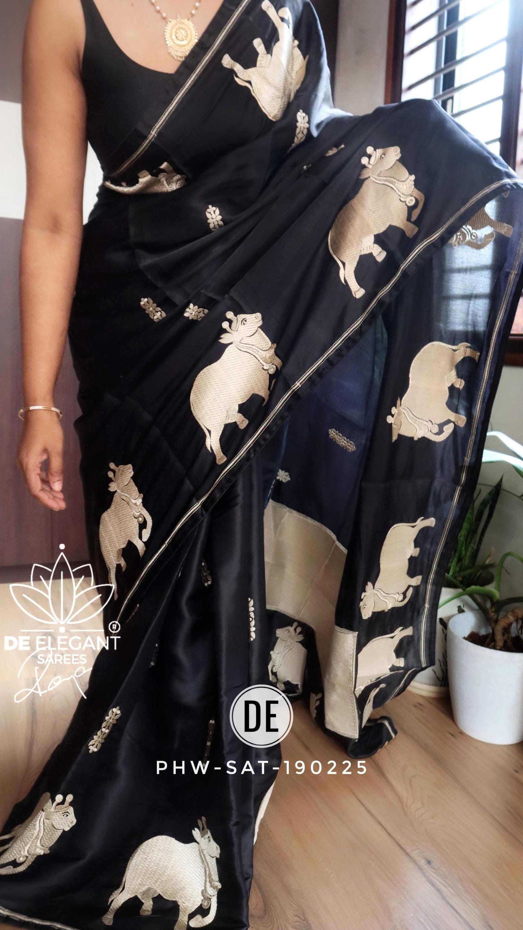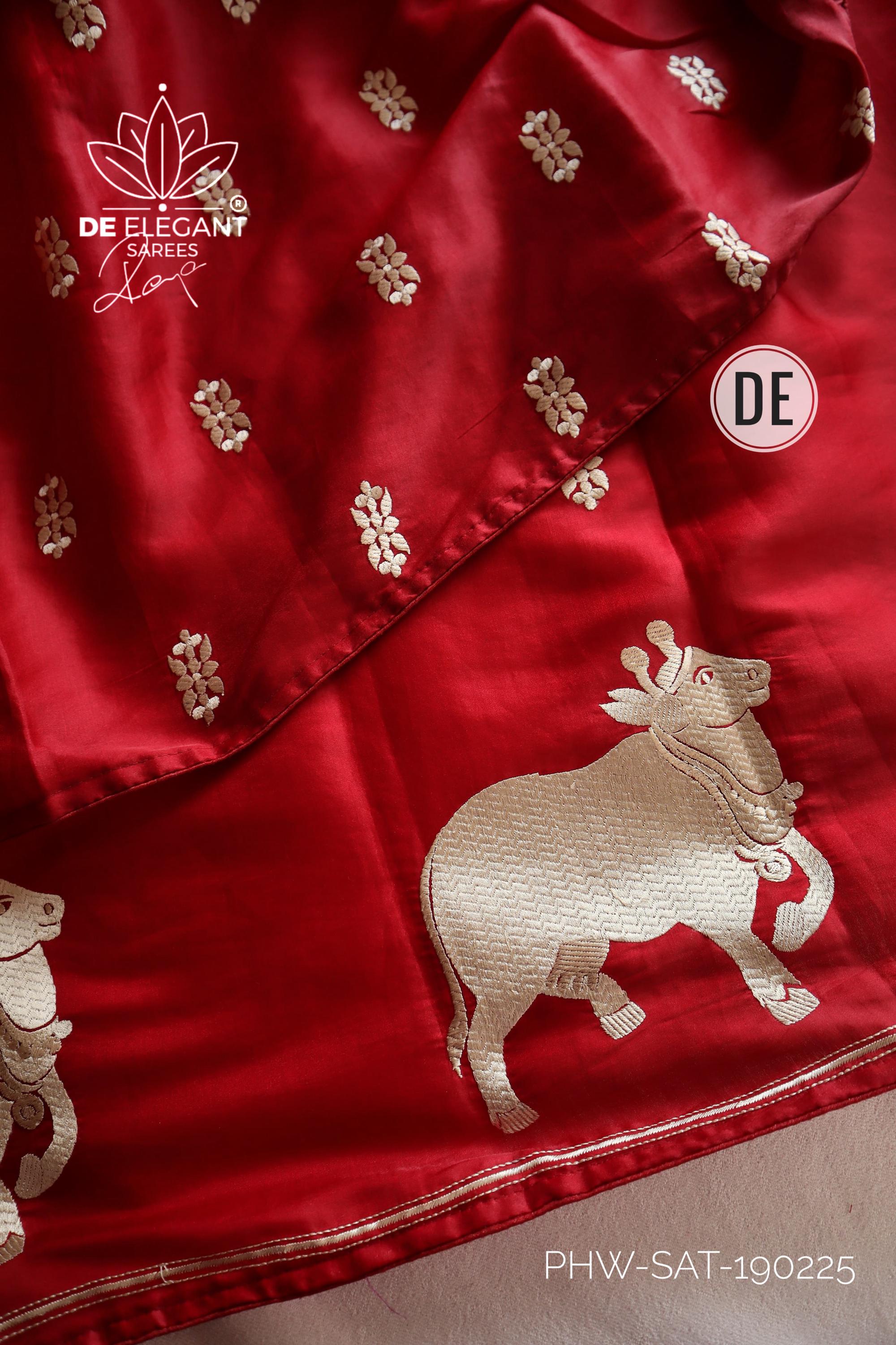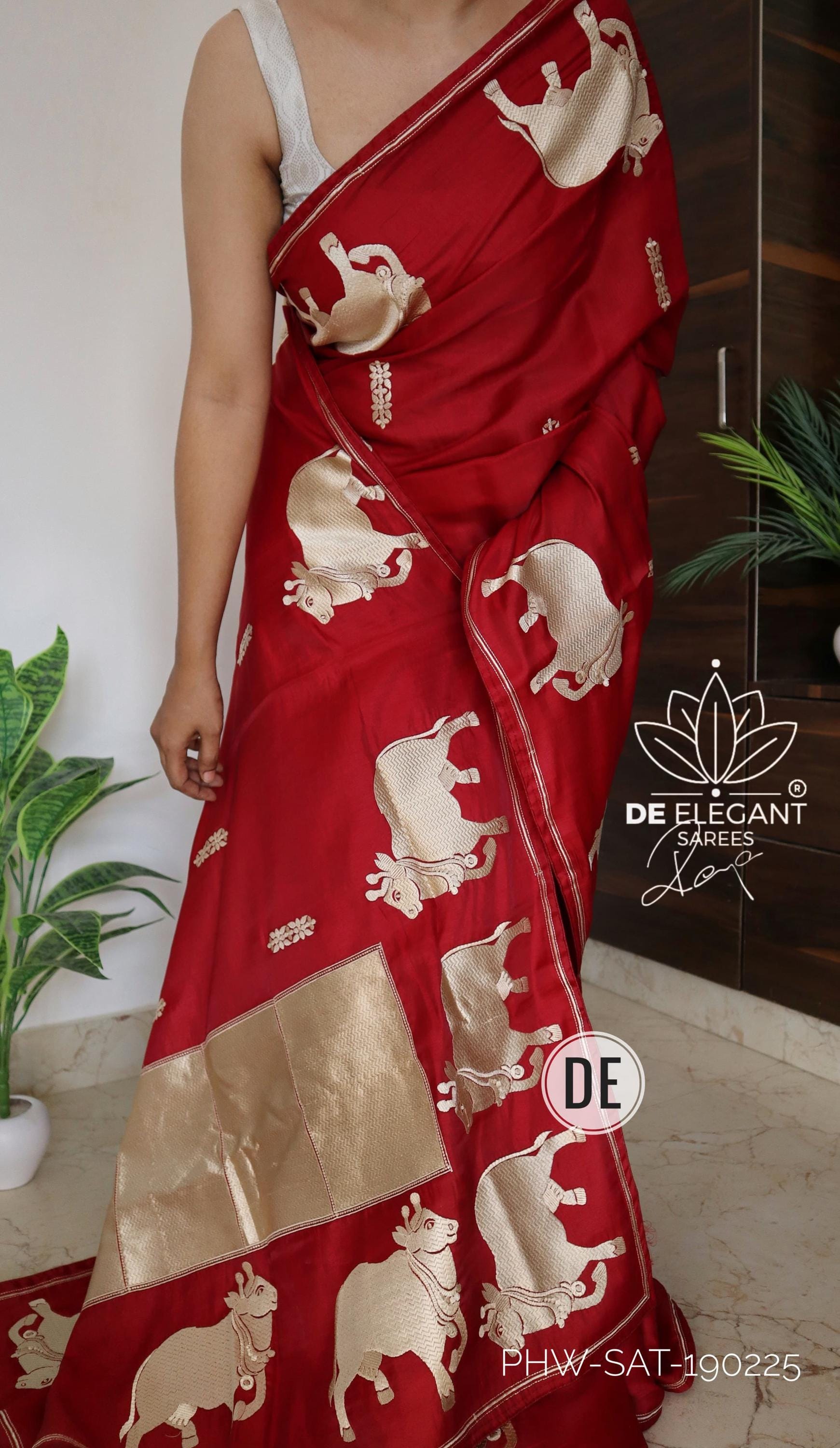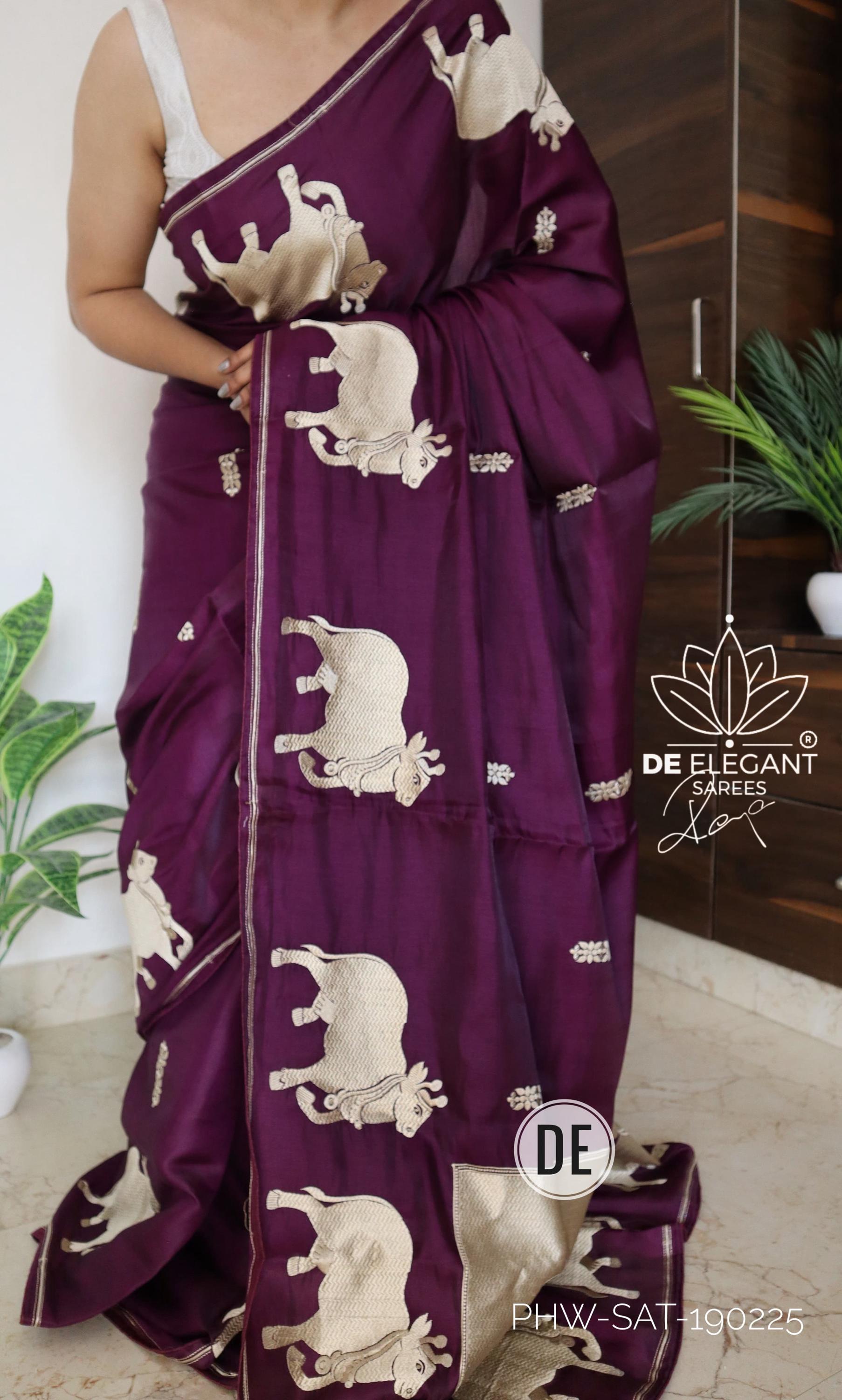Step into a blend of tradition and glamour with this stunning Munga Satin Saree. Beautifully woven with intricate resham motifs inspired by classic Pichwai art, this saree is a true labor of love for traditional craftsmanship. Available in classic shades, its rich, glamorous drape makes it an unforgettable choice for weddings, cultural festivals, and evening celebrations.