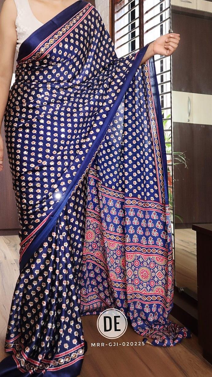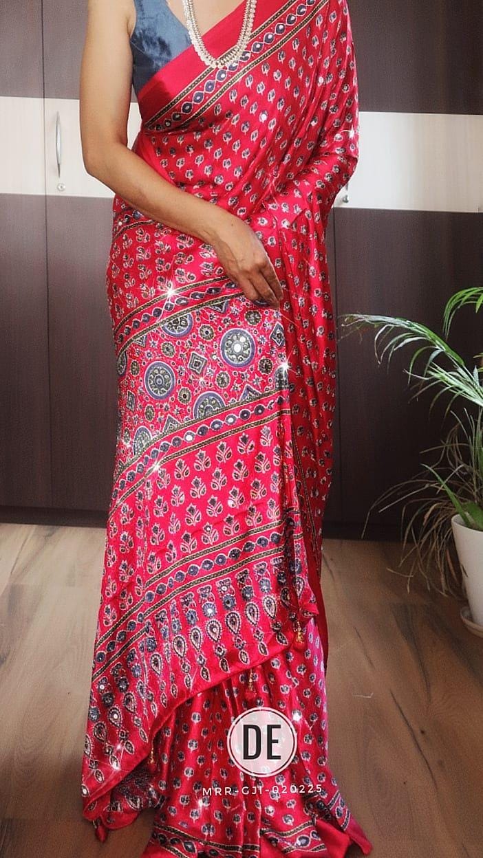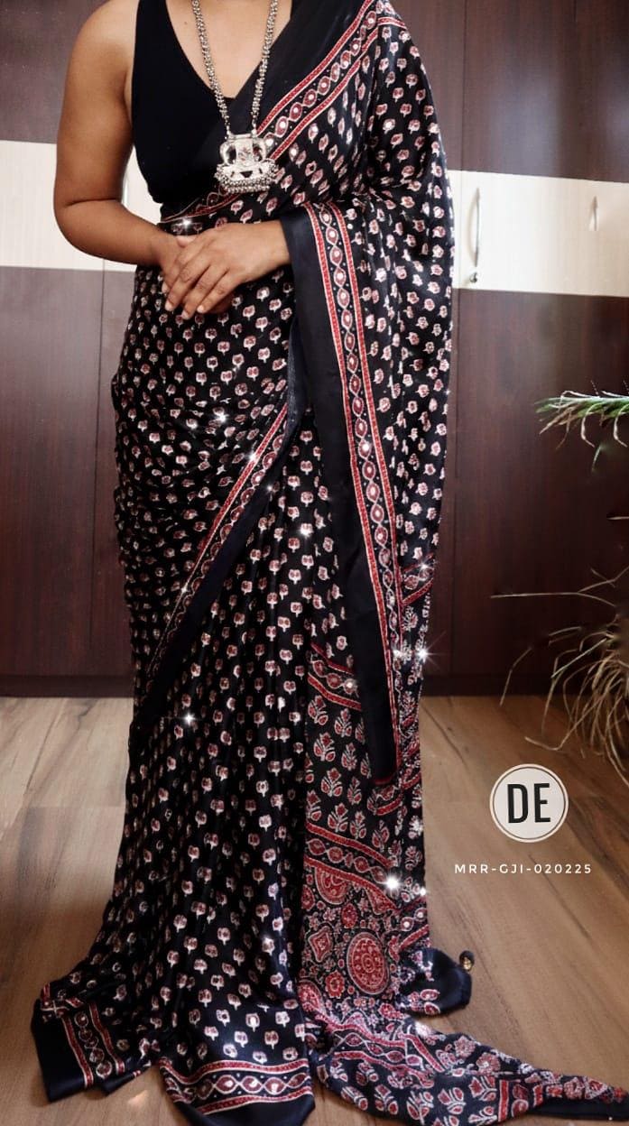 Step into elegance and tradition with this Modal Silk Saree, a perfect fusion of comfort, style, and heritage artistry. Handcrafted with authentic Ajrakh hand block prints and adorned with original mirror work, this saree showcases the beauty of Indian craftsmanship in every thread.