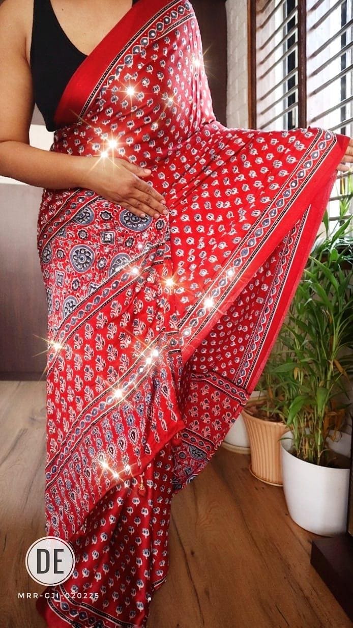 Handcrafted Ajrakh prints ensure each saree is unique and one-of-a-kind