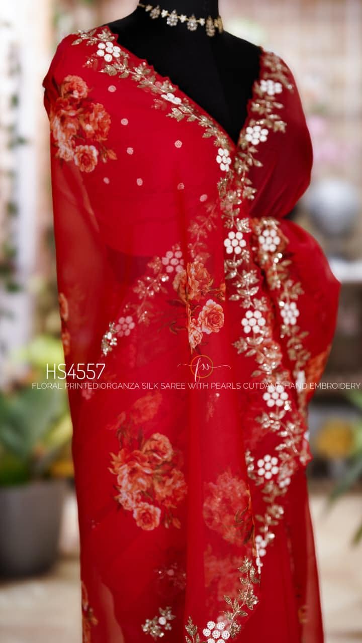 Crafted from premium organza silk, this saree is lightweight, sheer, and beautifully flowy, giving you a soft, airy drape that enhances your silhouette. The detailed floral design adds a romantic feel, while the subtle embroidery work brings just the right amount of festive sparkle—making it ideal for weddings, parties, receptions, and special occasions.