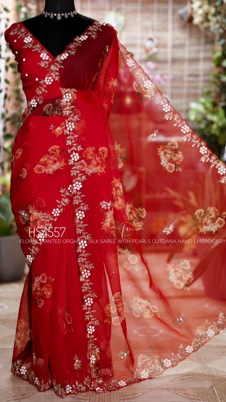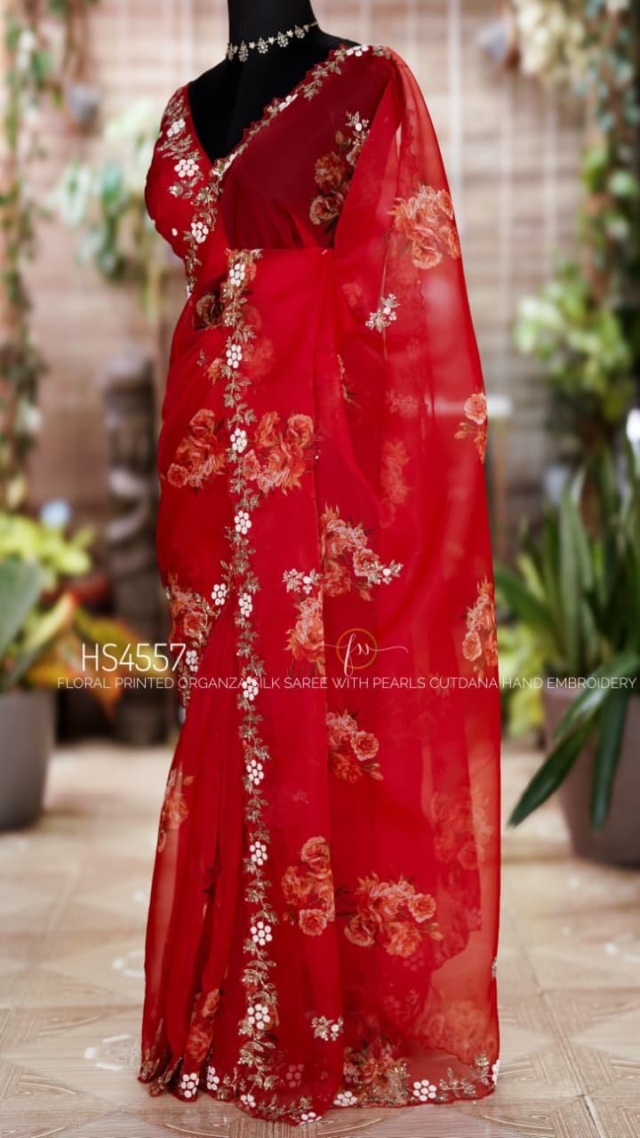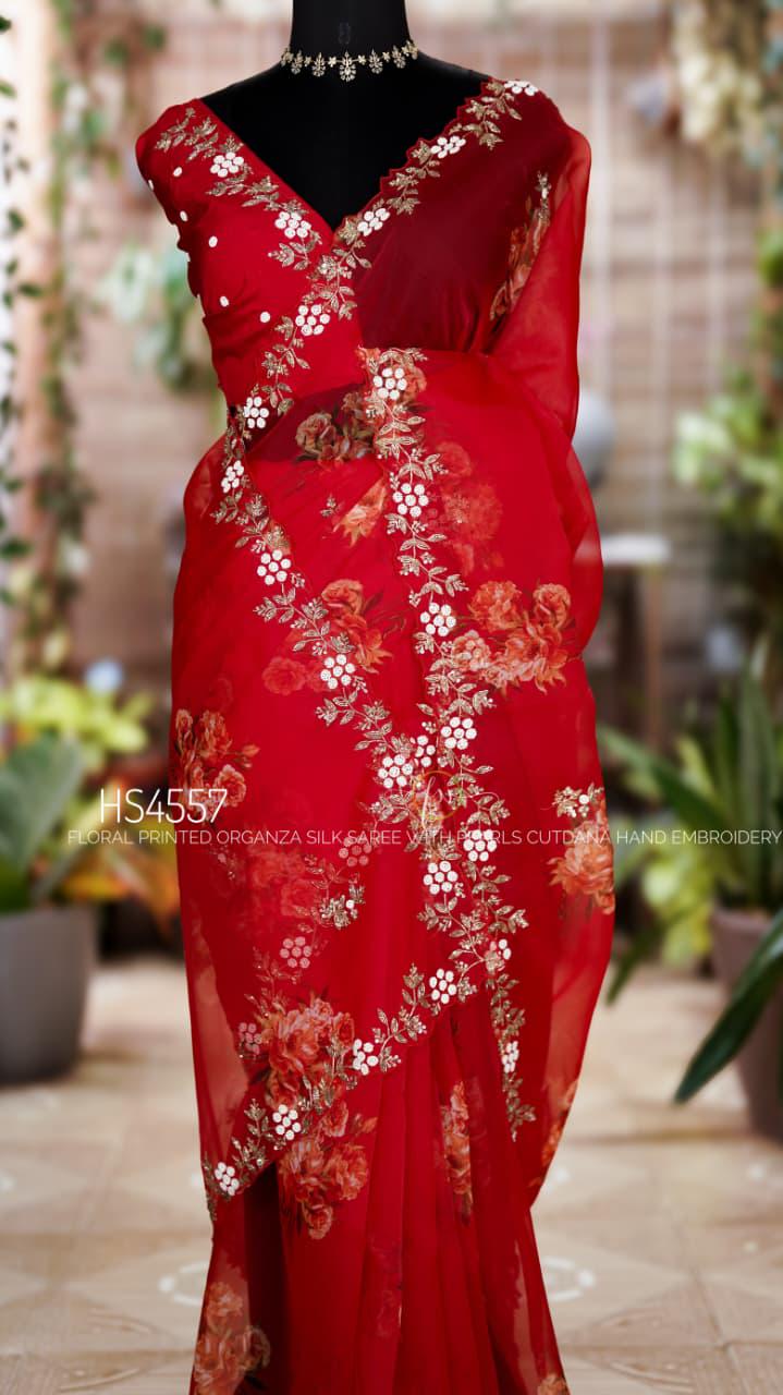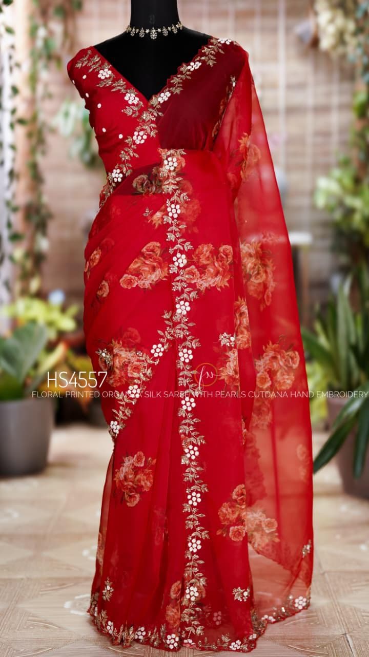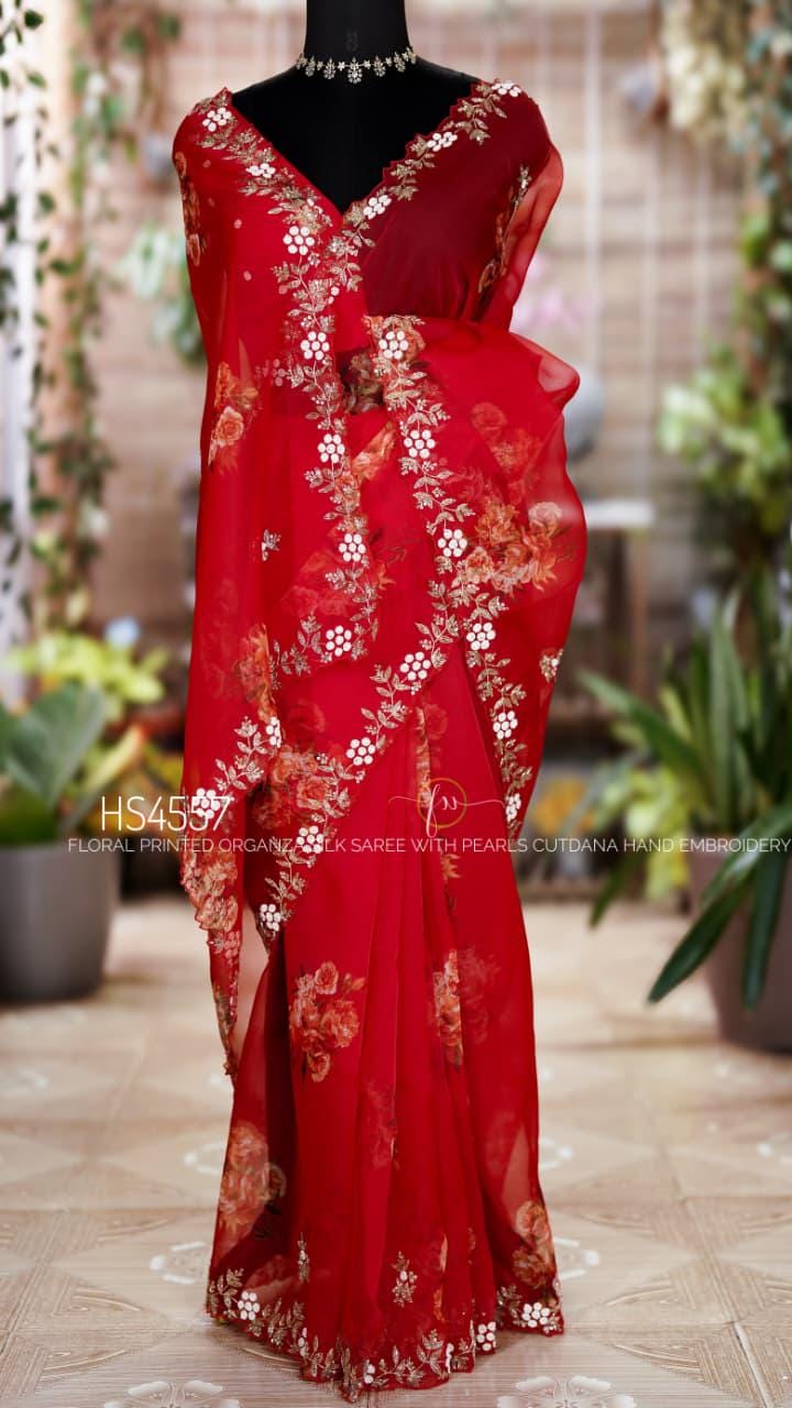 Add this stunning red organza saree to your collection and bring effortless elegance to every special moment.
