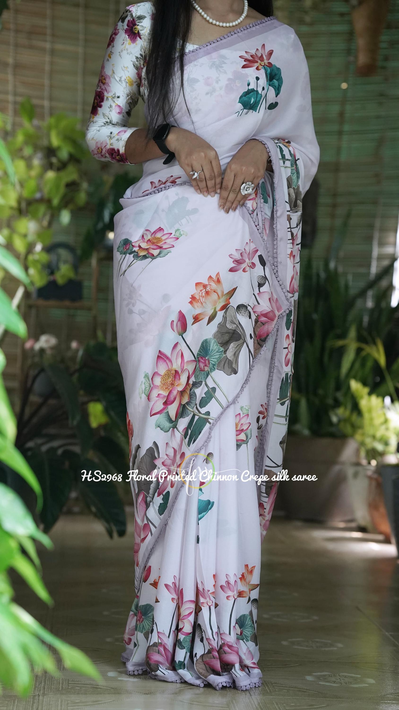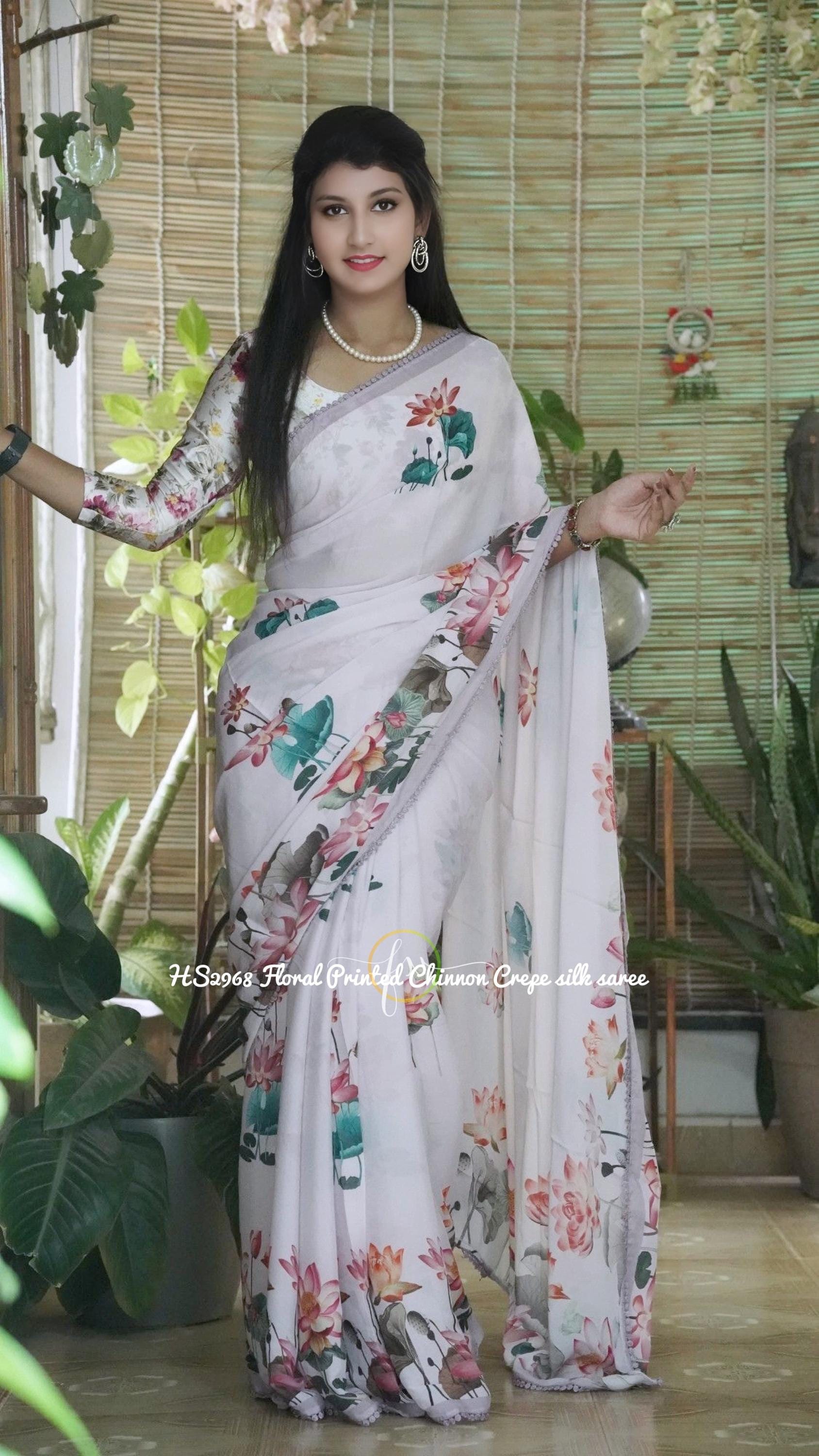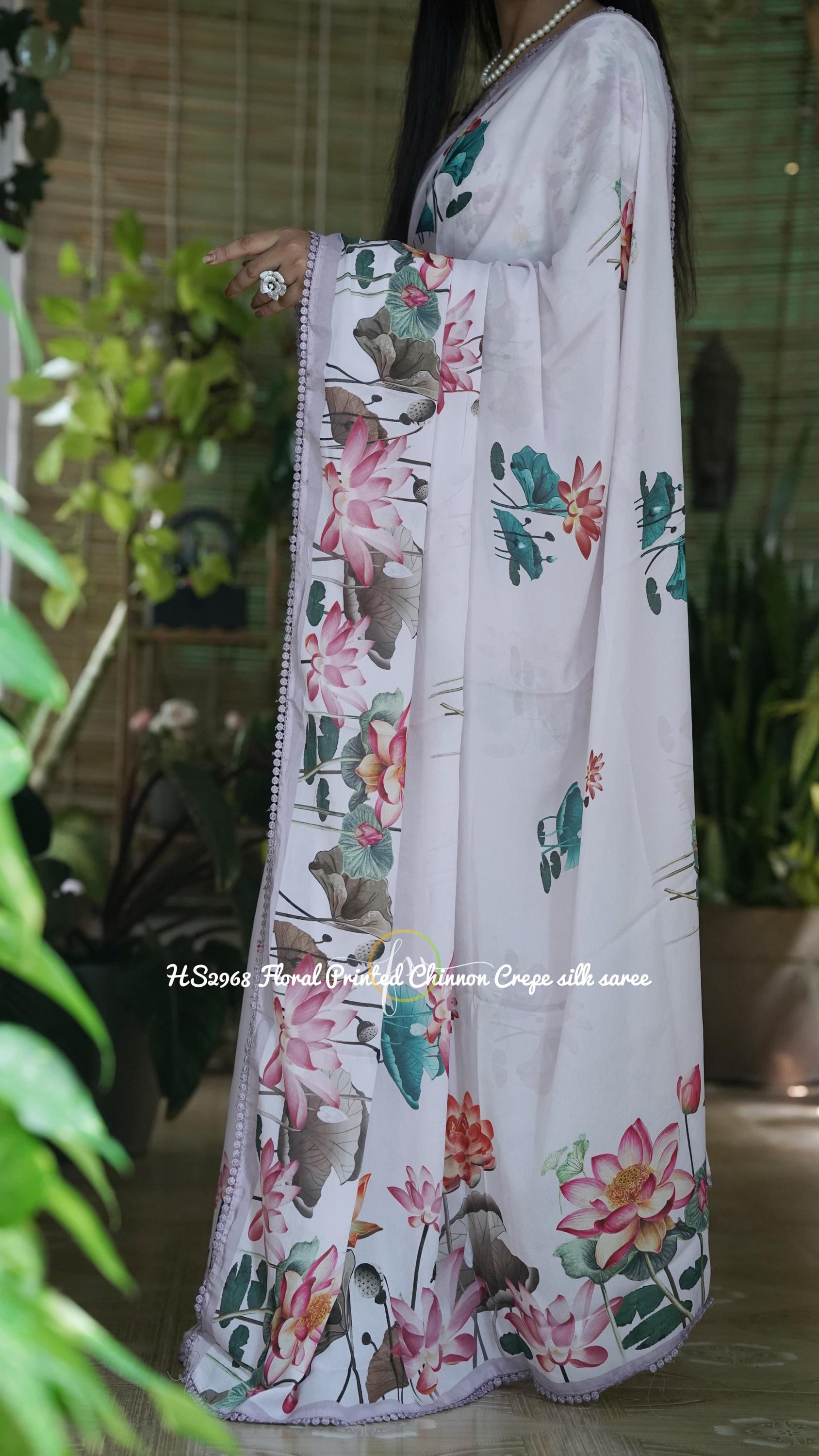Embrace effortless elegance with this stunning Floral Printed Chinon Crepe Silk Saree. Set against a pristine white base, the vibrant and oversized lotus floral prints bring a fresh, contemporary romance to this beautiful drape. Finished with a delicate, intricately beaded scalloped border, this lightweight saree is the ultimate choice for summer weddings, garden parties, and festive brunches where you want to look chic and feel incredibly comfortable.