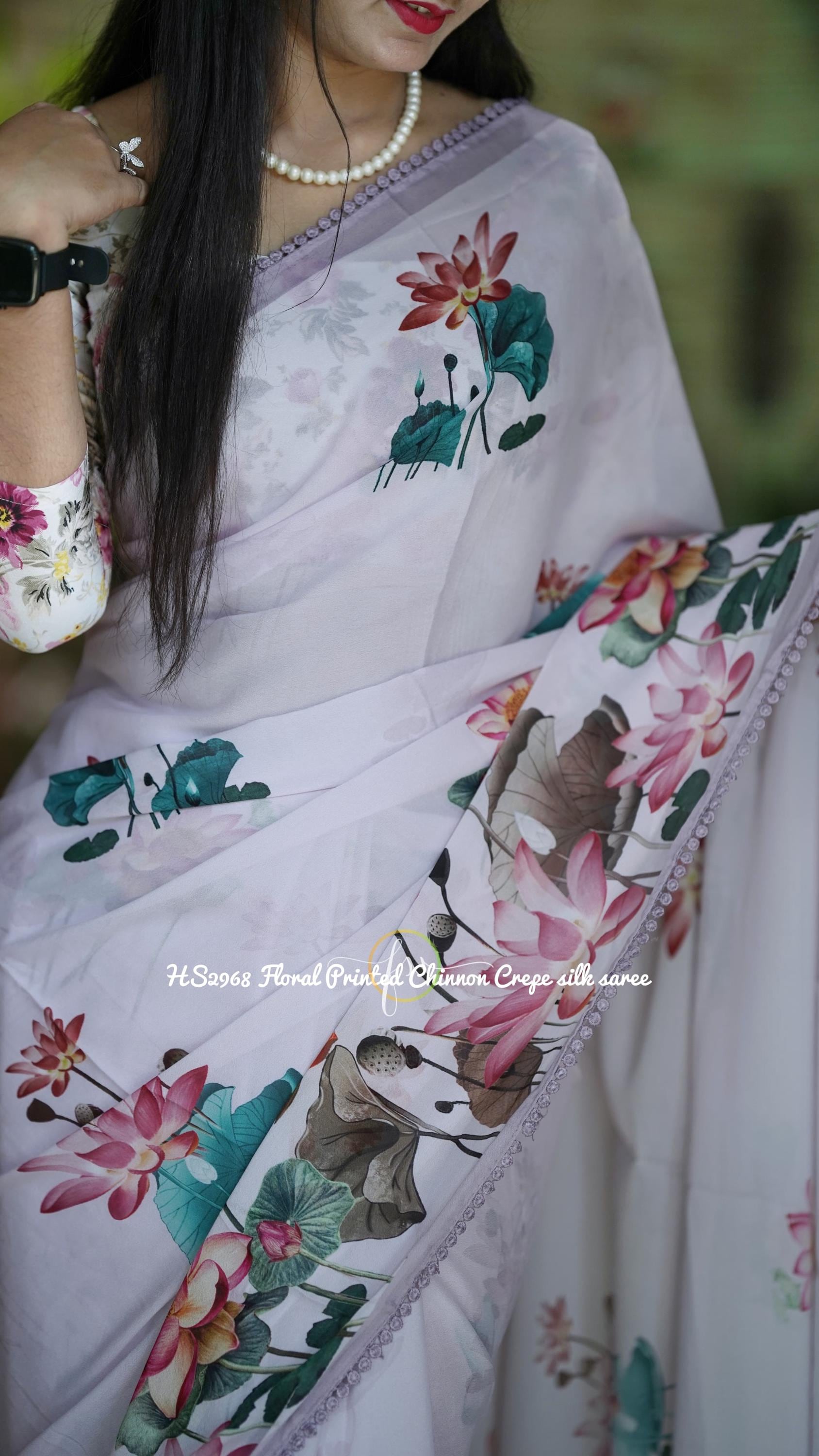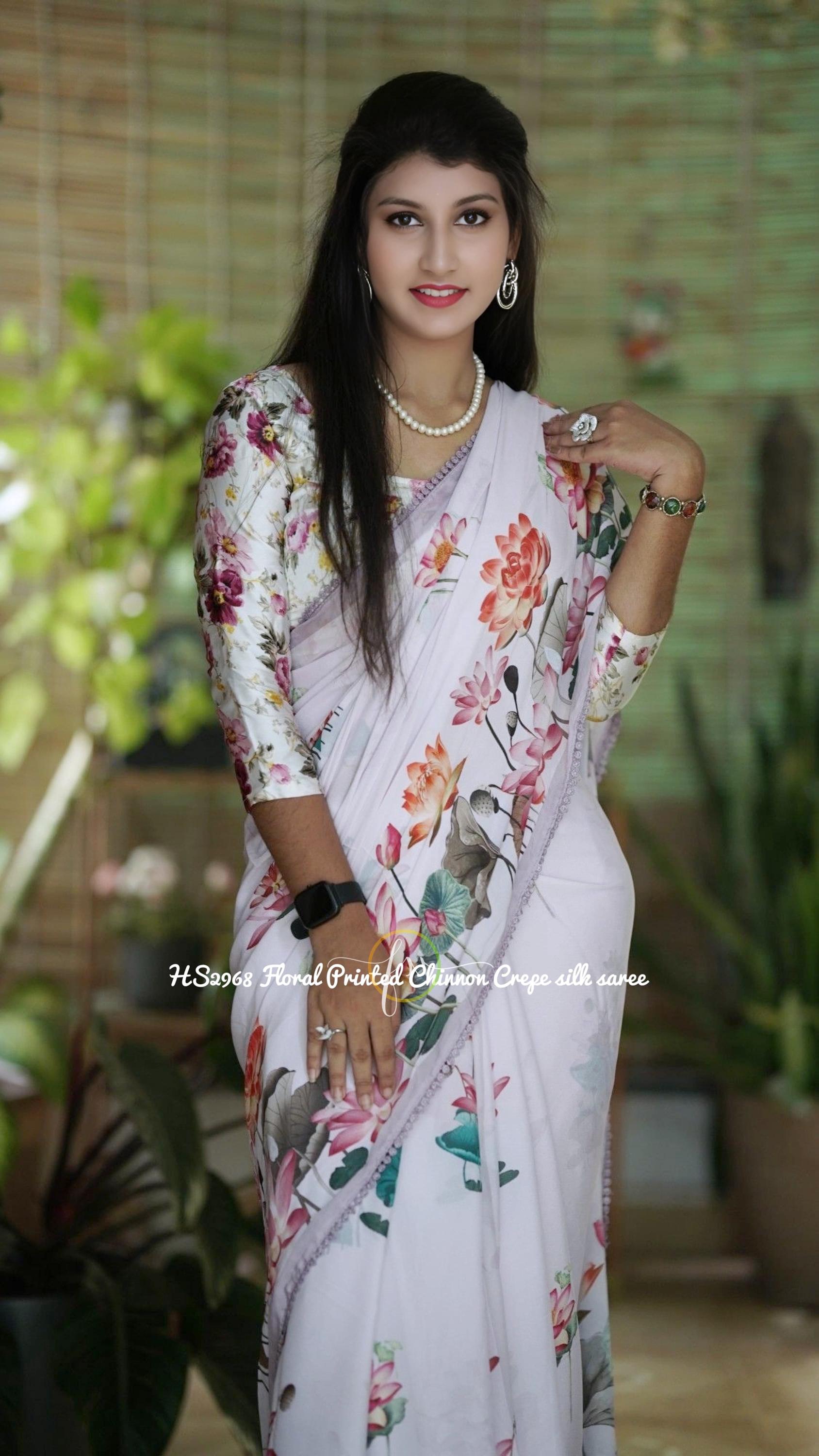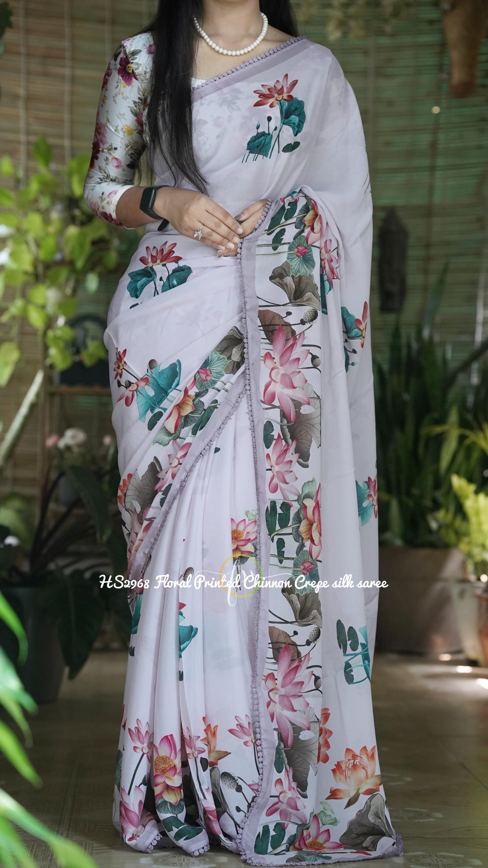 Embrace effortless elegance with this stunning Floral Printed Chinon Crepe Silk Saree. Set against a pristine white base, the vibrant and oversized lotus floral prints bring a fresh, contemporary romance to this beautiful drape. Finished with a delicate, intricately beaded scalloped border, this lightweight saree is the ultimate choice for summer weddings, garden parties, and festive brunches where you want to look chic and feel incredibly comfortable.