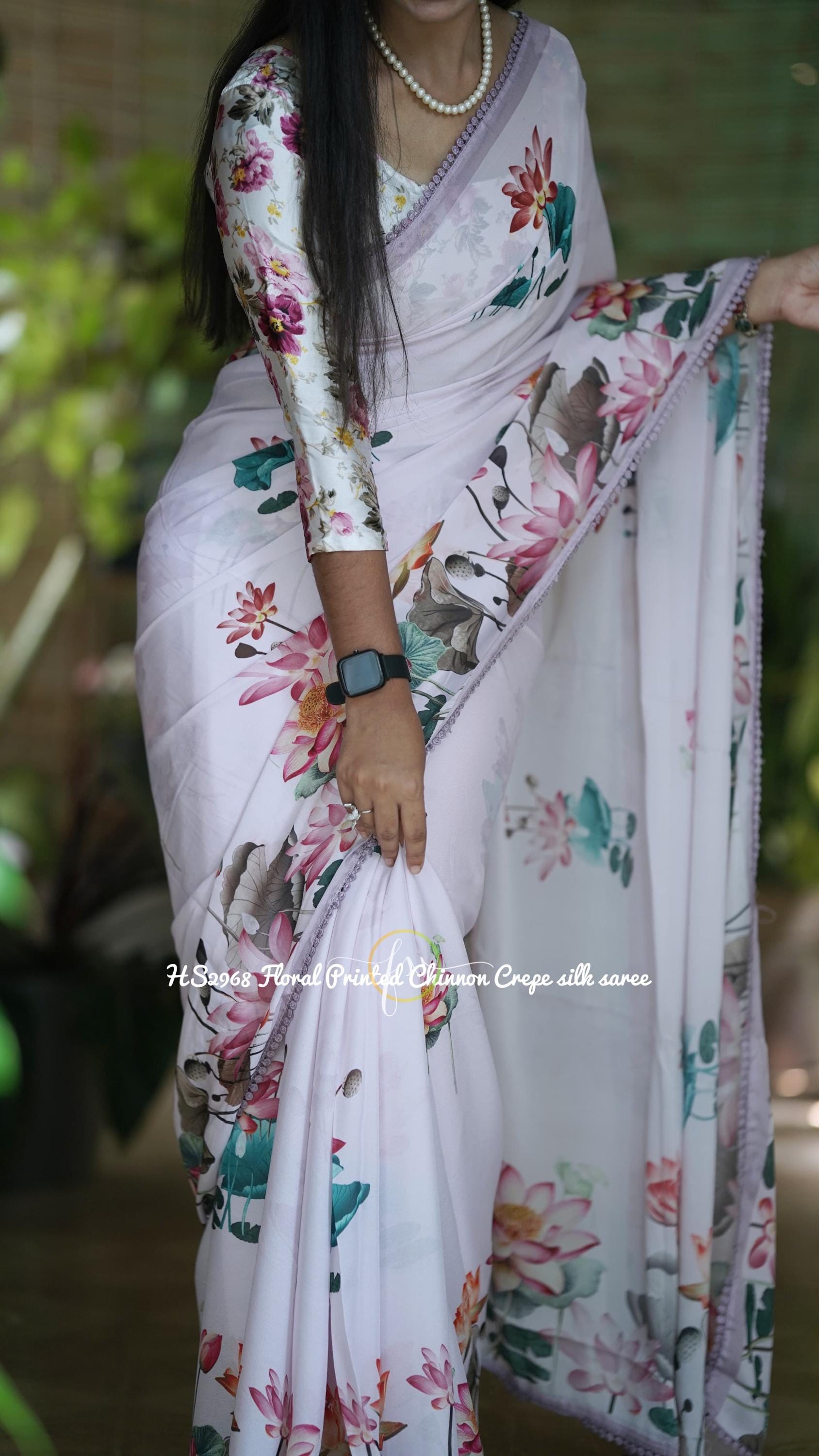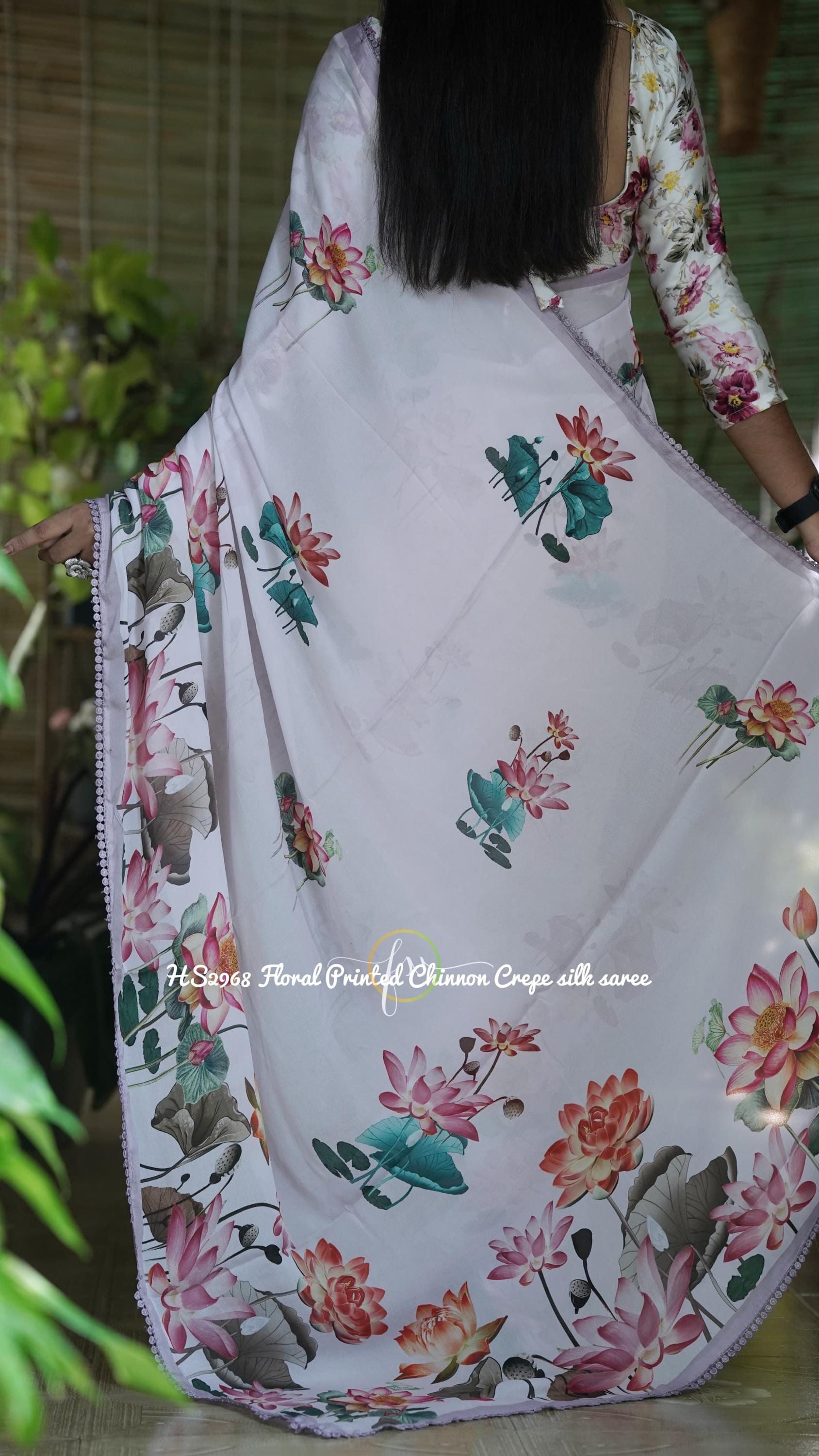 Add this White Lotus Chinon Crepe Silk Saree to your wardrobe and enjoy the perfect combination of summer elegance, boho charm, and traditional Indian style.