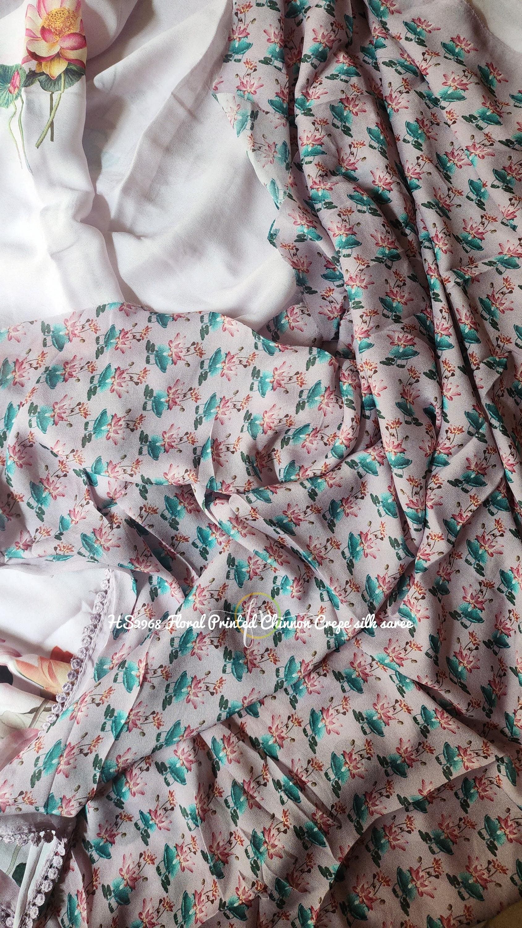 Step into effortless elegance with this White Lotus Print Chinon Crepe Silk Saree, designed for women who love light, airy, and stylish ethnic wear. The delicate lotus floral print in subtle white and pastel tones brings a fresh, serene vibe, making it perfect for summer weddings, garden parties, festive occasions, or boho-inspired events.
