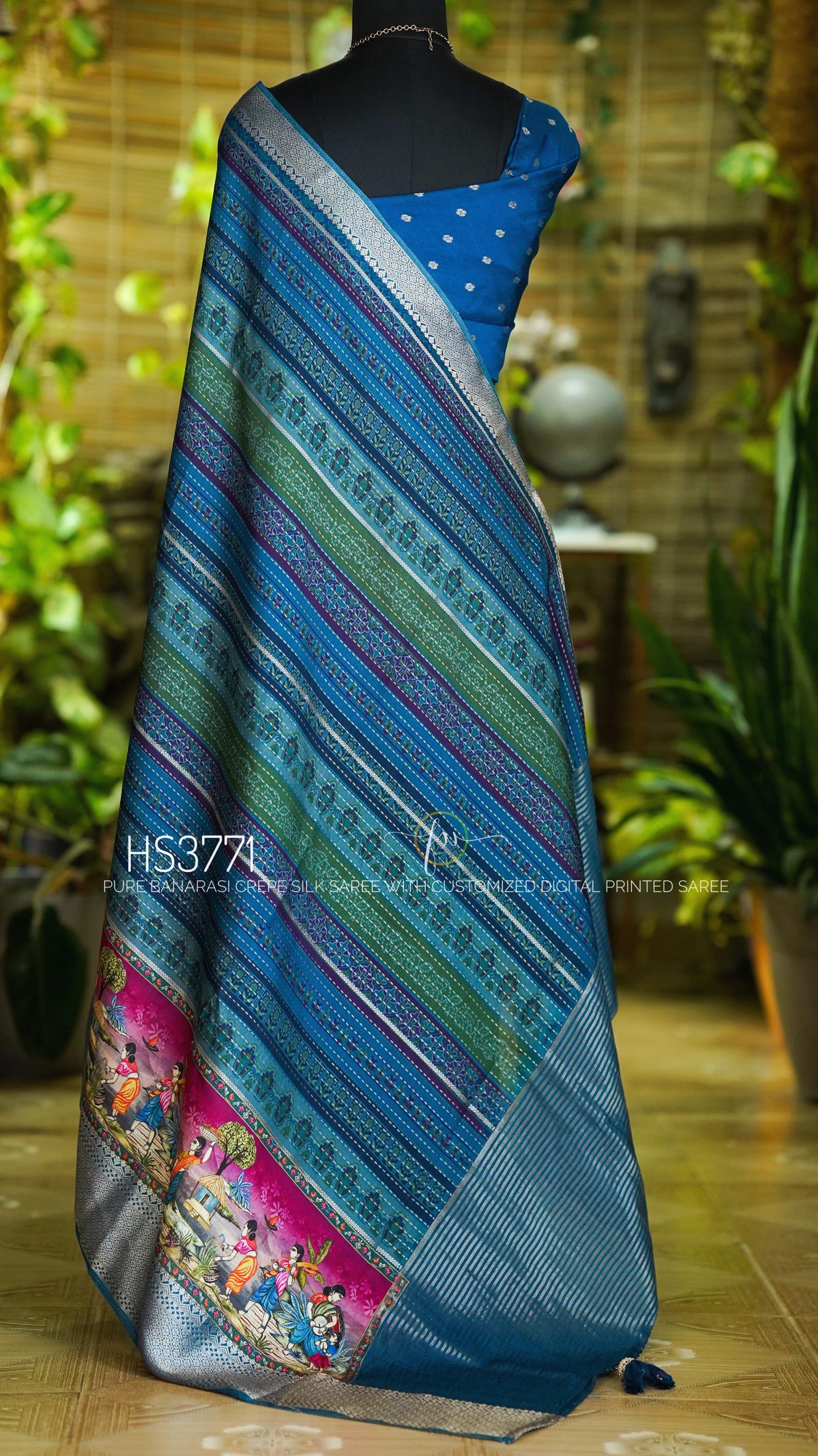 Experience the perfect blend of tradition and contemporary artistry with this Pure Banarasi Crepe Silk Saree, featuring a custom digital print inspired by classic Indian motifs and delicate silver zari work. This saree brings a modern twist to timeless Banarasi elegance, making it ideal for weddings, festive celebrations, and special occasions where you want to stand out.