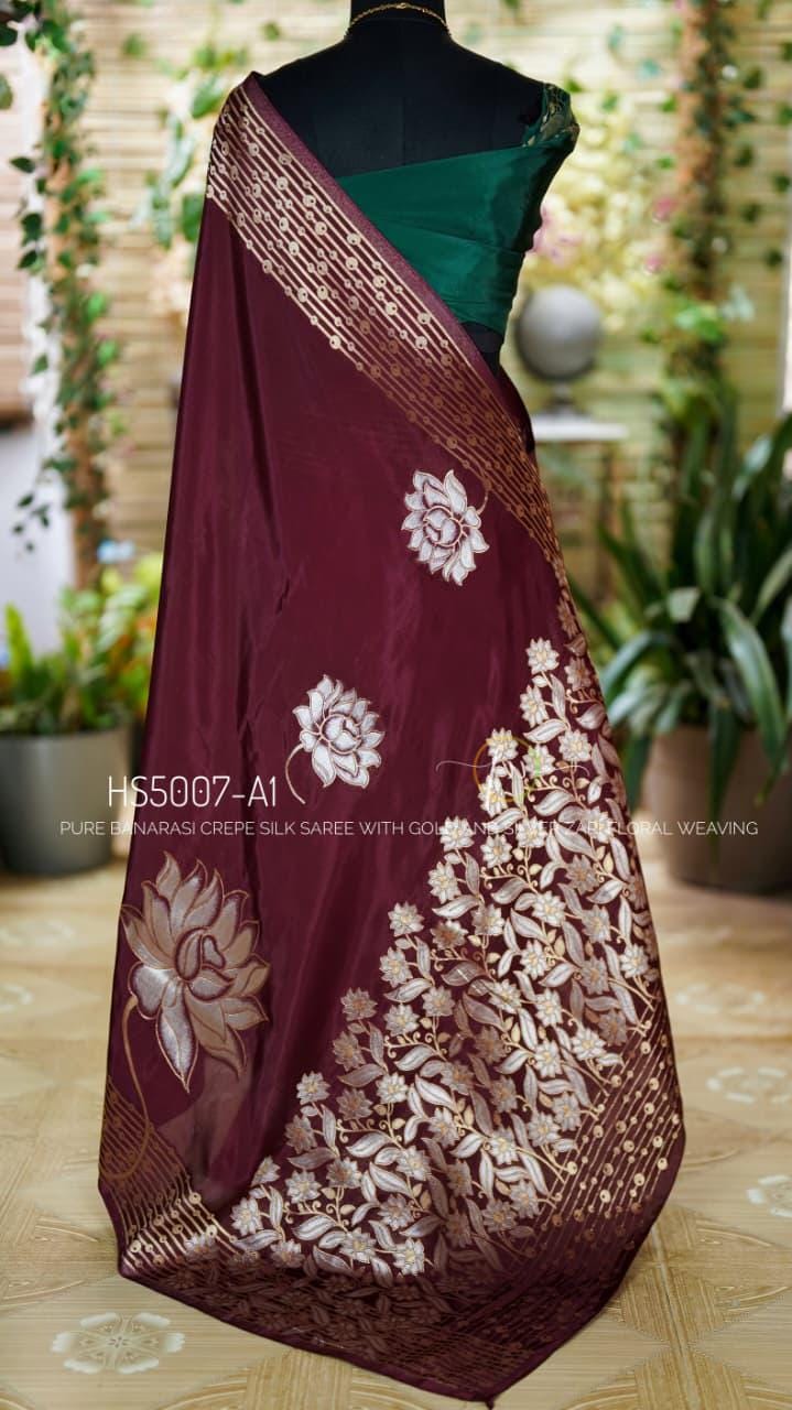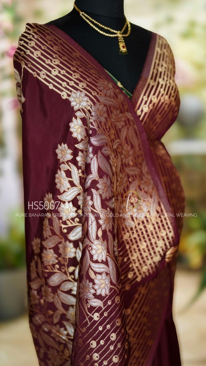 Step into elegance with this breathtaking Pure Banarasi Crepe Silk Saree. This luxurious piece features a deep, rich wine/maroon base adorned with exquisite dual-tone gold and silver zari (Sona Rupa) floral weaving. The striking geometric and floral zari motifs on the border and pallu bring a touch of royal grandeur, while the pure crepe silk ensures a modern, lightweight, and flawless drape. Perfect for weddings, receptions, and elegant evening galas.