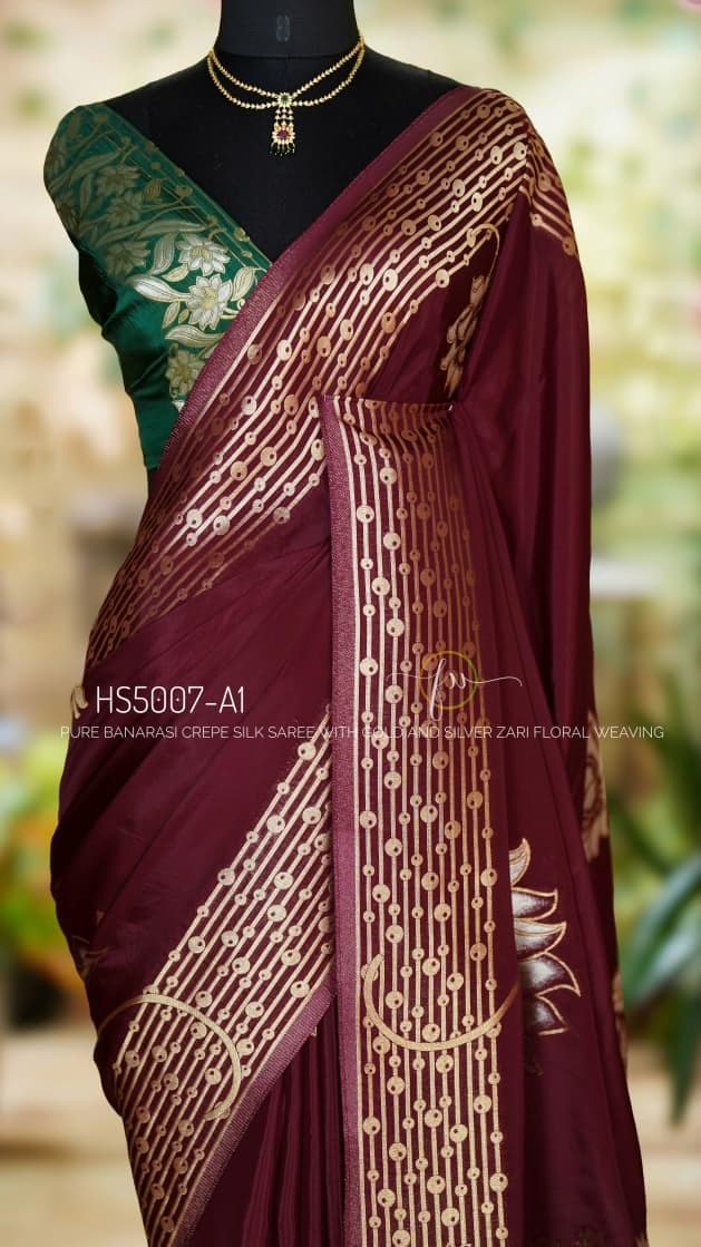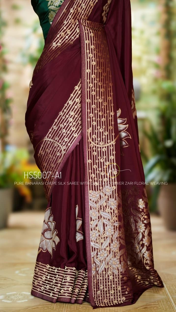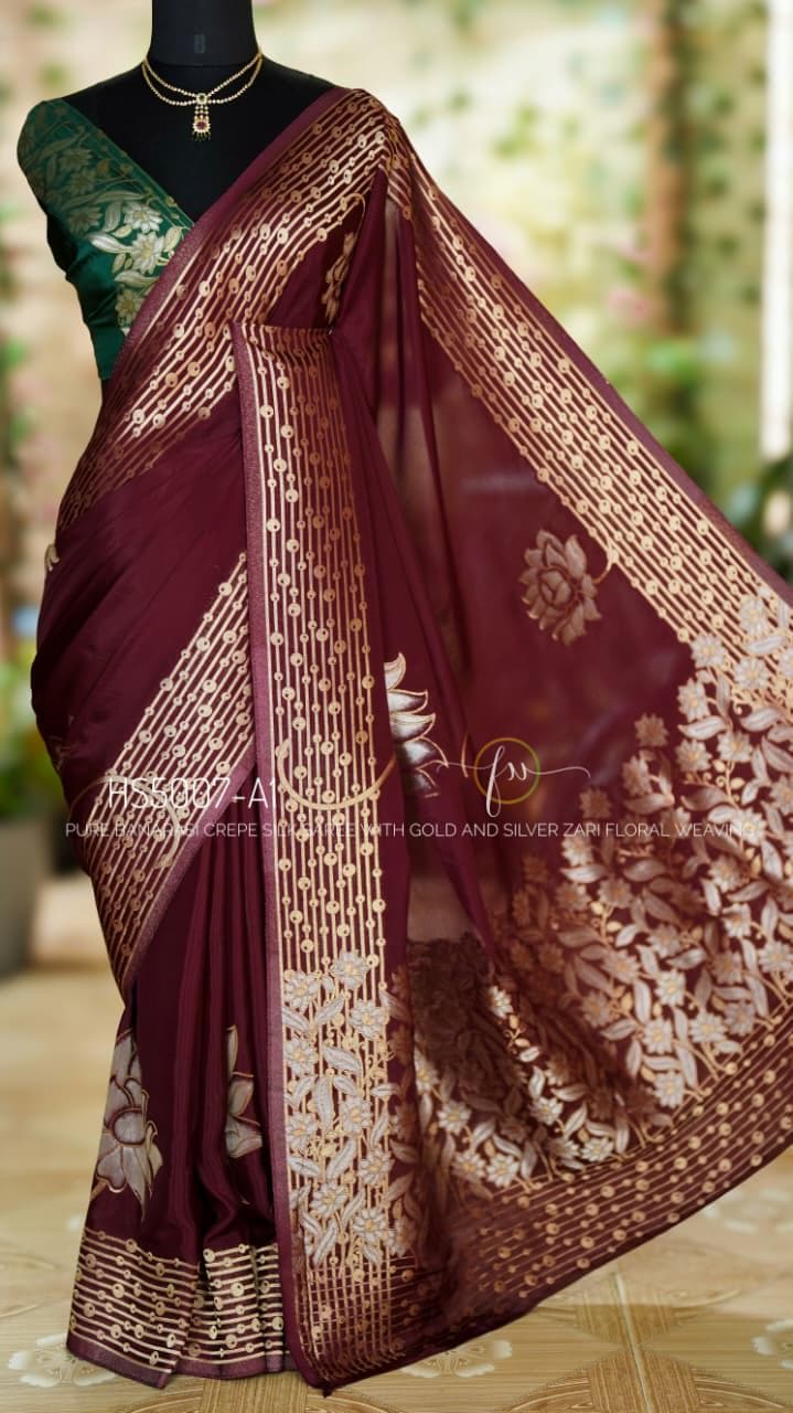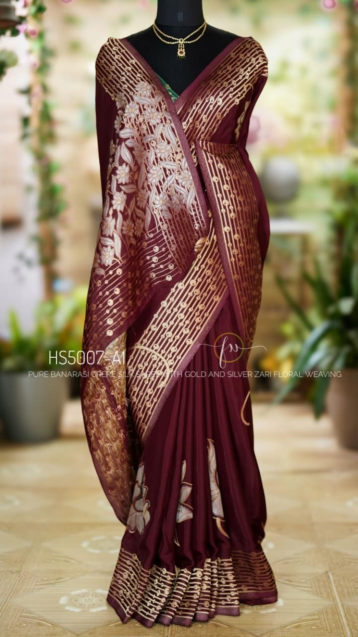 Add this wine Banarasi crepe silk saree to your ethnic collection for a timeless combination of luxury, tradition, and style that will make you stand out at any occasion.